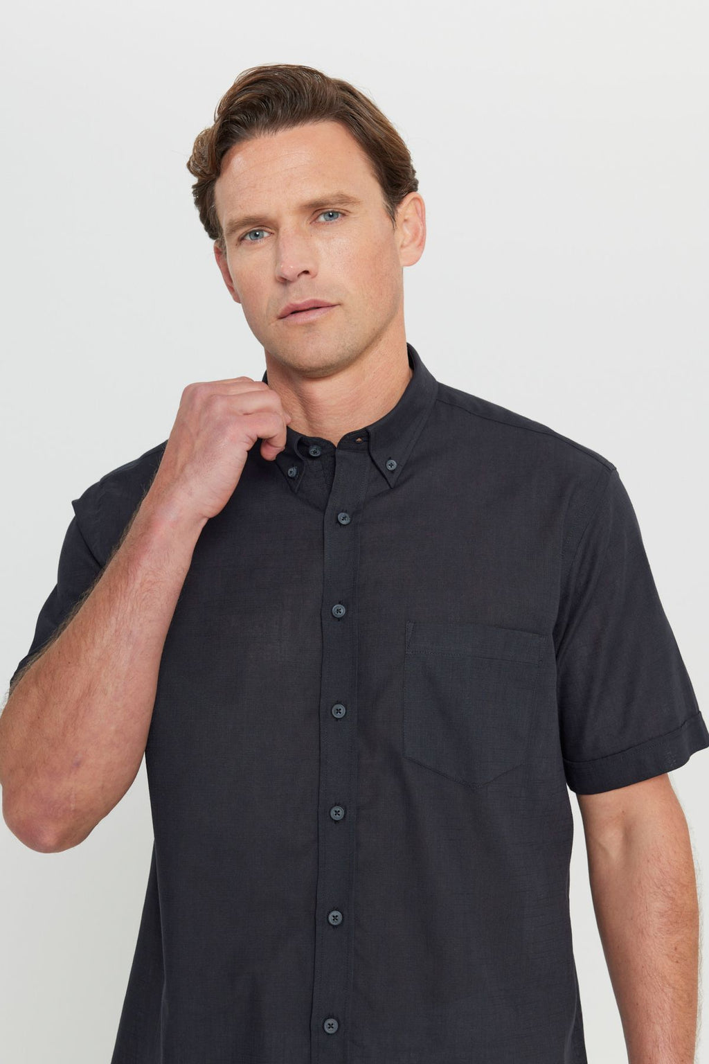 Men's Black Comfort Fit Casual Cutting Buttoned Neck Linen Look 100 %Cotton Short Sleeve Shirt
