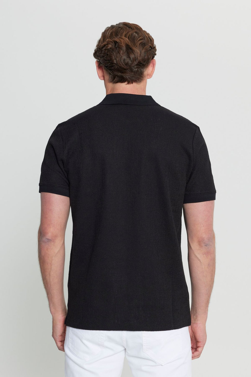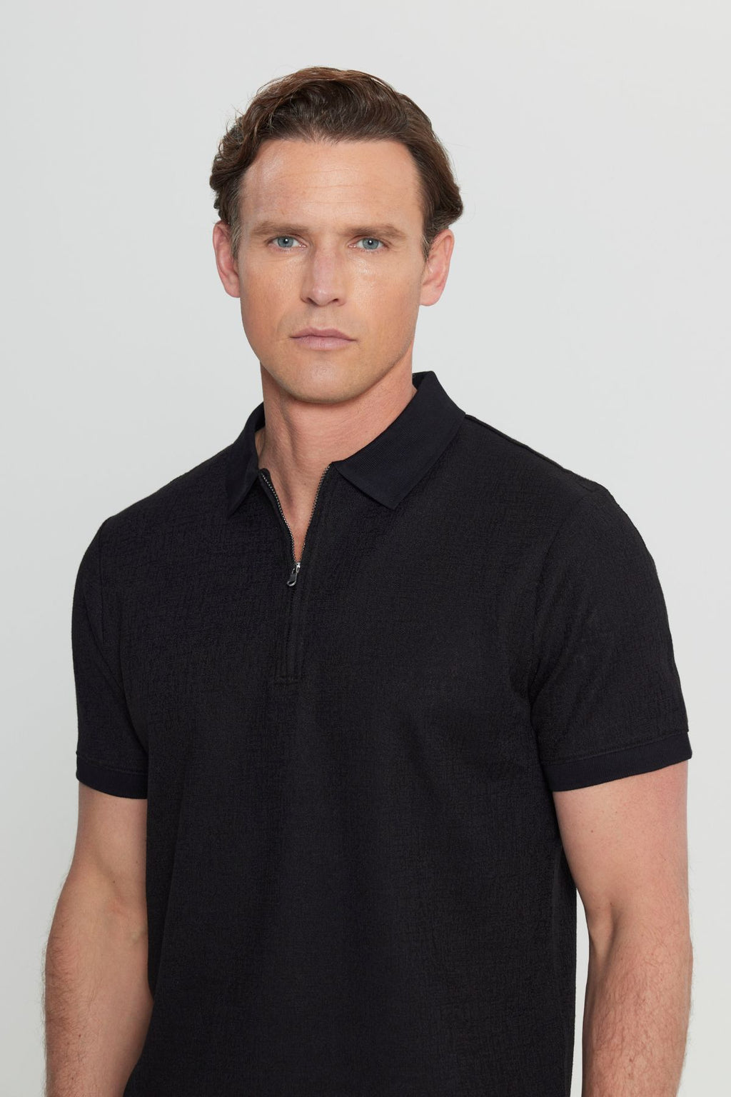 Men's black cotton slim fit narrow cut -down zippered neck jacket flexible t -shirt