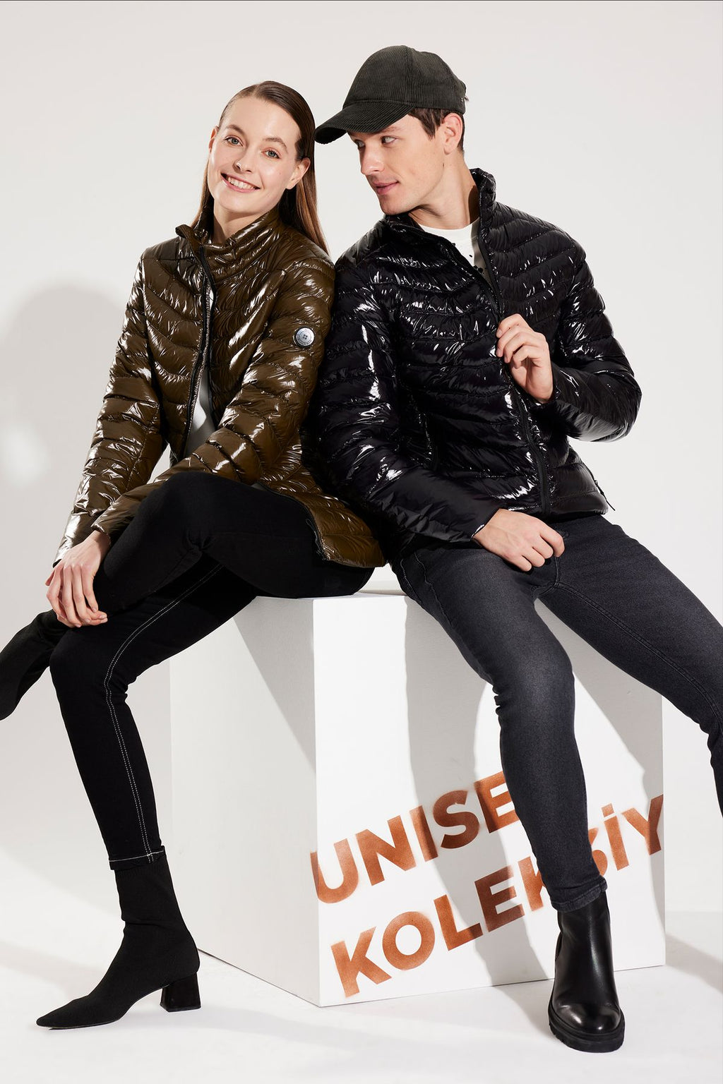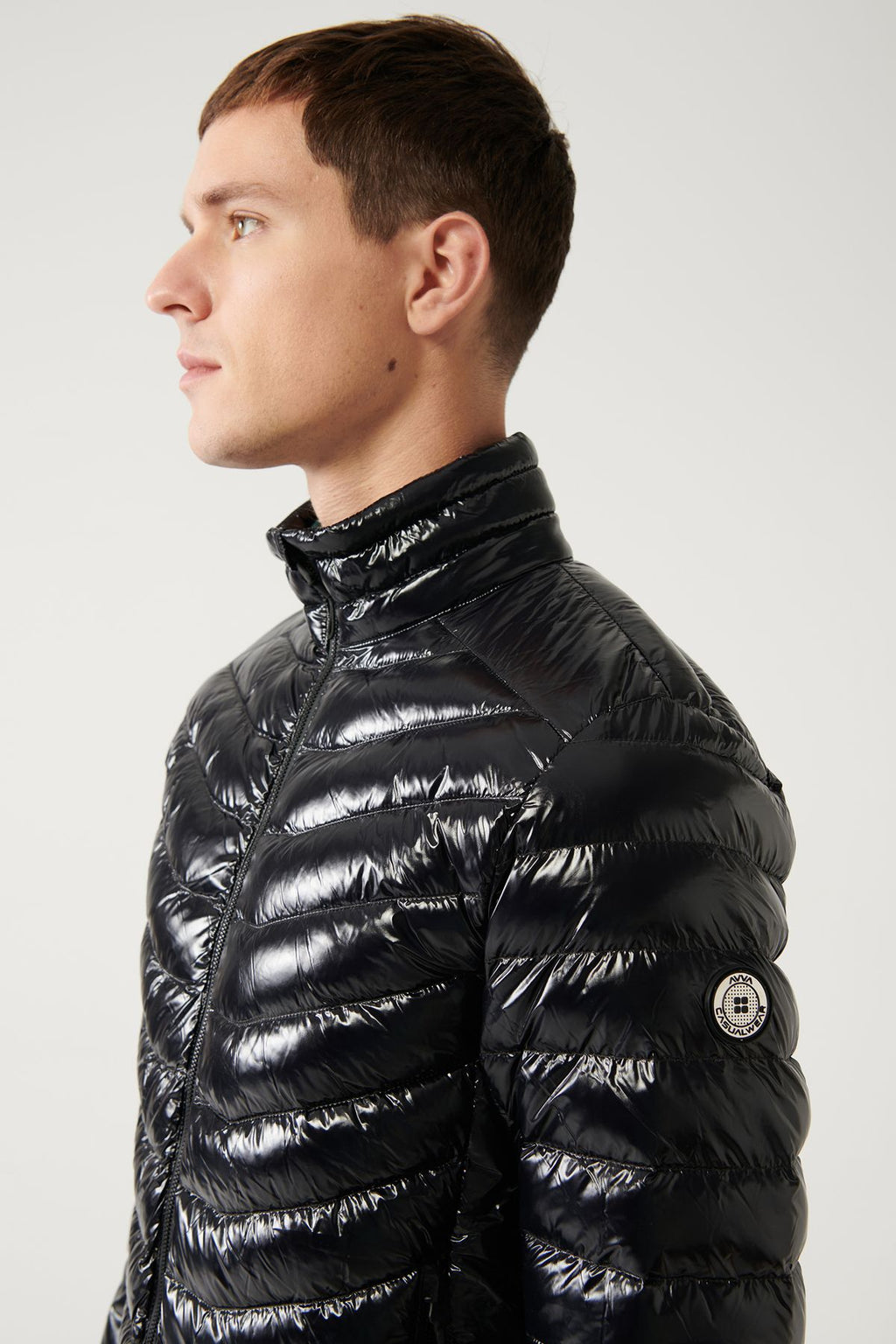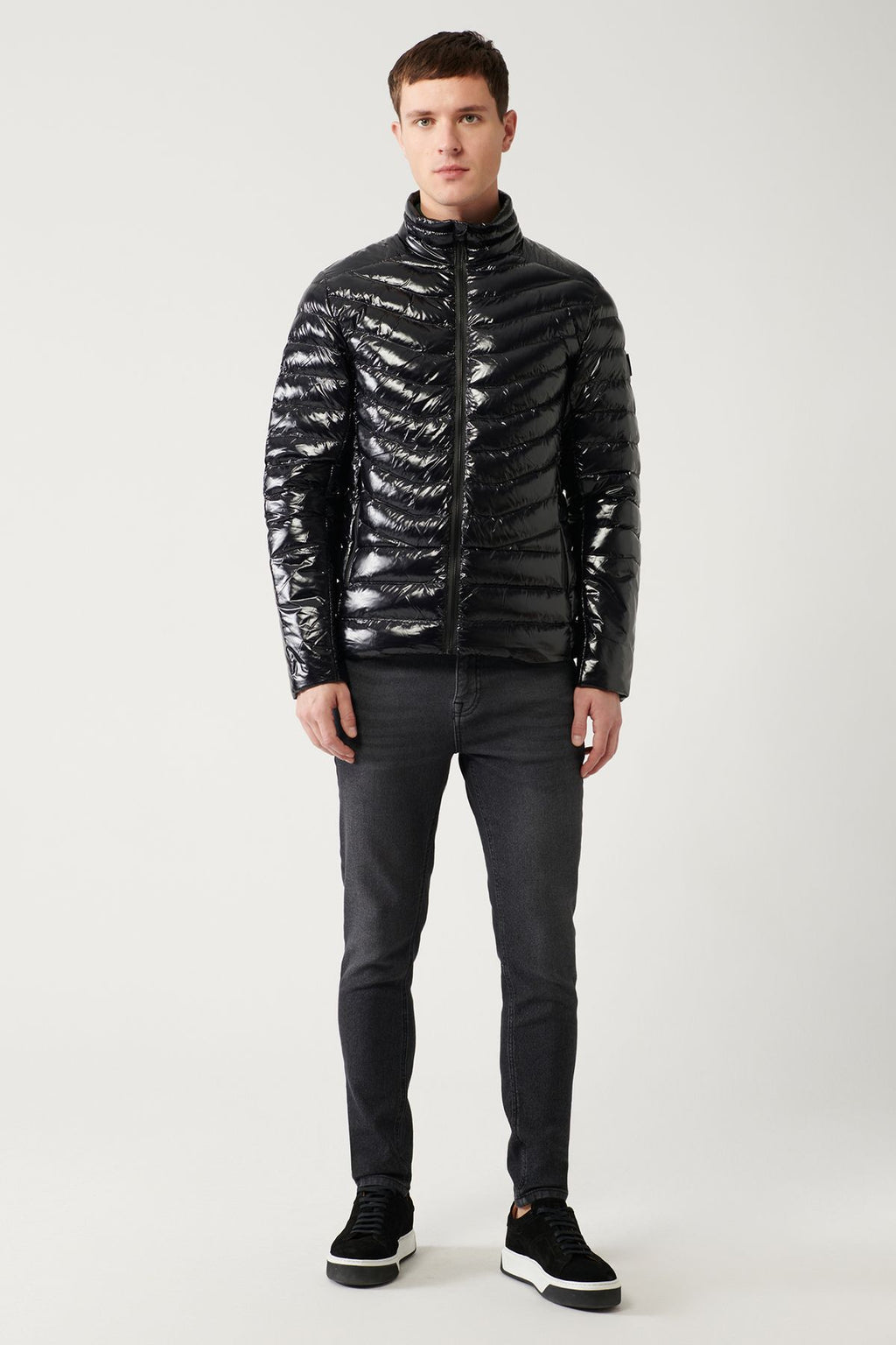 Men's black goose feather water -derived windproof fabric upright collar bright swelling coat B006015
