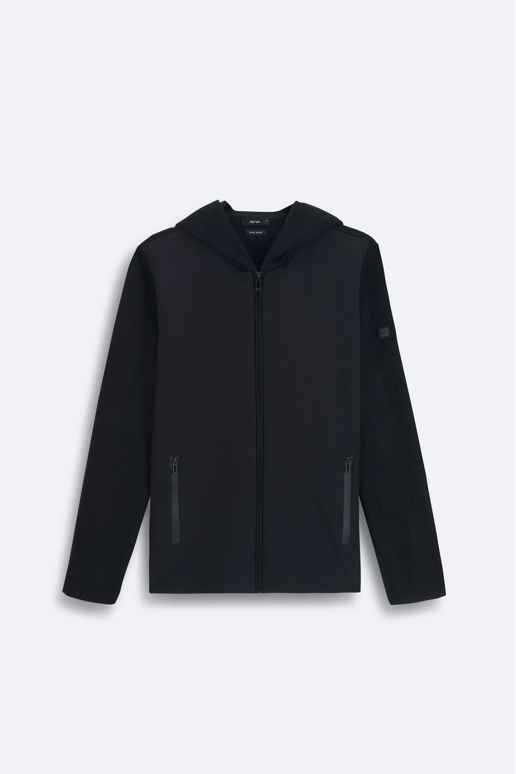 Men's black hood front technical fabric detailed zipper woolen cardigan A32y6058