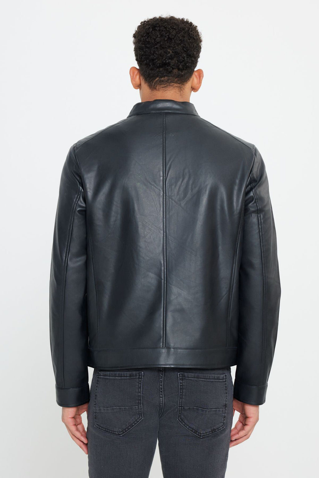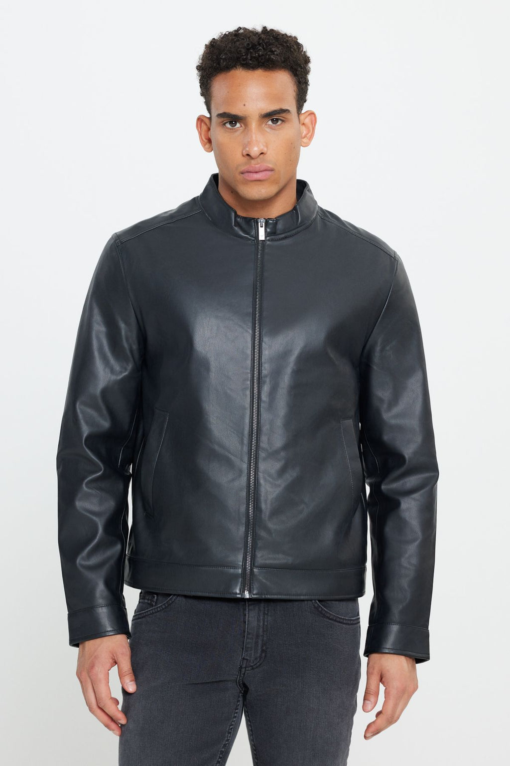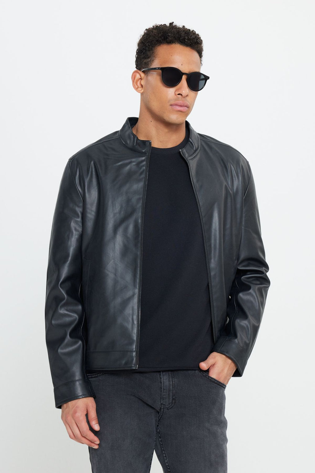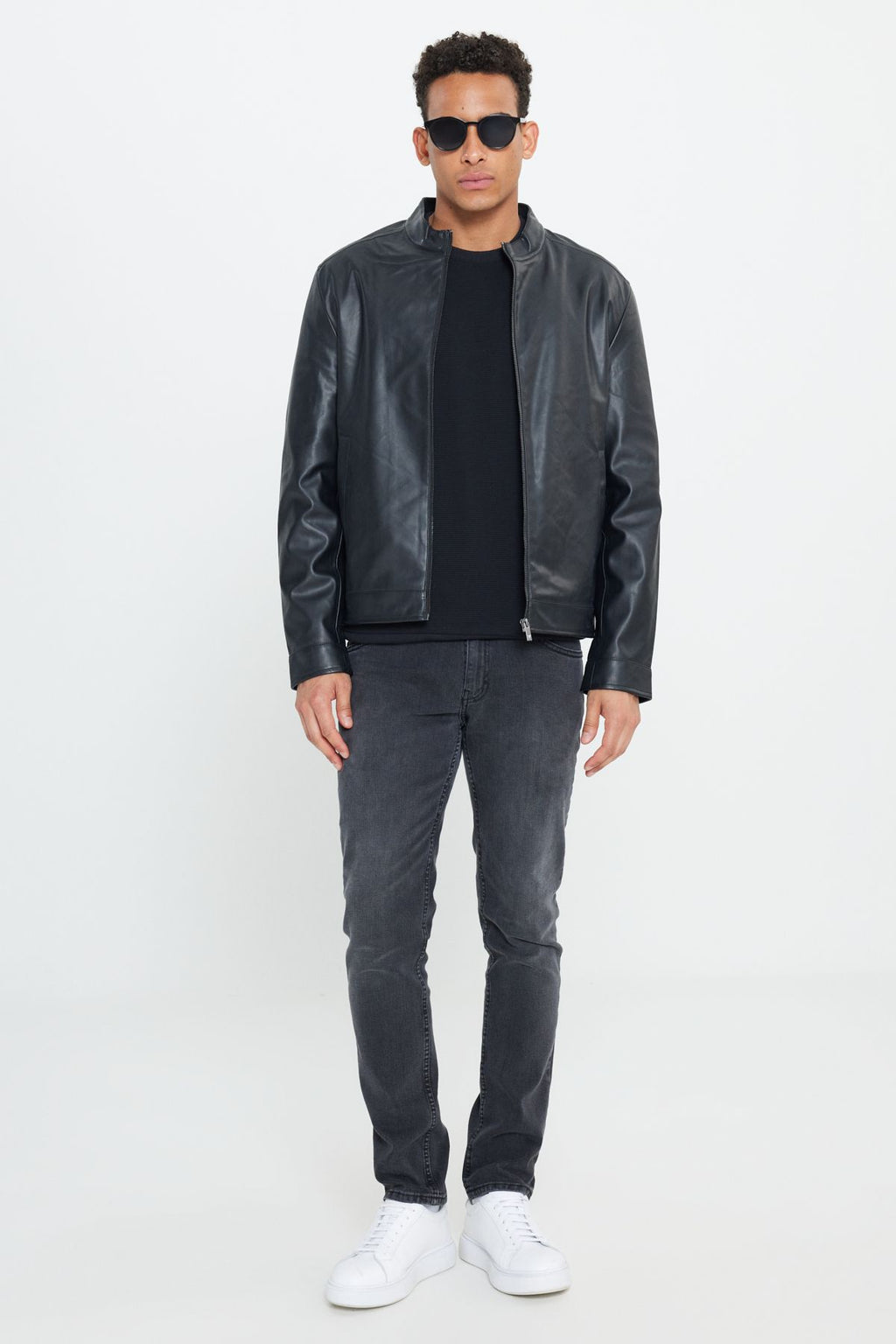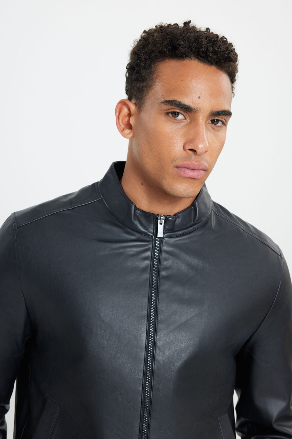 Men's black leather jacket zipper standard fit normal cut upright collar