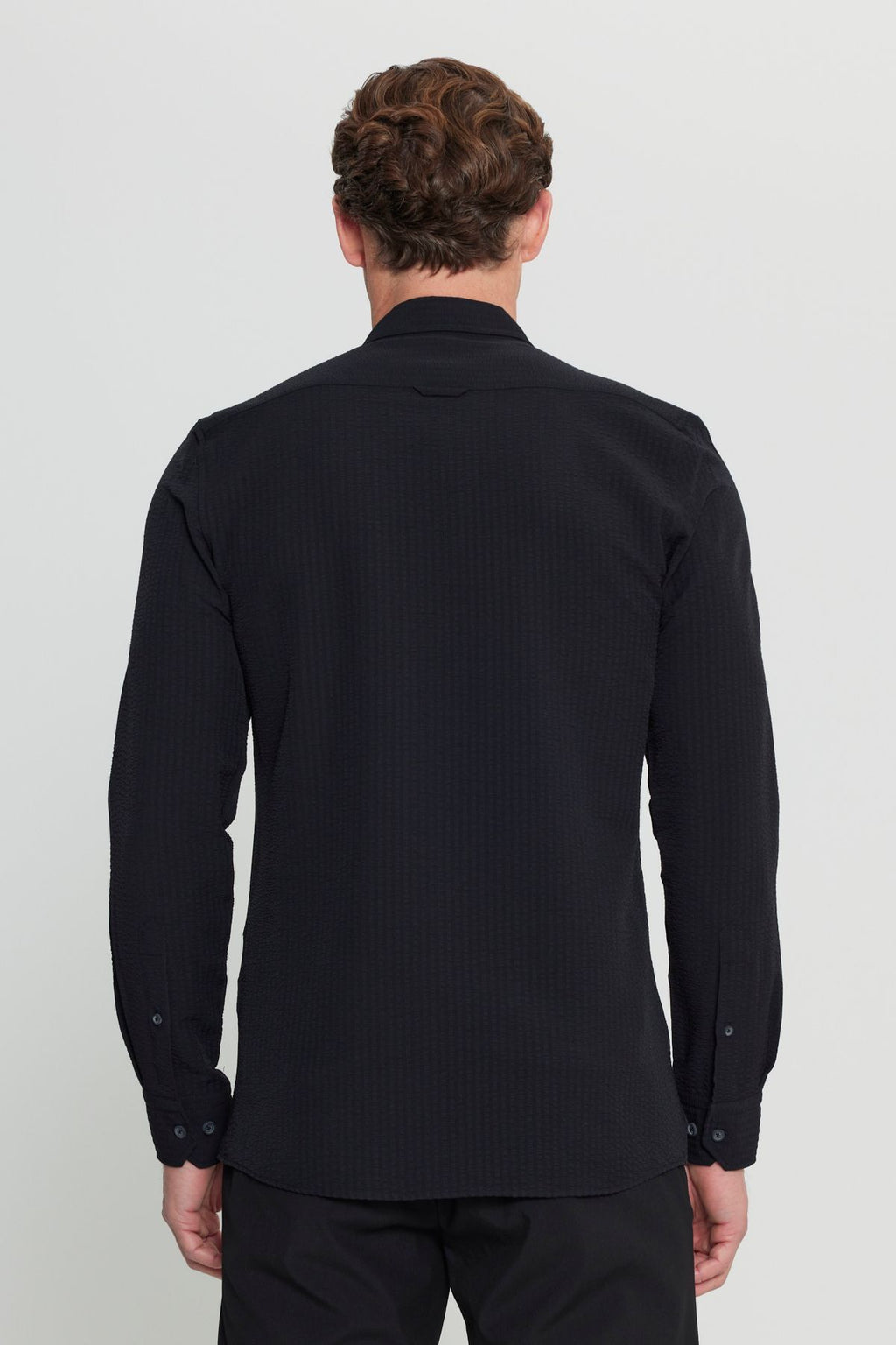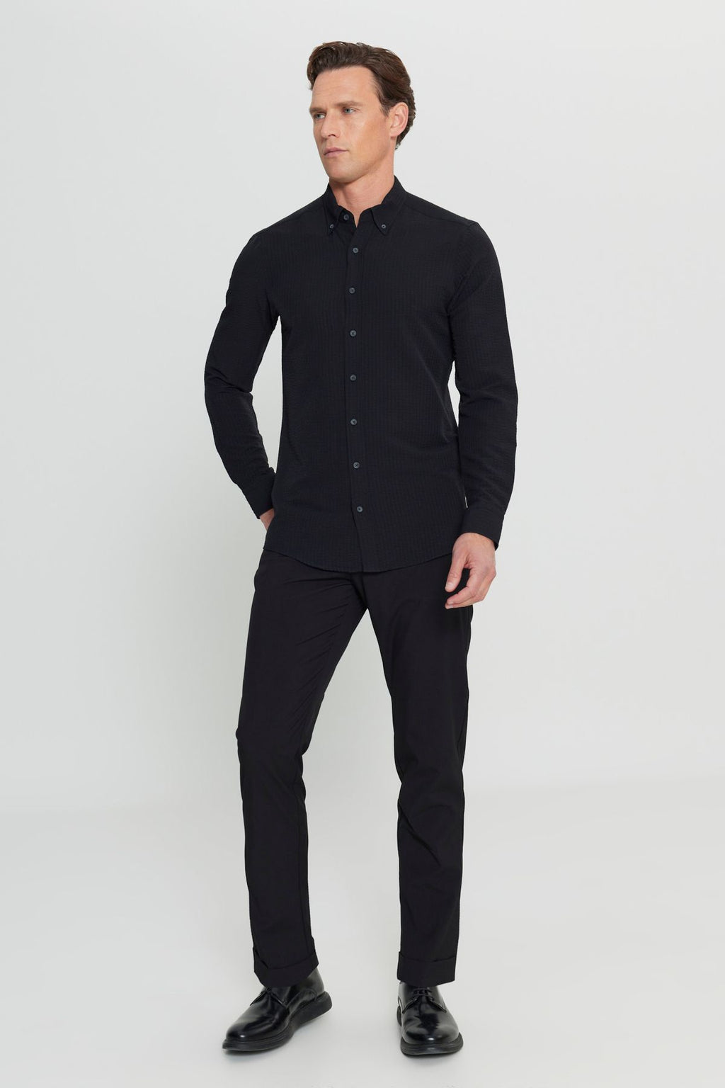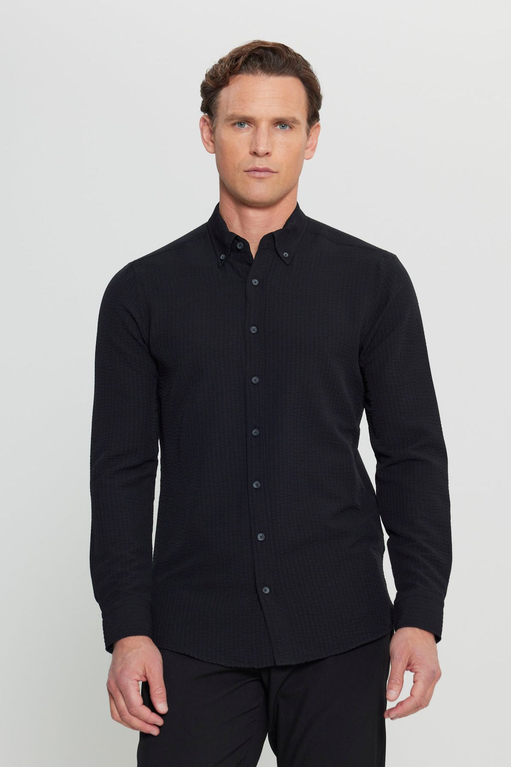Men's black slim fit narrow -cut buttoned collar Amesty wafer patterned shirt
