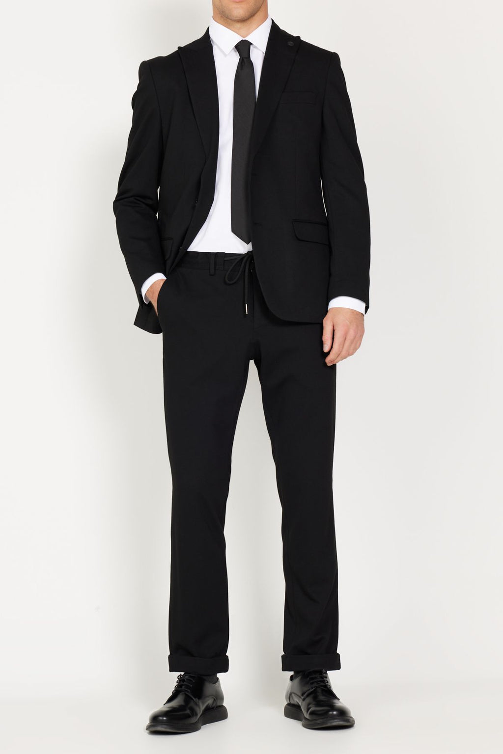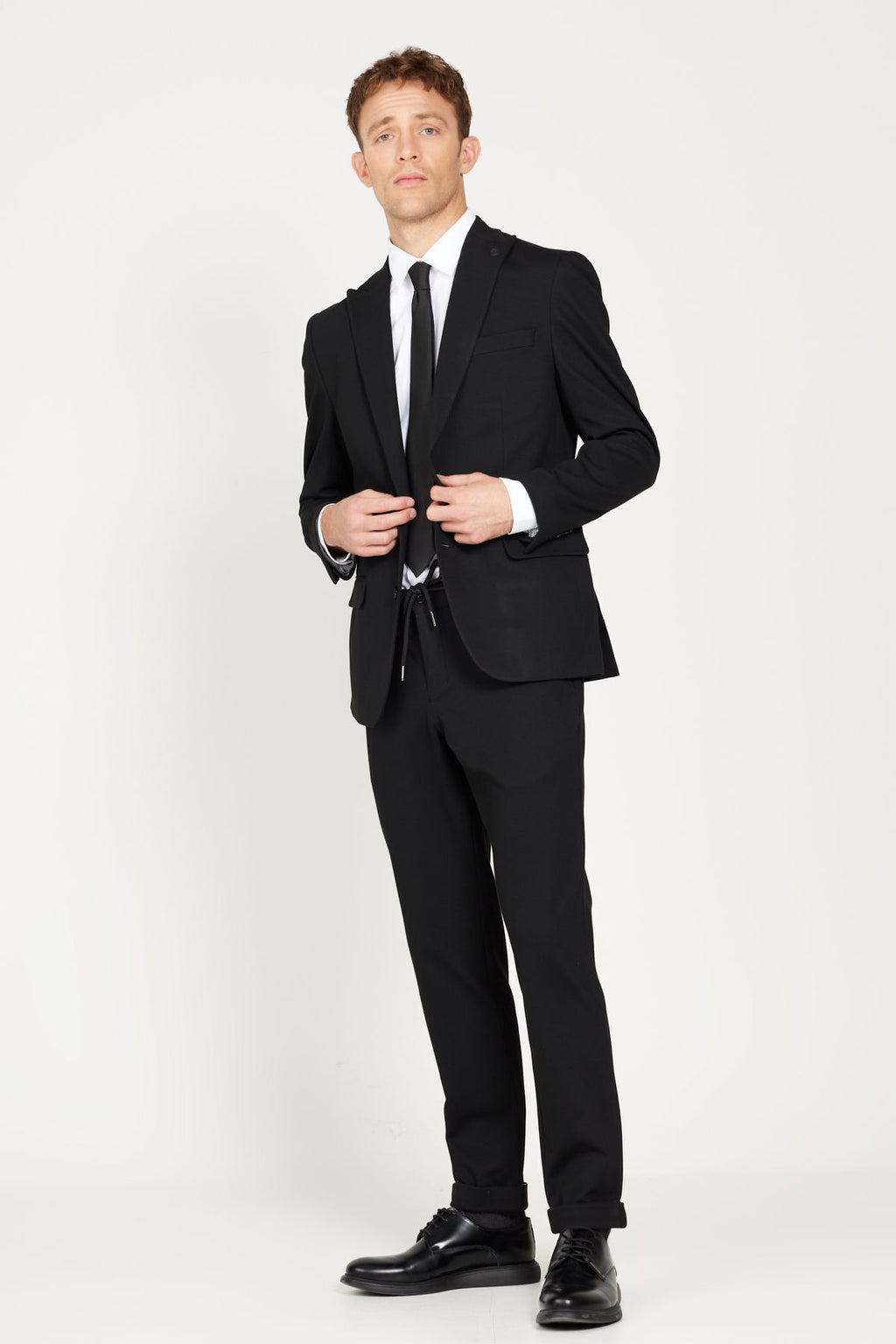 Men's Black Slim Fit Narrow Cut Swallow Collar Patterned Suit