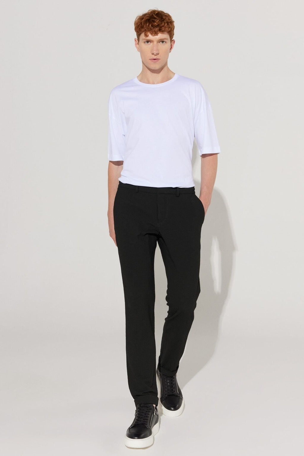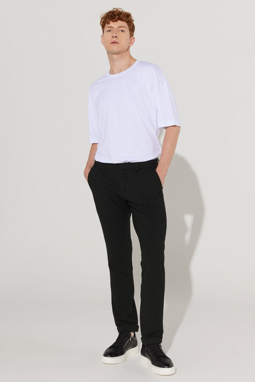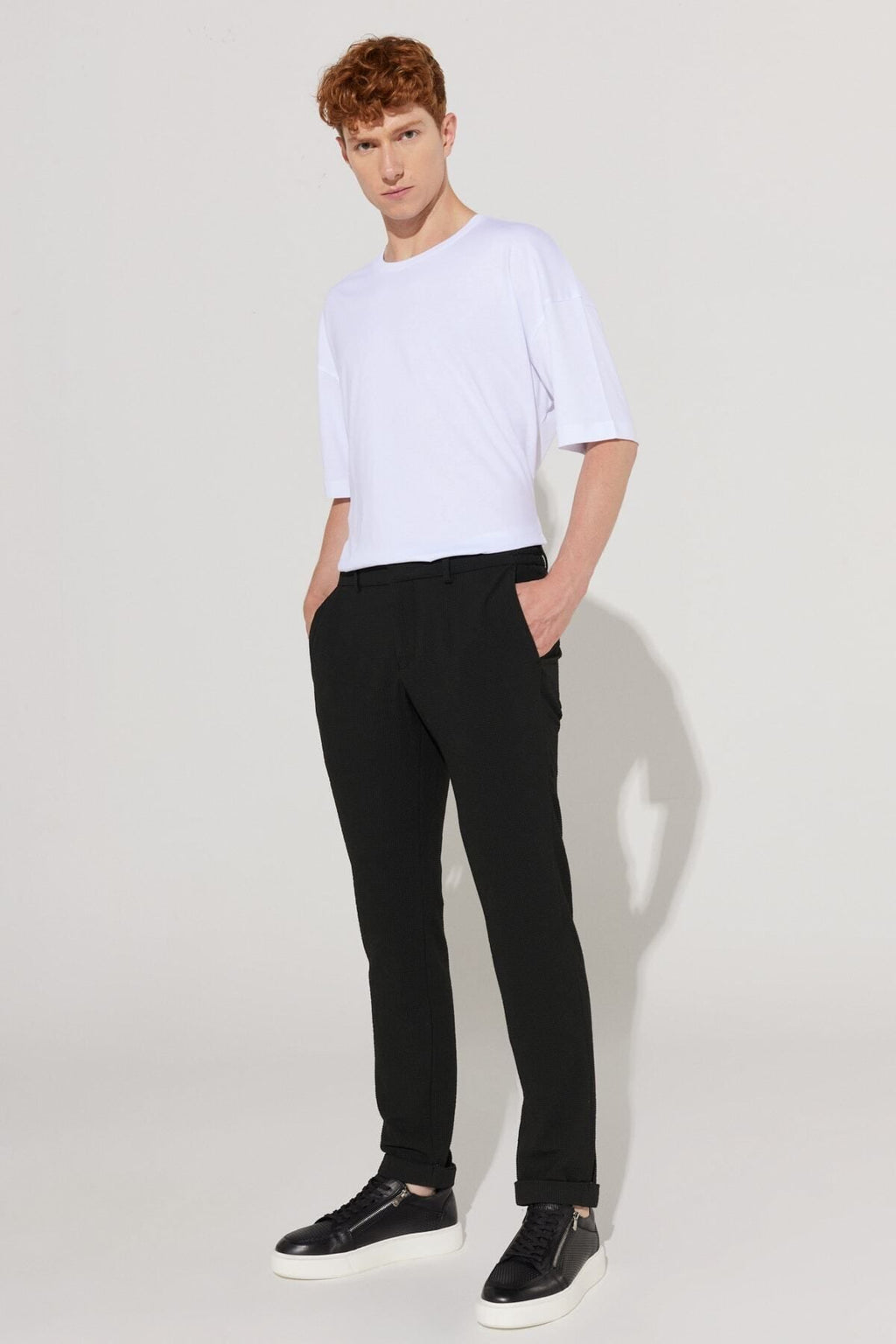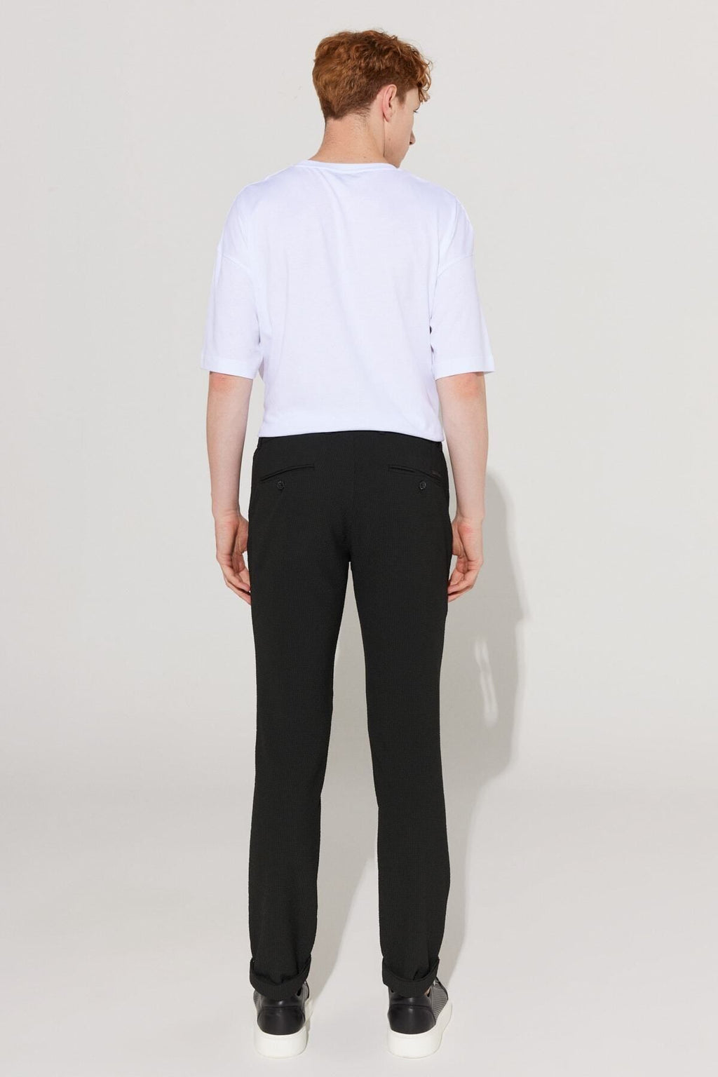 Men's black slim fit narrow -cut waffle patterned flexible waist tied trousers