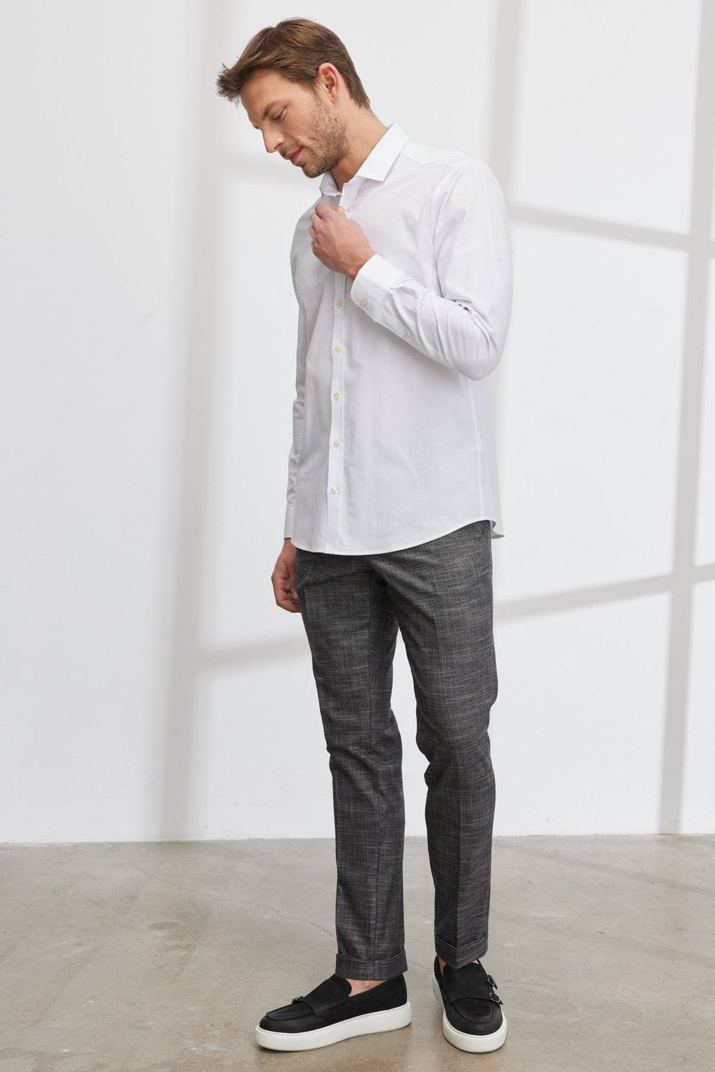 Men's black slim fit narrow cutting side pocket with plaid patterned waist tire flexible pants
