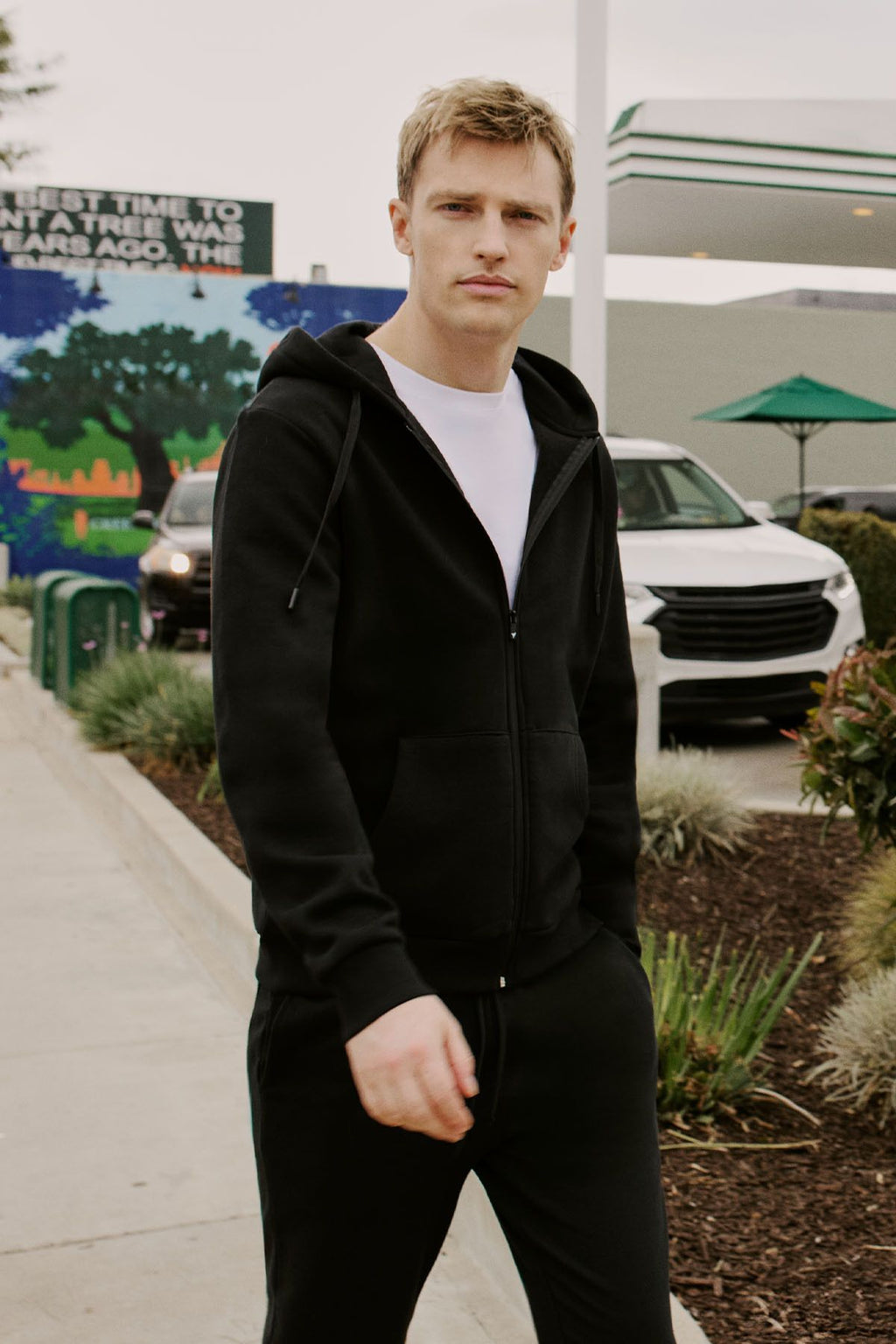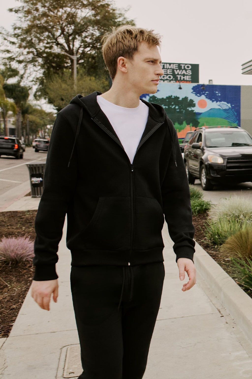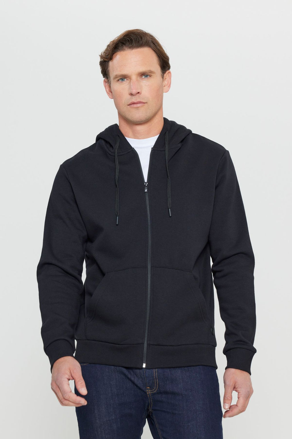 Men's Black Standard Fit Normal Cutting Içi Polar 3 -Tick Hoped Zippered Sweatshirt Jacket