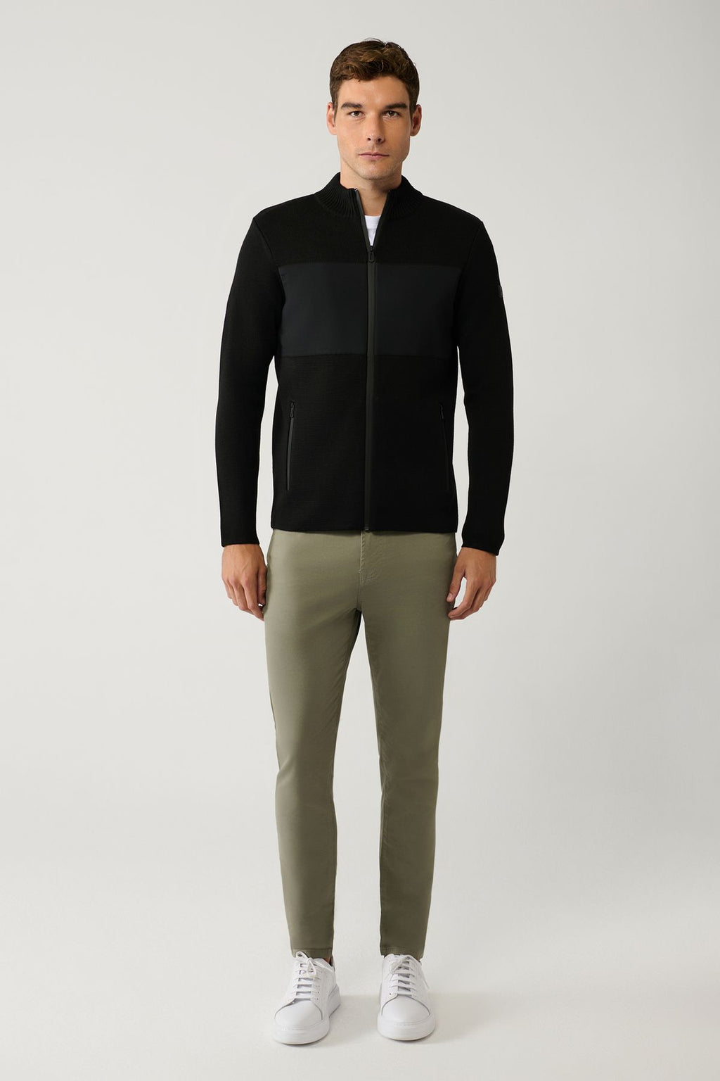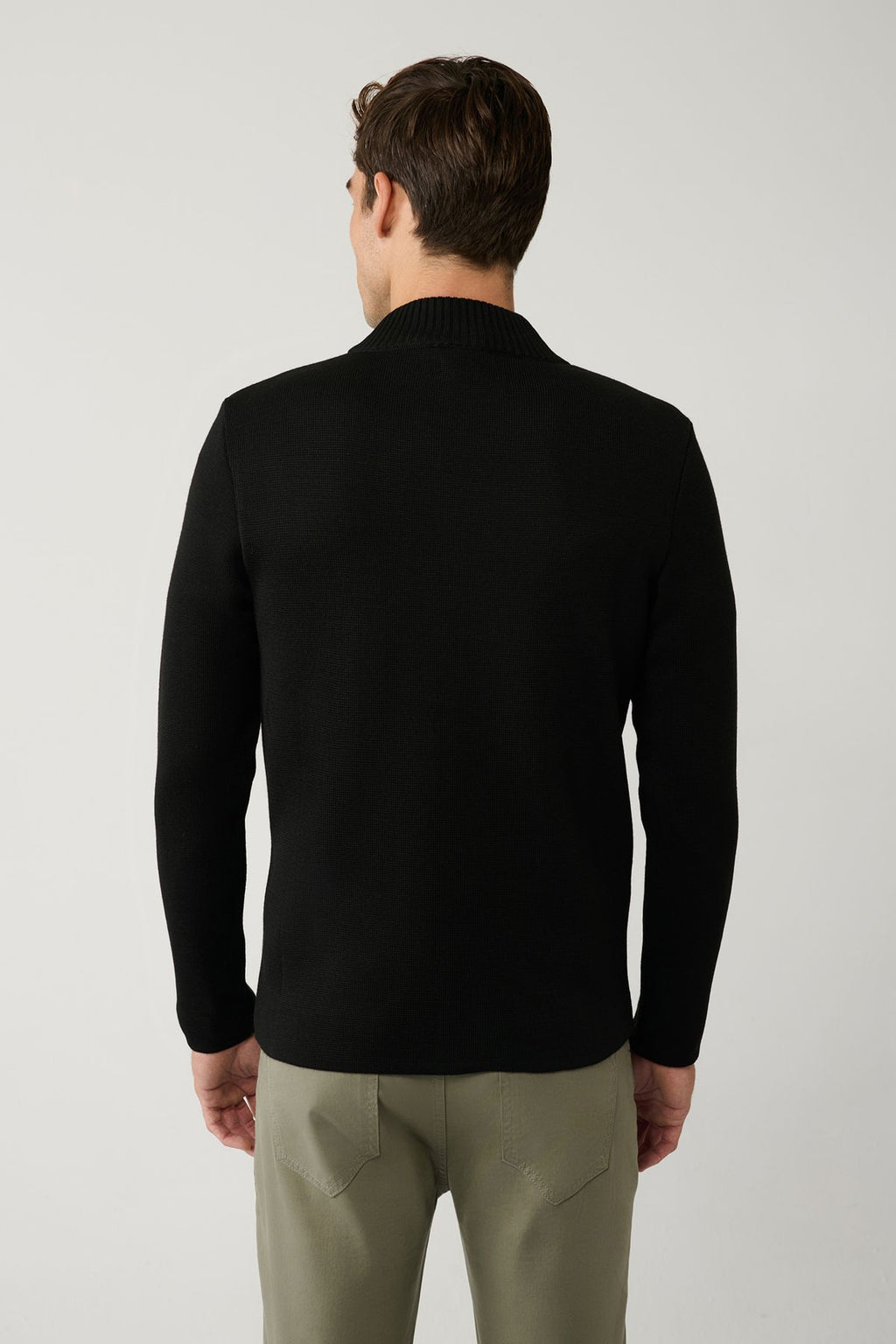 Men's black upright collar patterned technical fabric detailed zipper woolen cardigan A32y6056