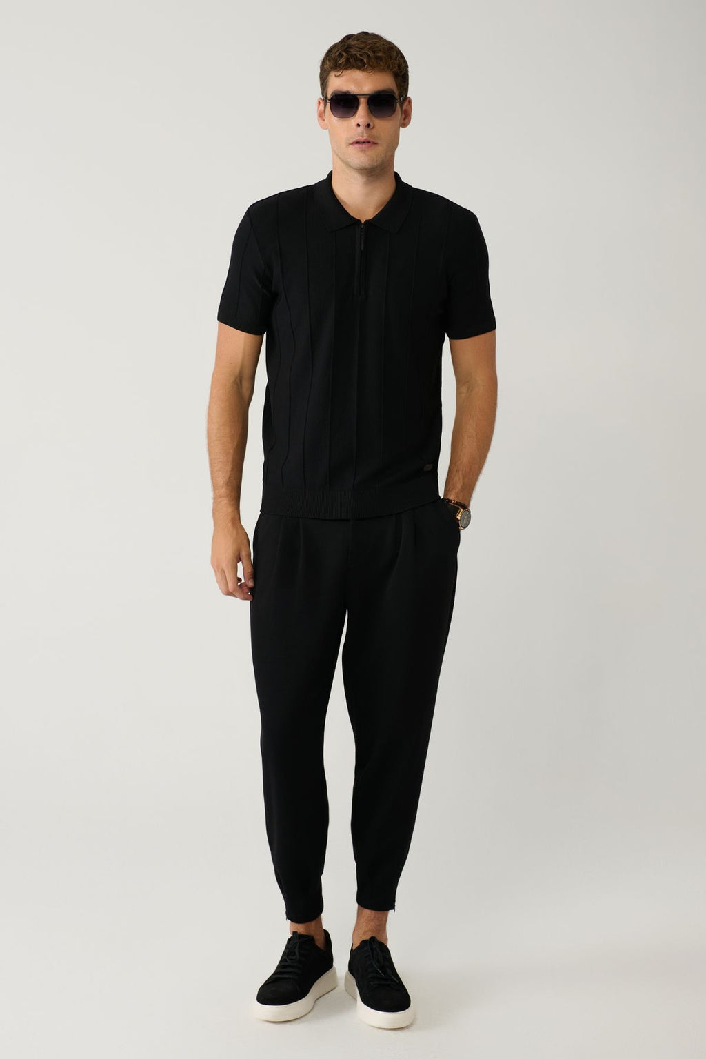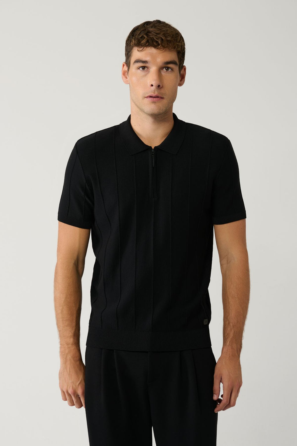 Men's black zipper rayon wick braided Polo collar knitwear T-shirt A41y5073