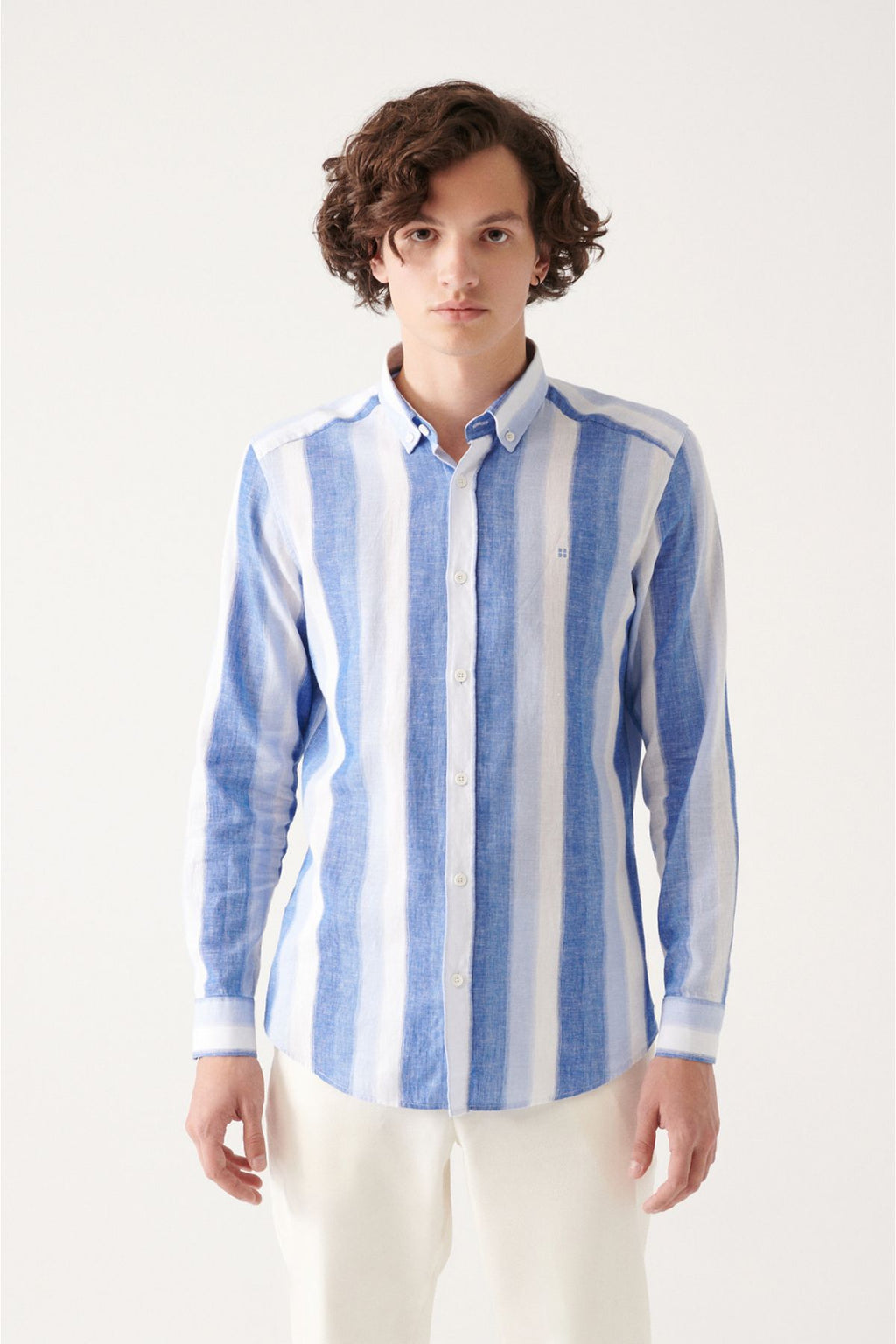 Men's blue button collar striped cotton linen shirt A31Y2085