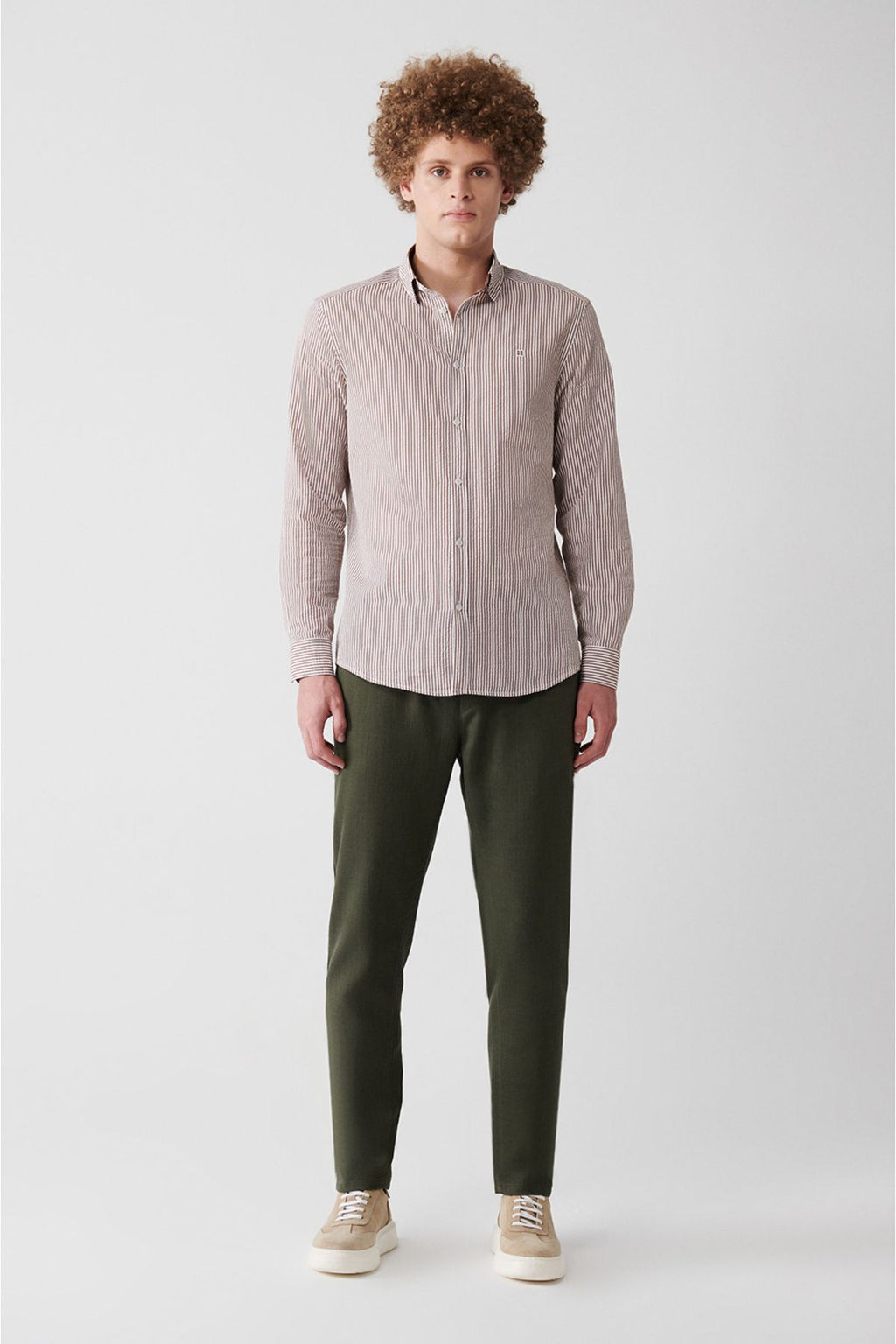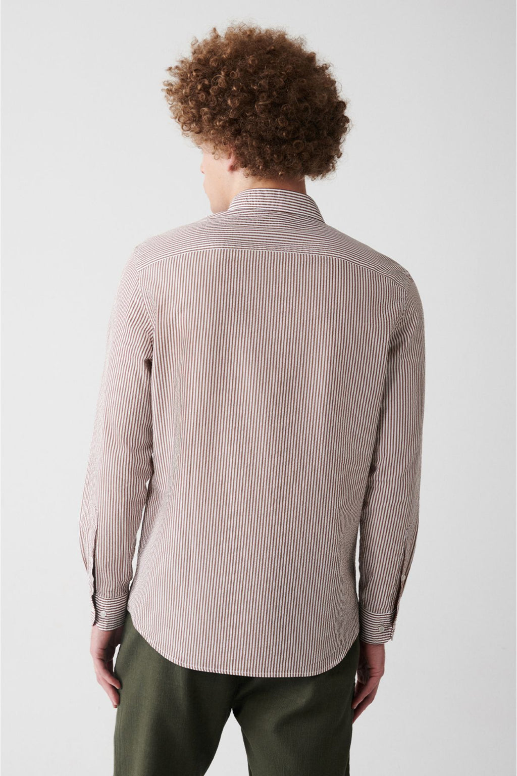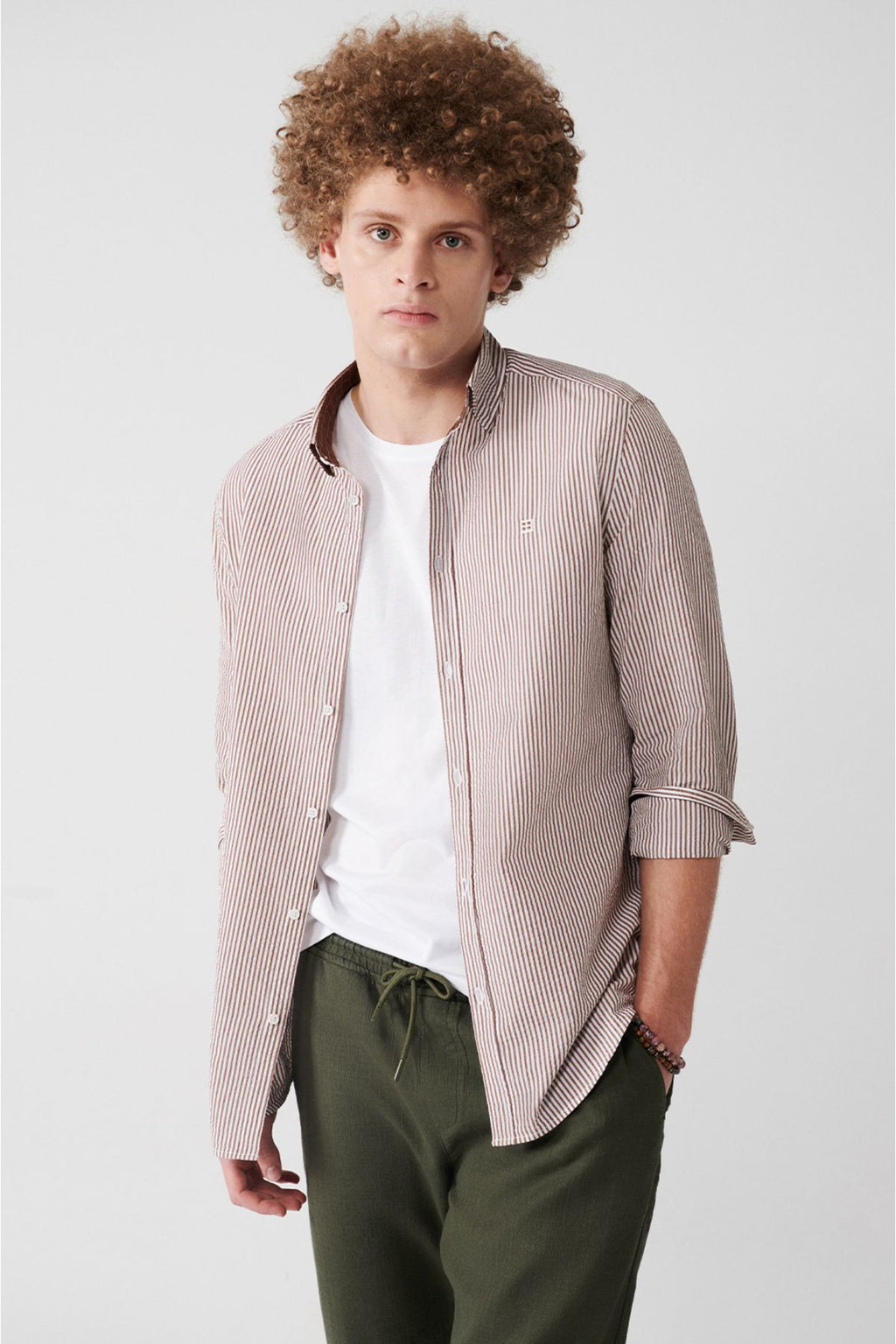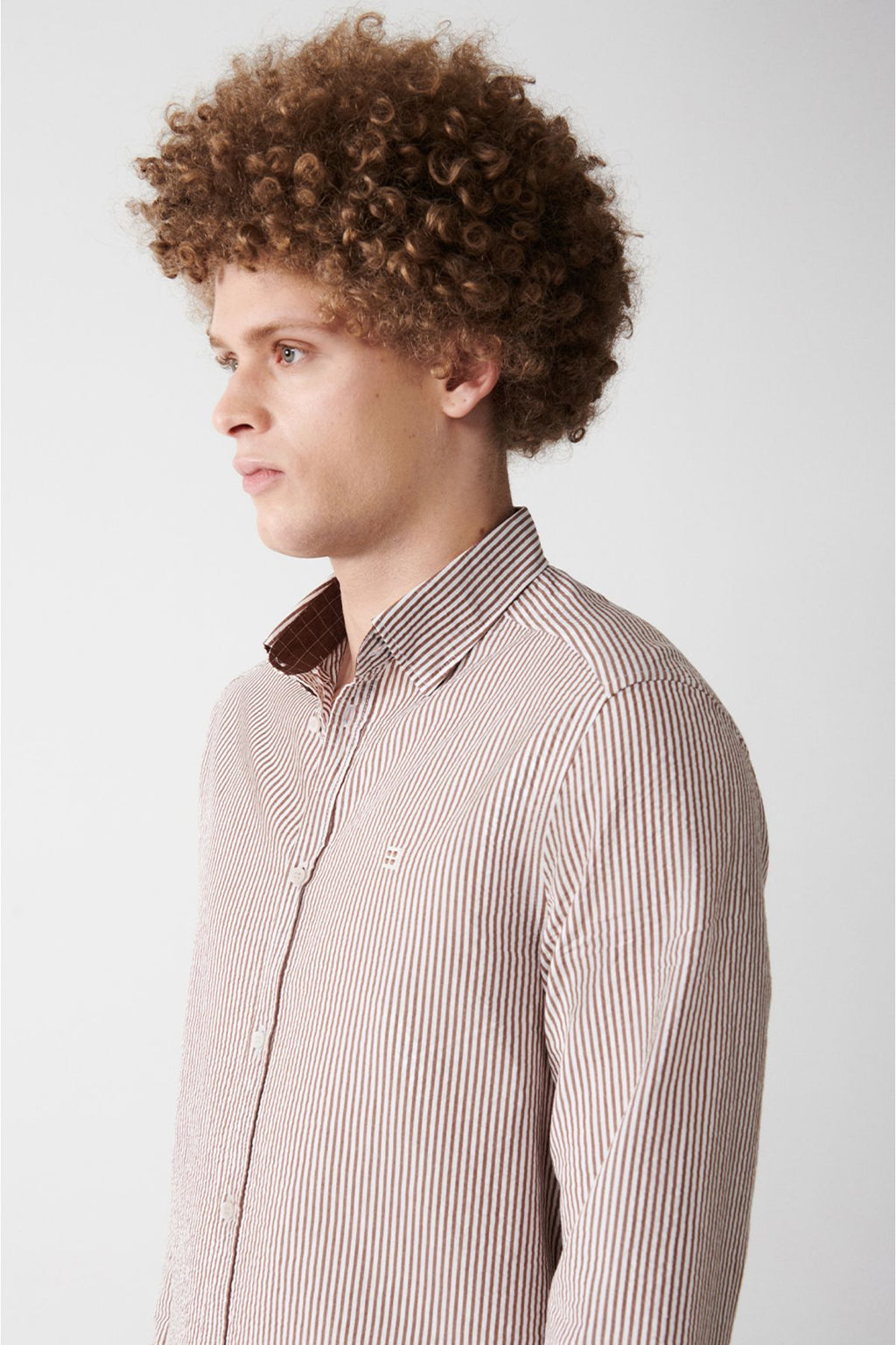 Men's Brown Seersucker Bottle buttoned collar striped shirt A31y2084