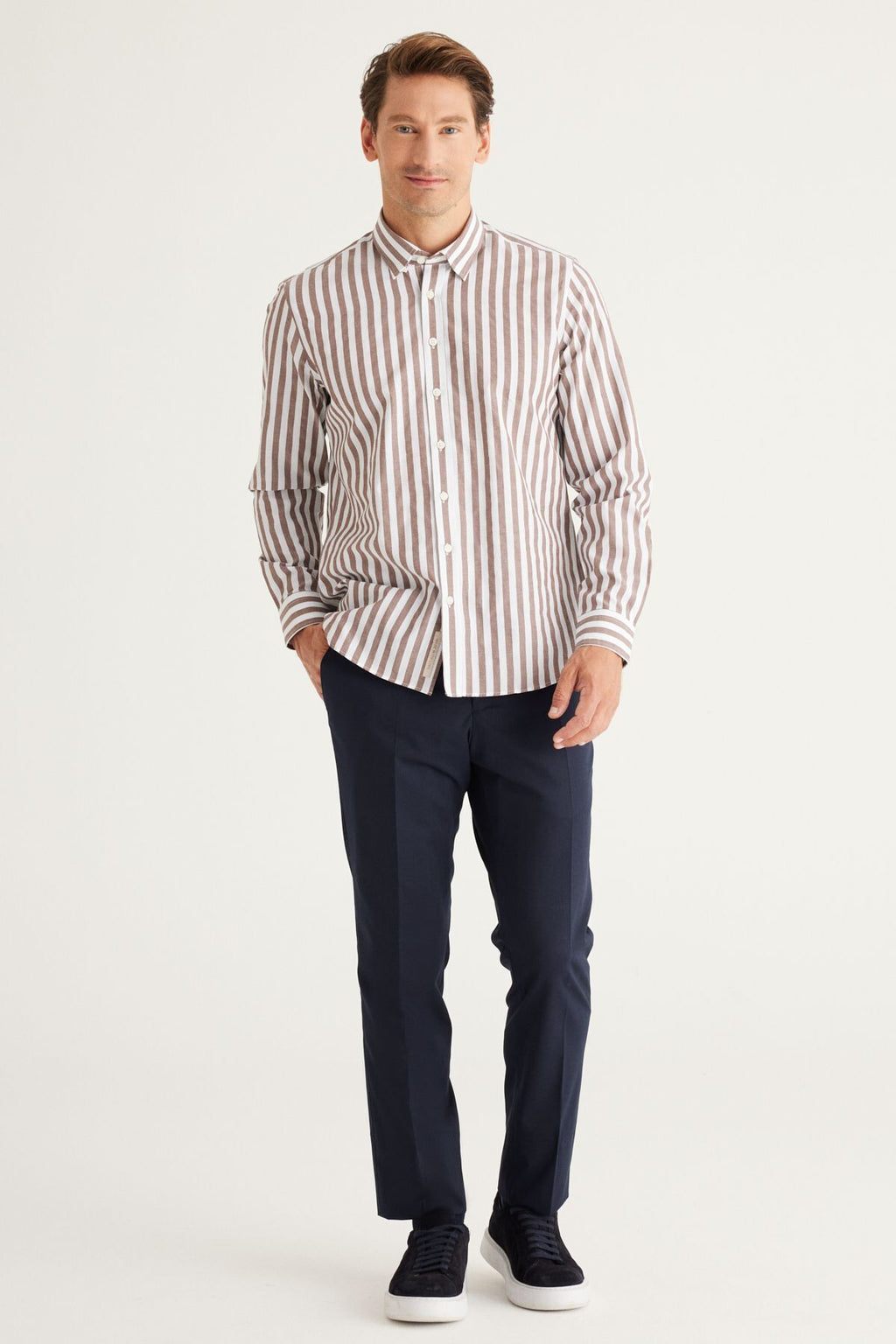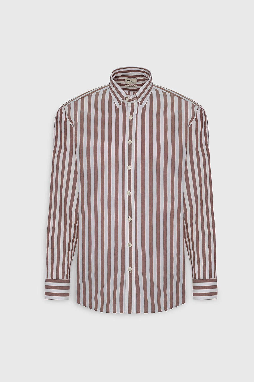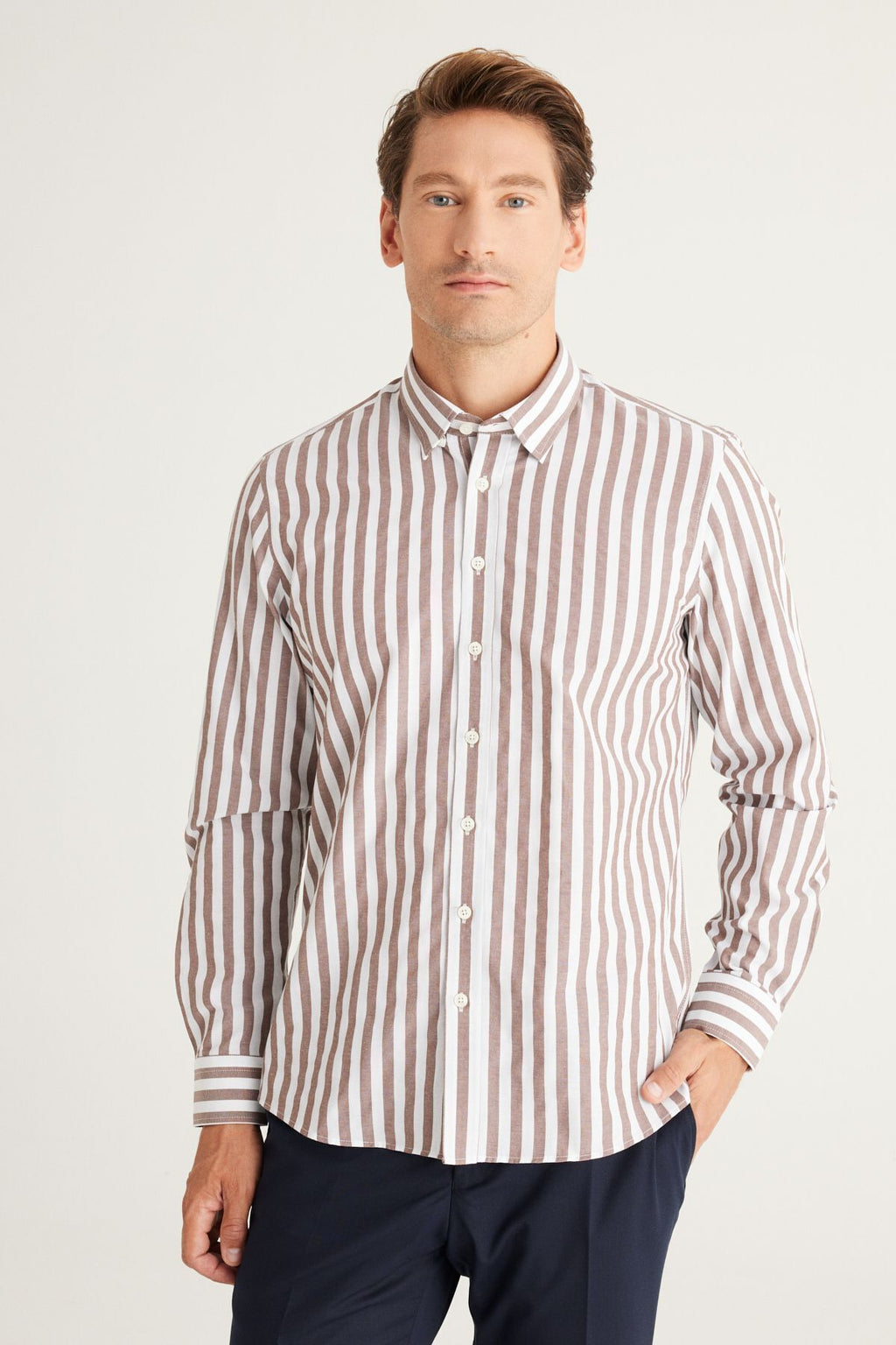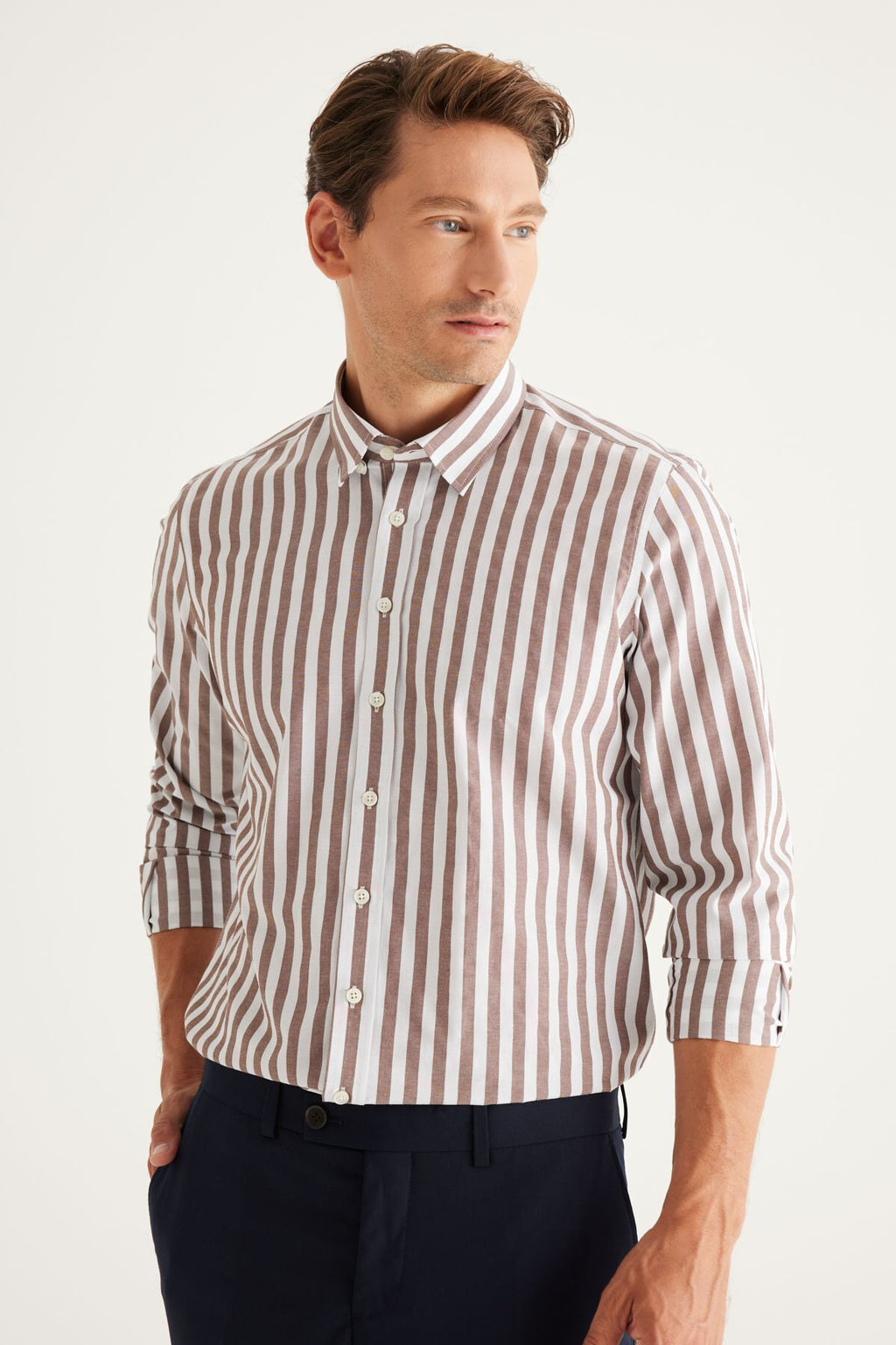 Men's Brown White Slim Fit Narrow Cut Hidden buttoned collar cotton shirt