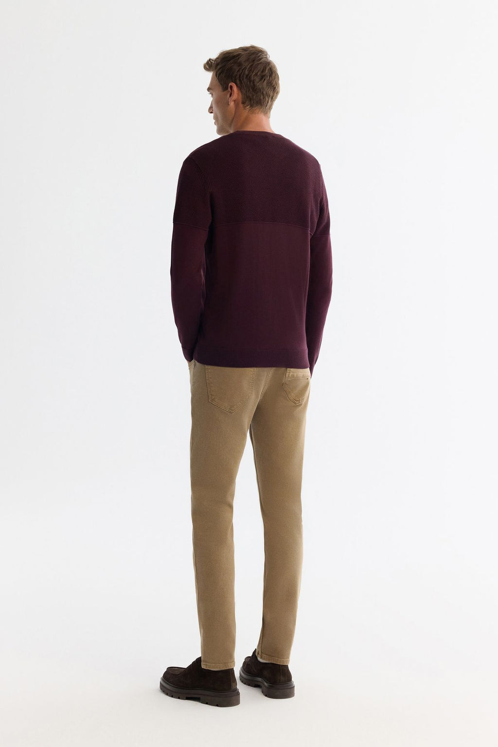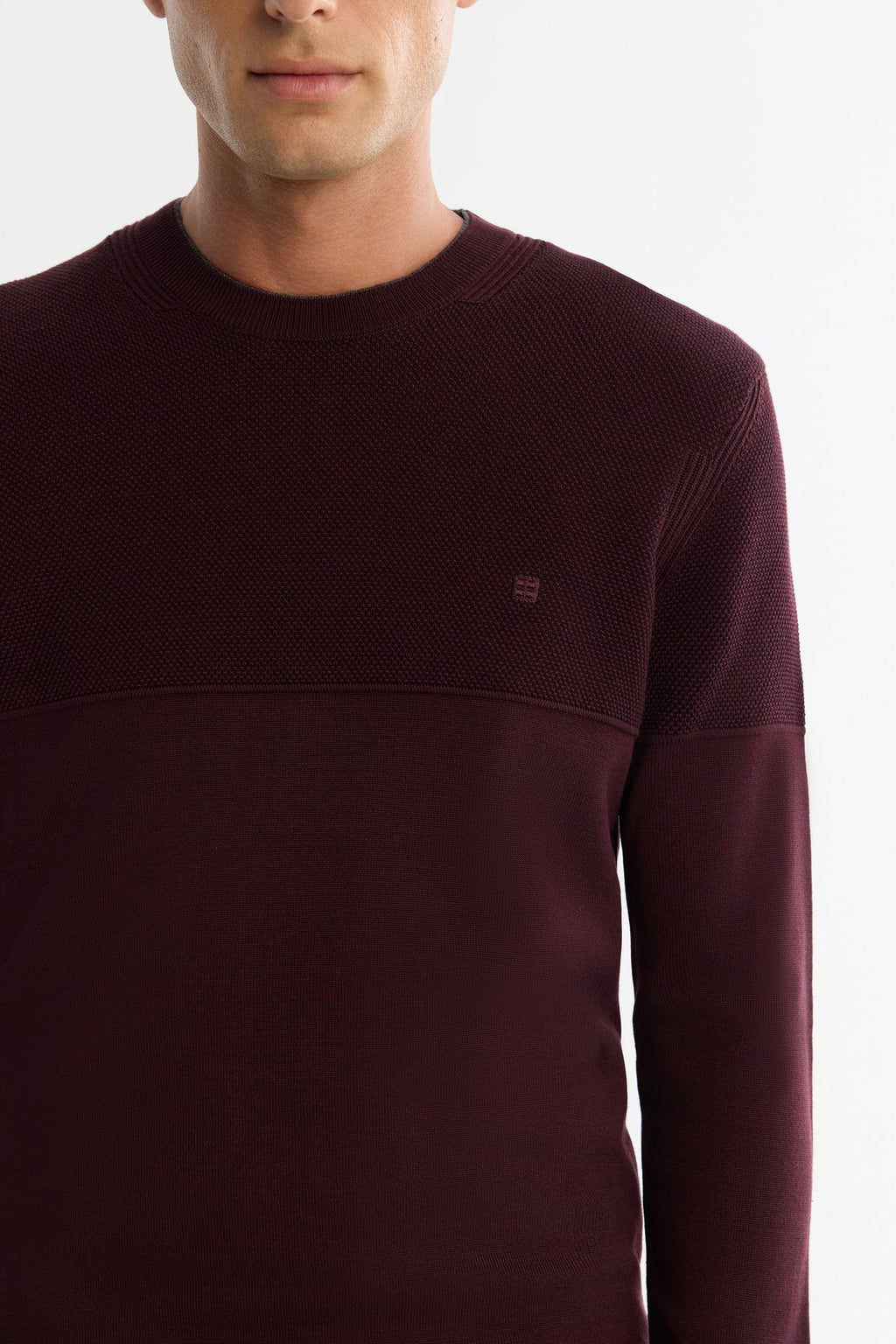 Men's burgundy bike collar dual collar detailed textured cotton knitwear sweater A42y5190