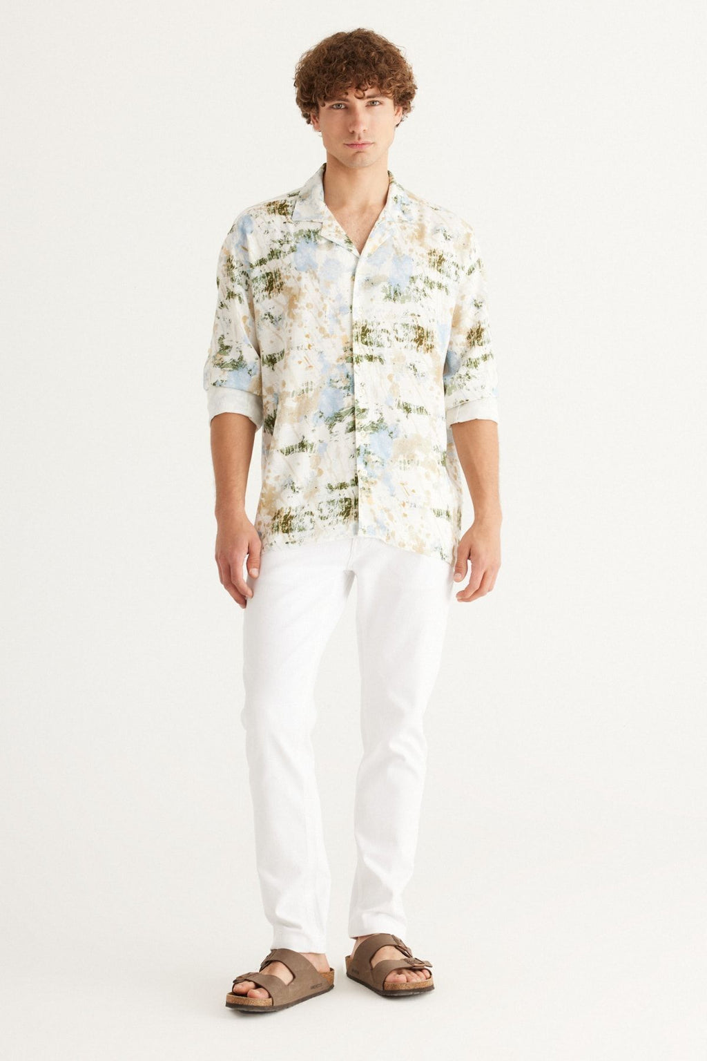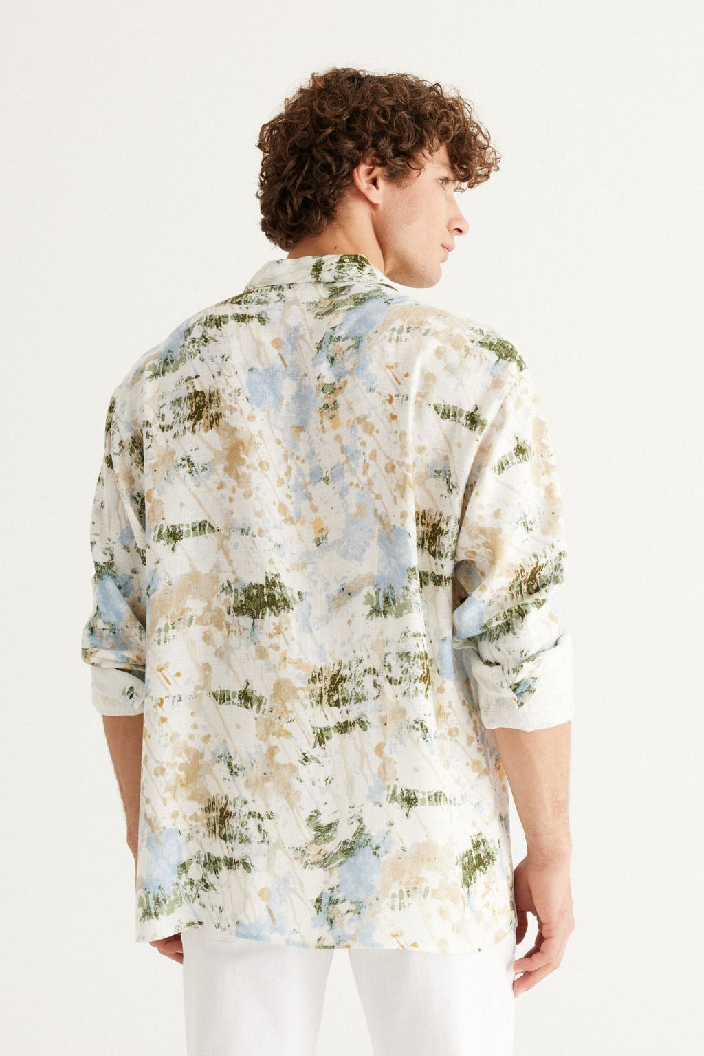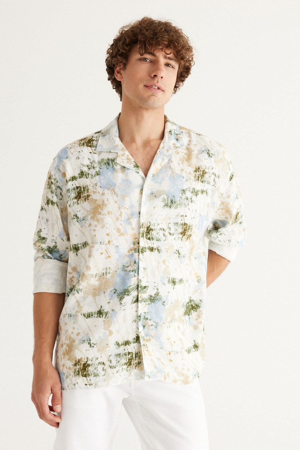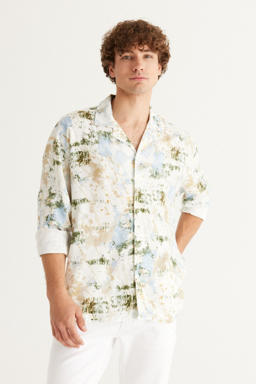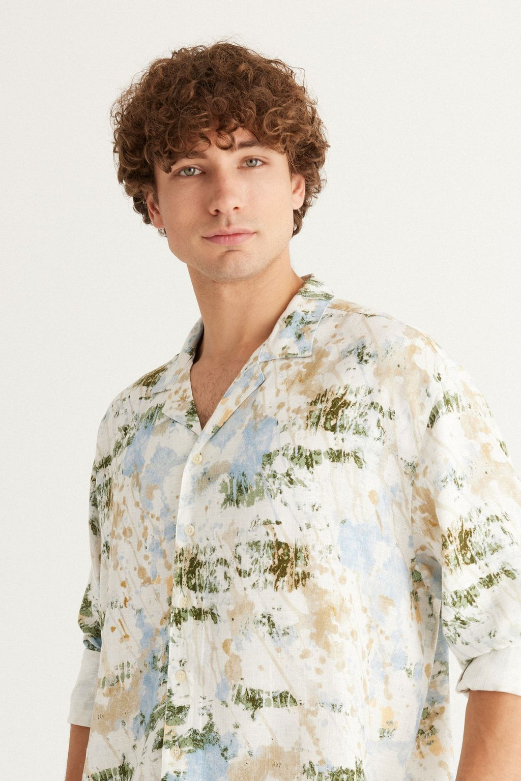 Men's Ecru-Blue Linen Oversize plenty of cut Cuba collar printed shirt