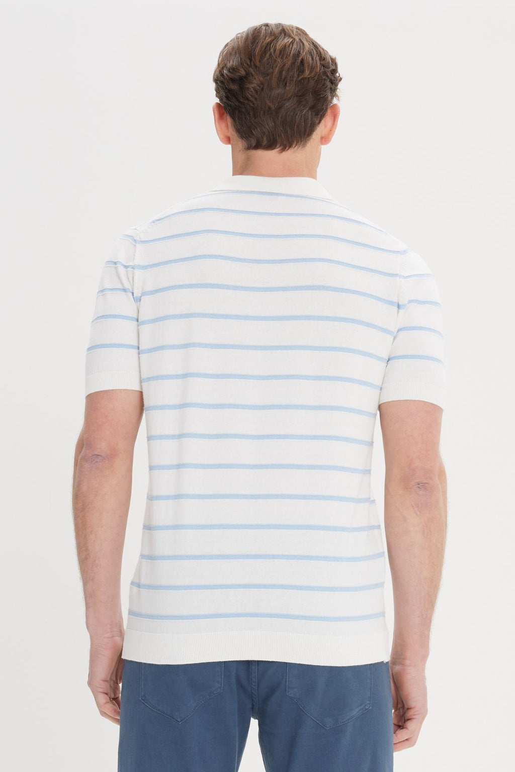 Men's Ecru-Blue Standard Normal Cutting 100 %Cotton striped Polo Yaka Triko T-shirt