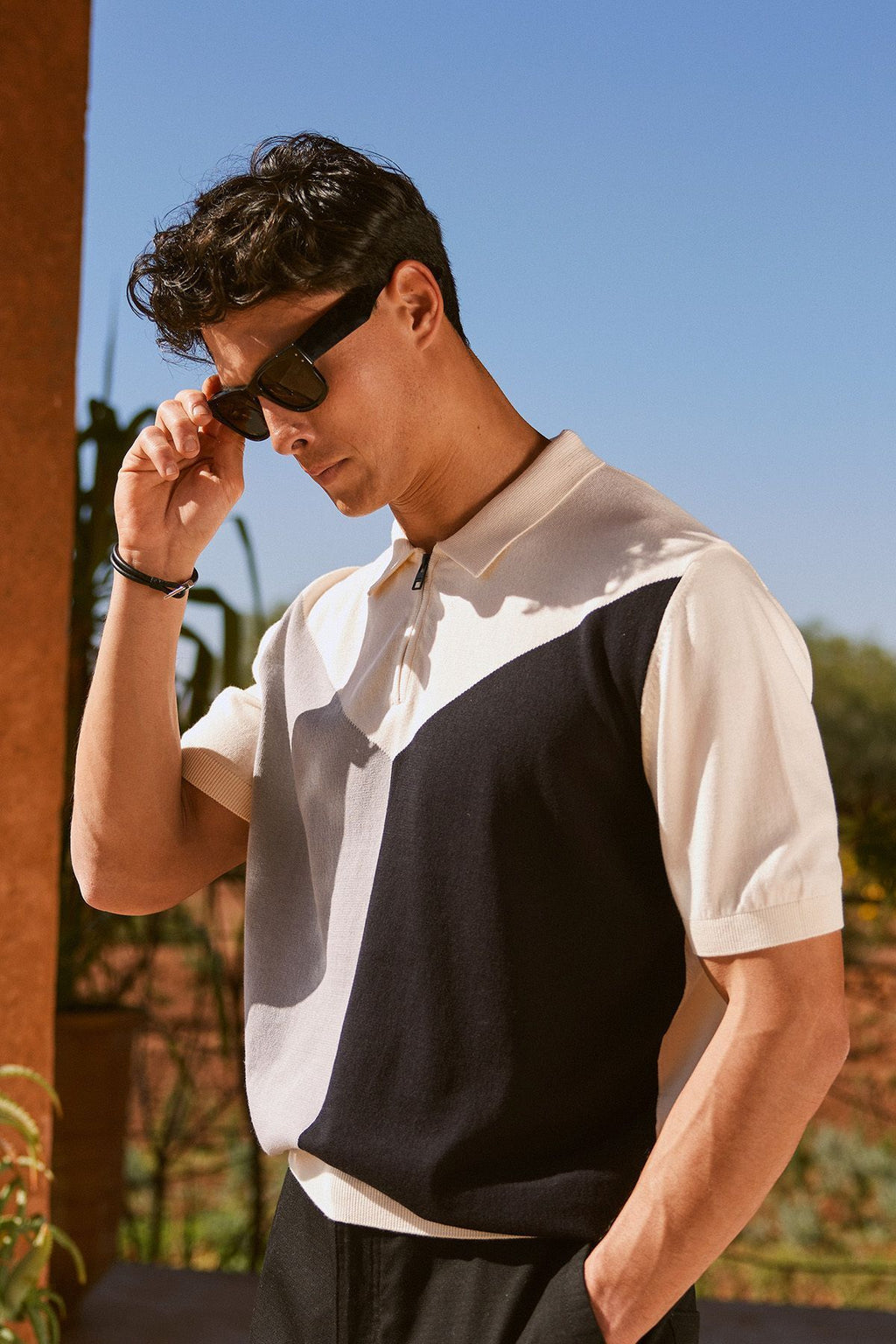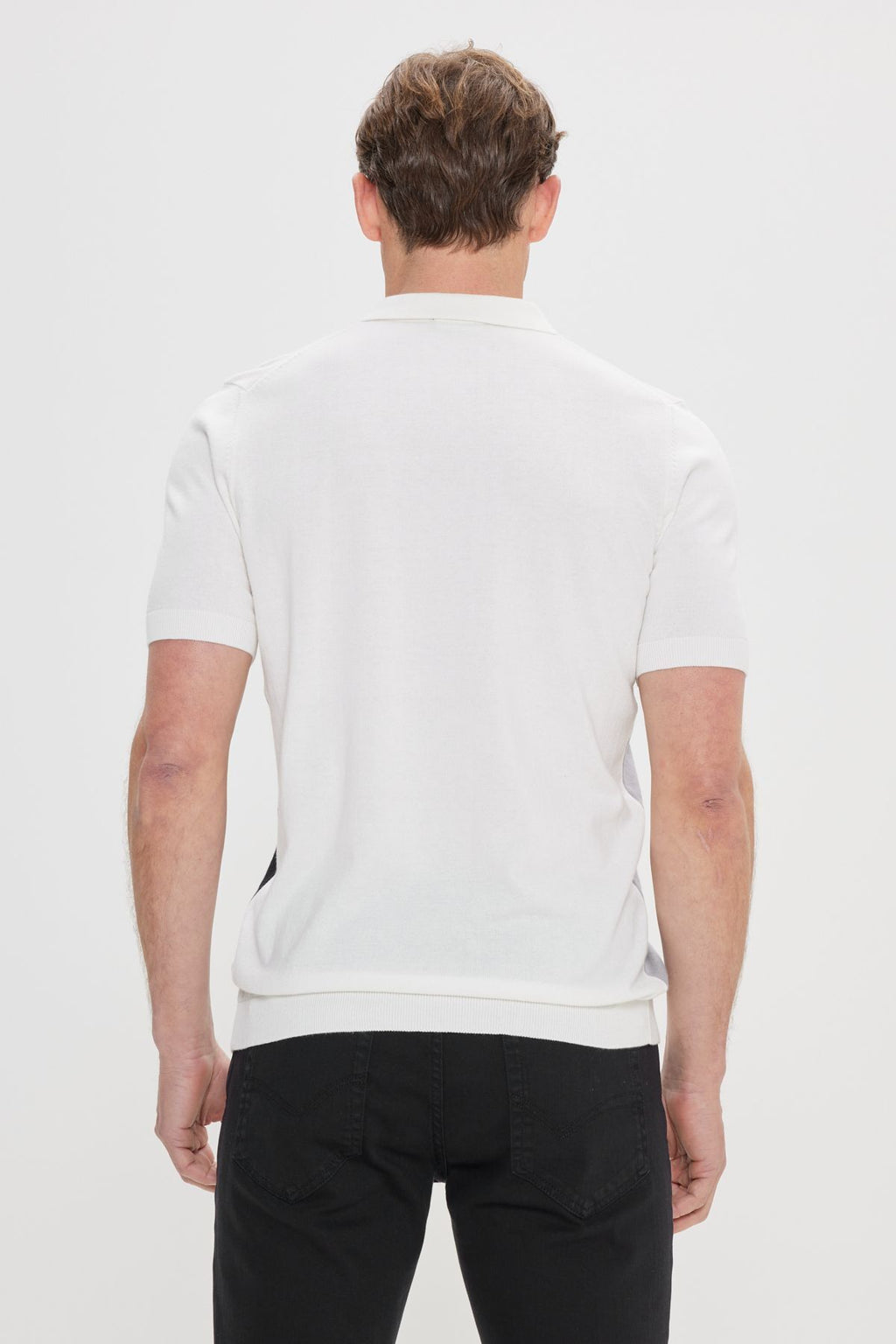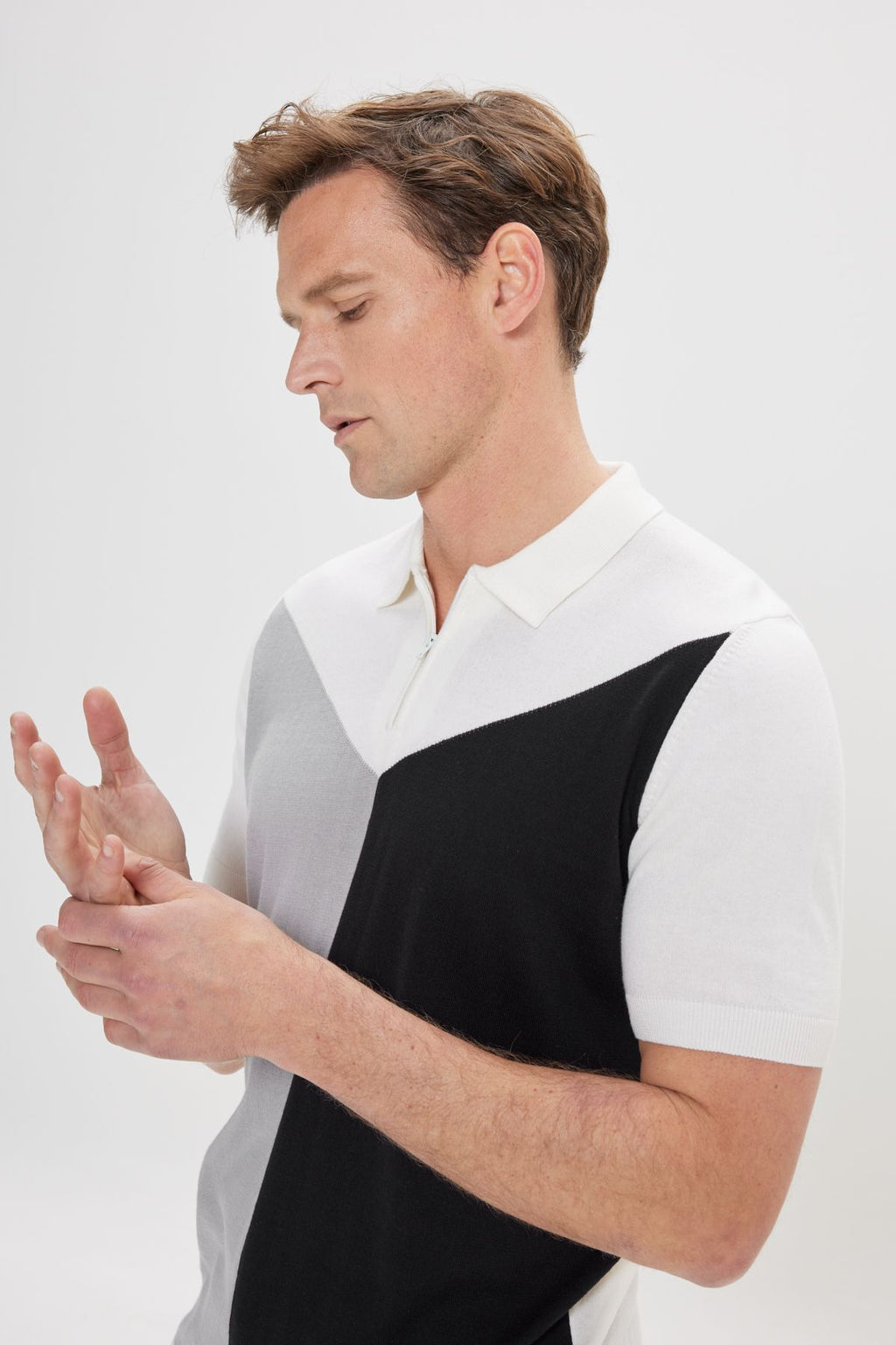 Men's ecru-gray standard fit normal cut 100 %cotton color block Polo Yaka knitwear T-shirt