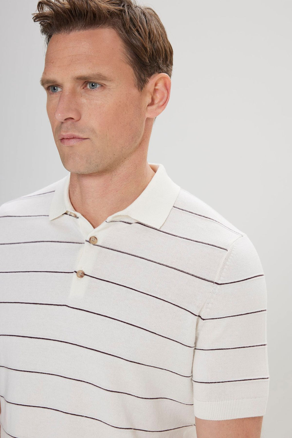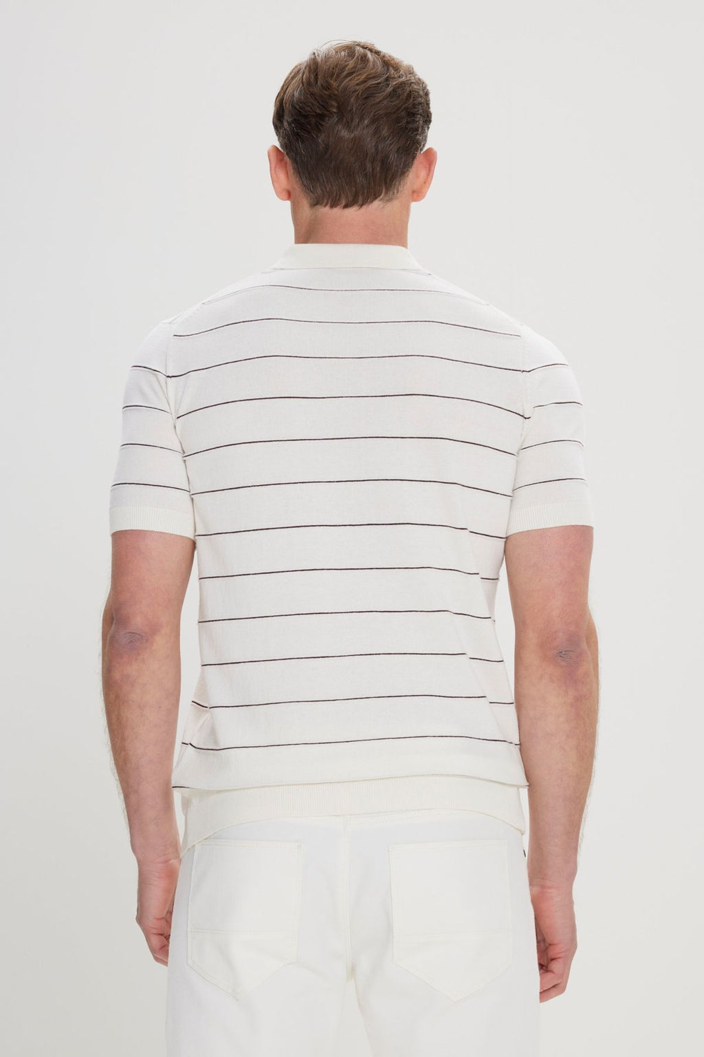 Men's Ecru-Kahve Standard Fit Normal Cutting 100 %Cotton striped Polo Yaka Triko T-shirt