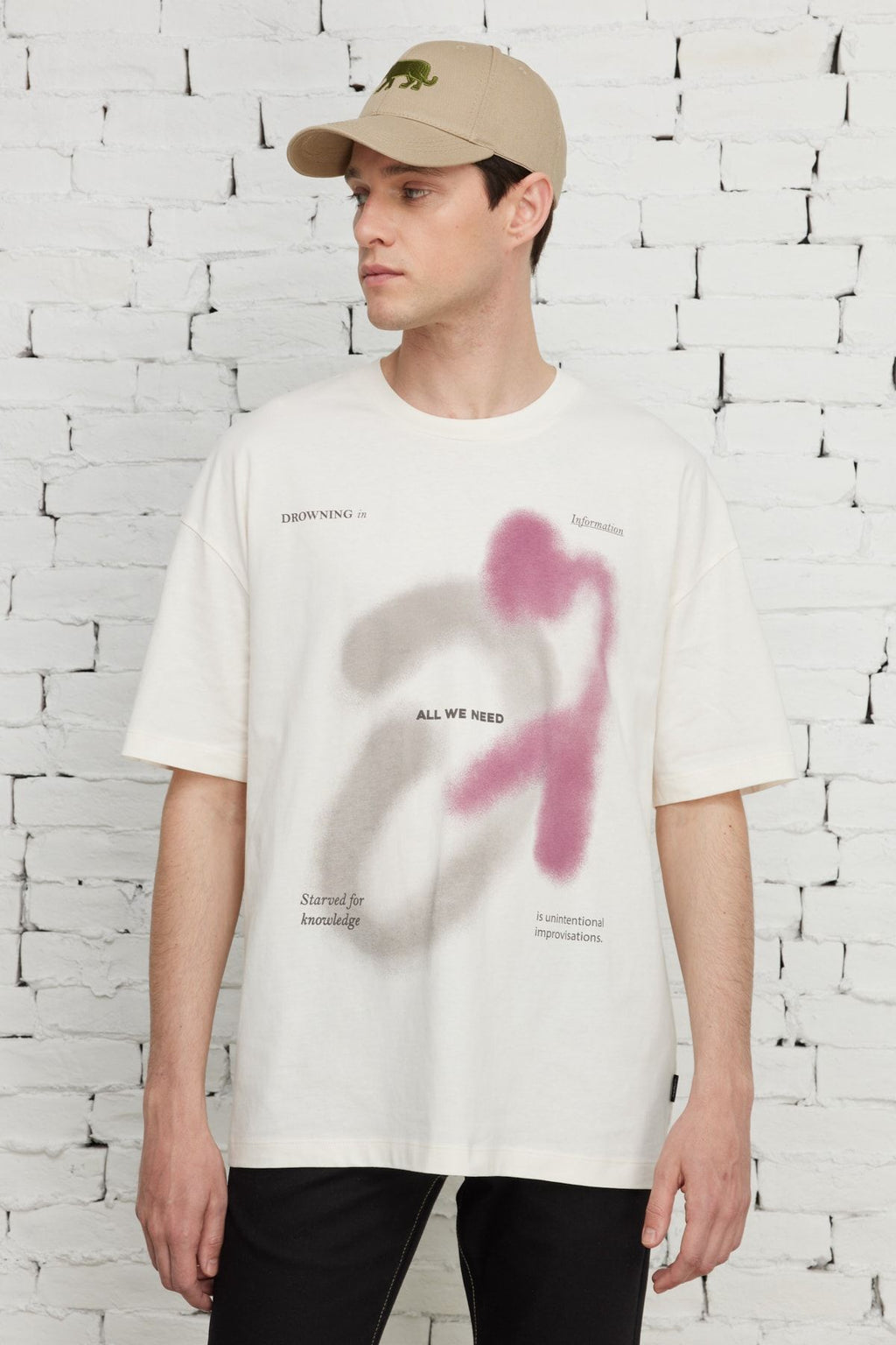 Men's Ecru Oversize plenty of cut bike collar 100 %cotton printed T -shirt
