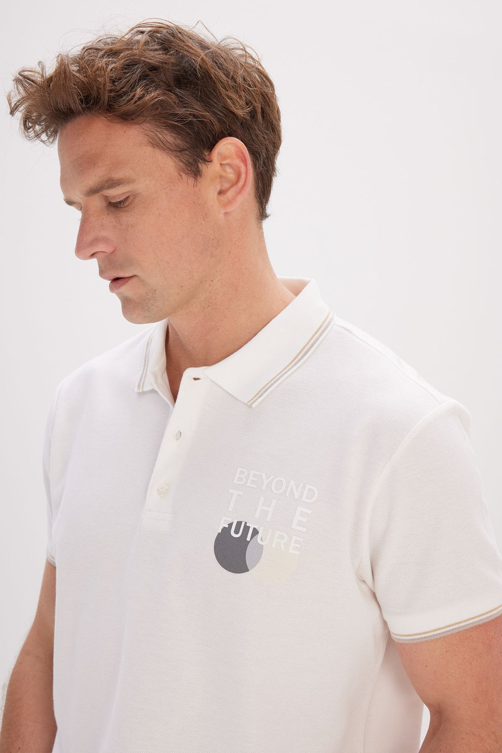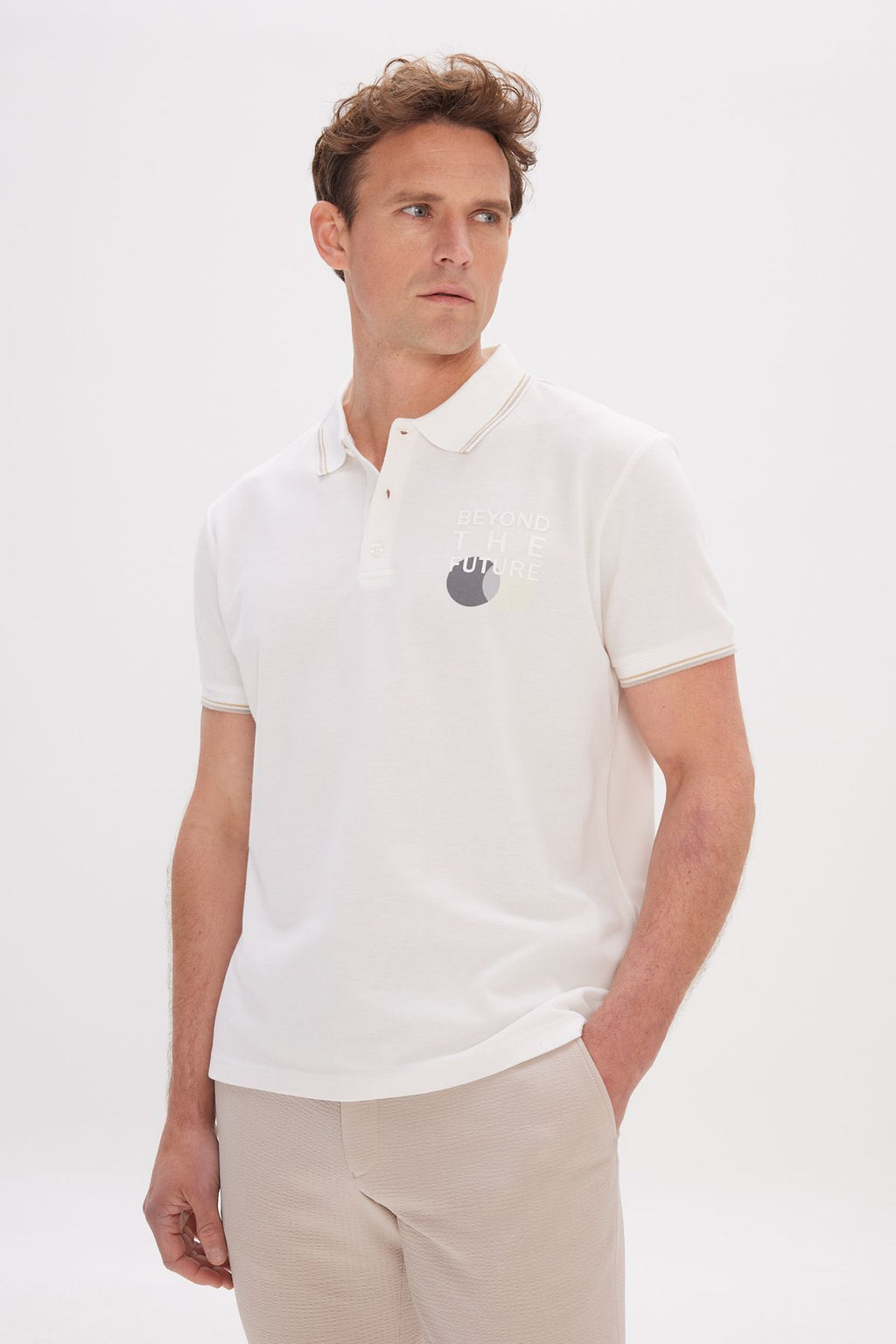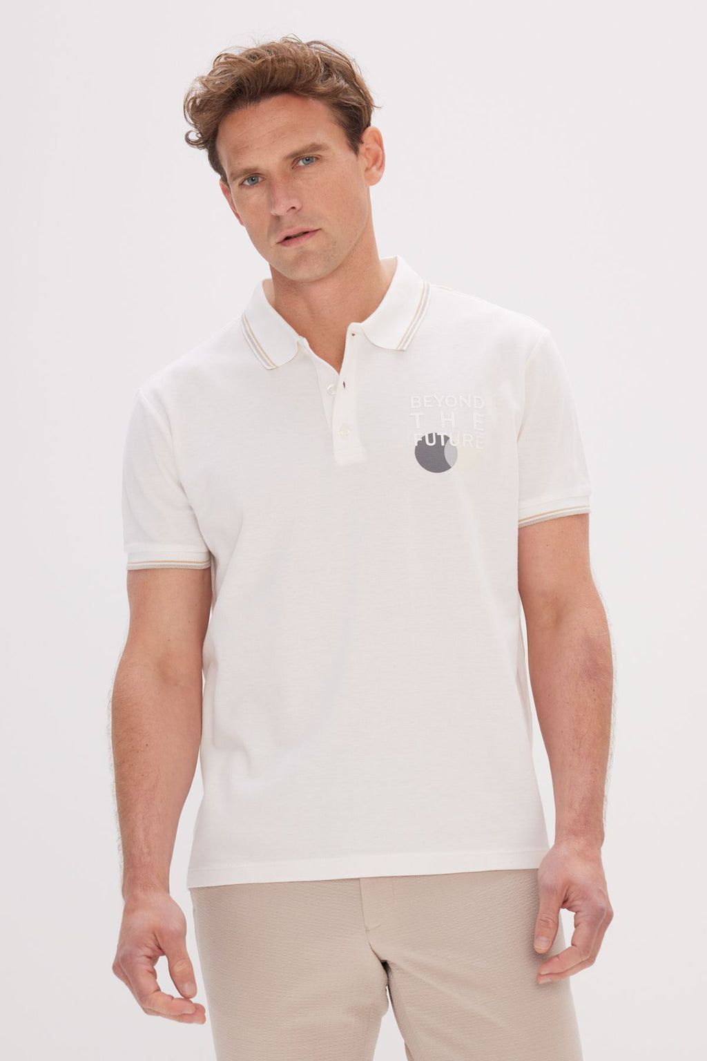 Men's Ecru Standard Fit Normal Cutting 100 %Cotton Printed Polo Yaka T -shirt
