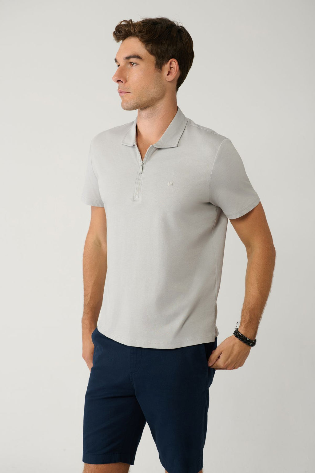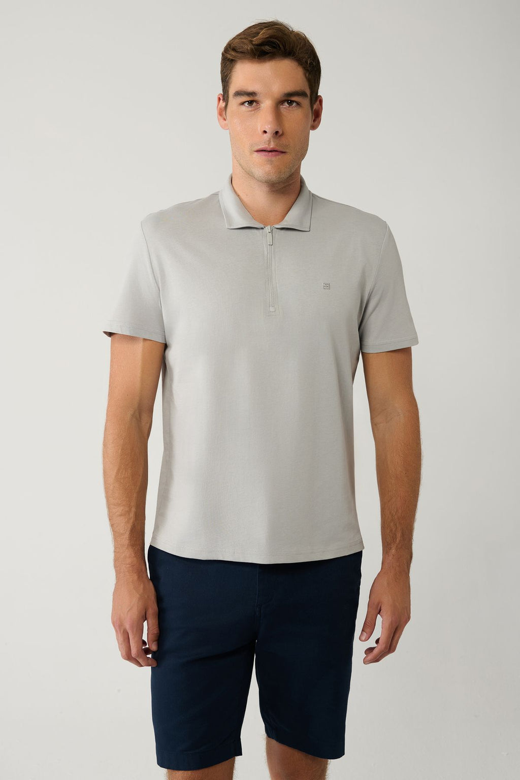 Men's Gray 100 %Cotton Zippered Polo Yaka T-shirt E001034