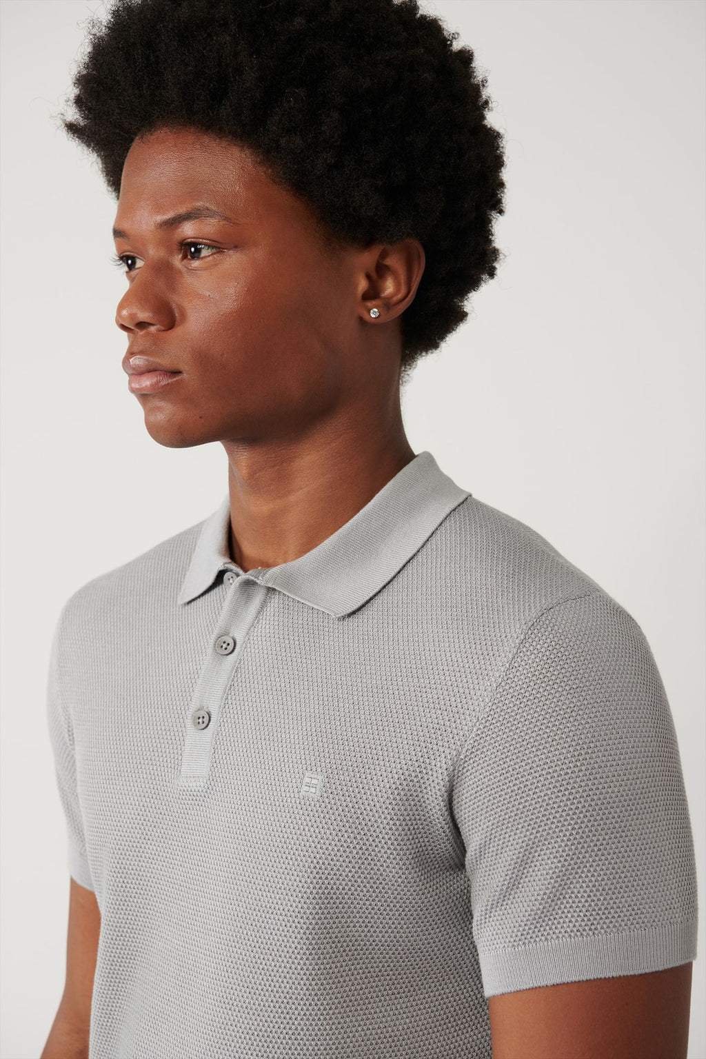 Men's gray 3 button textured riban Polo Yaka Triko T-Shirt B005009