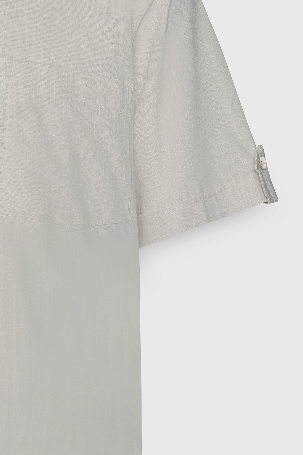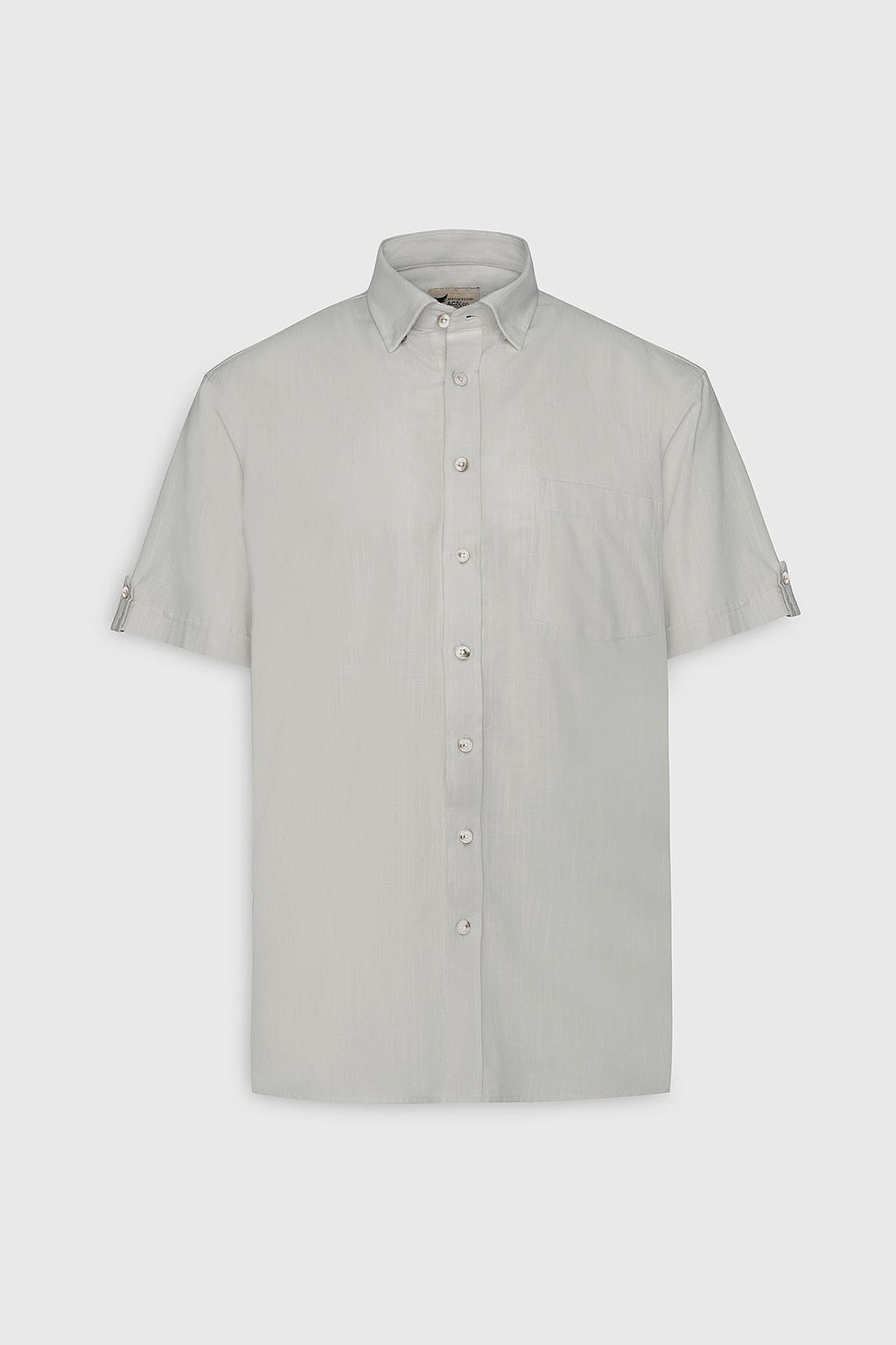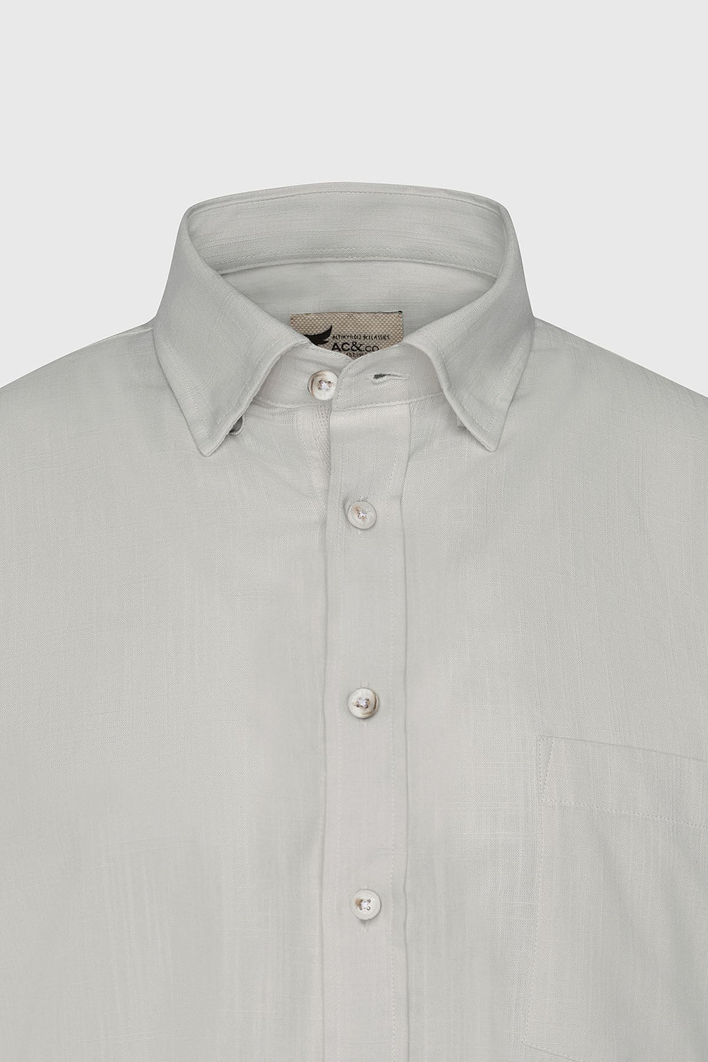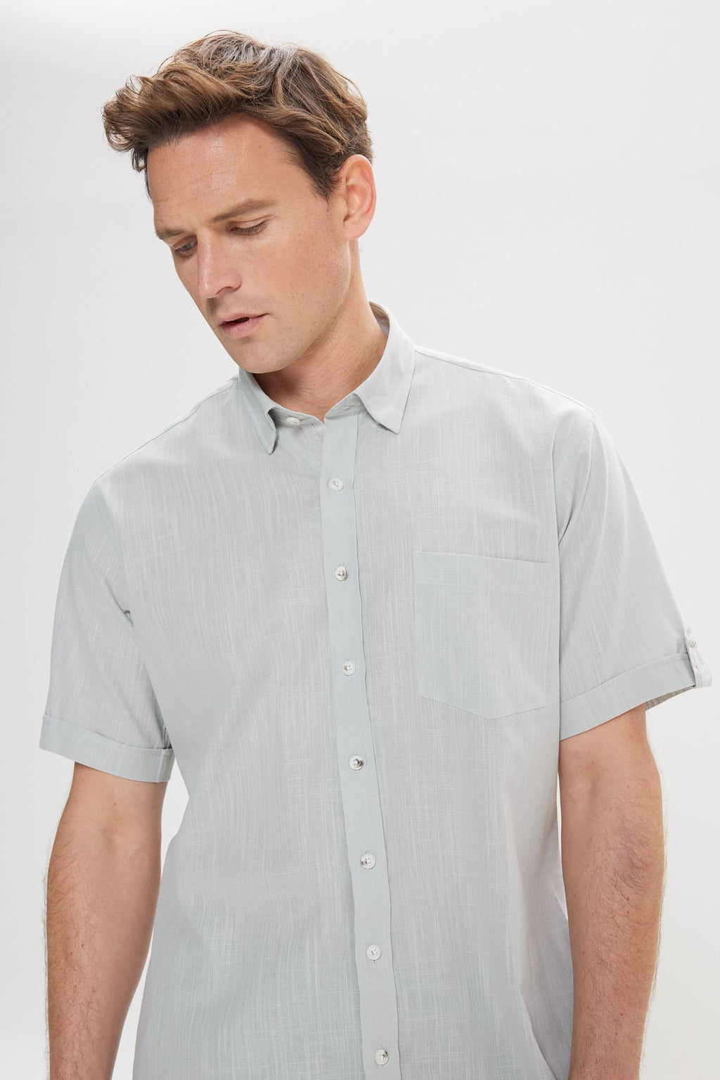 Men's Gray Comfort Fit Casual Cutting Buttoned Neck Linen Looking 100 %Cotton Planned Short Sleeve Shirt