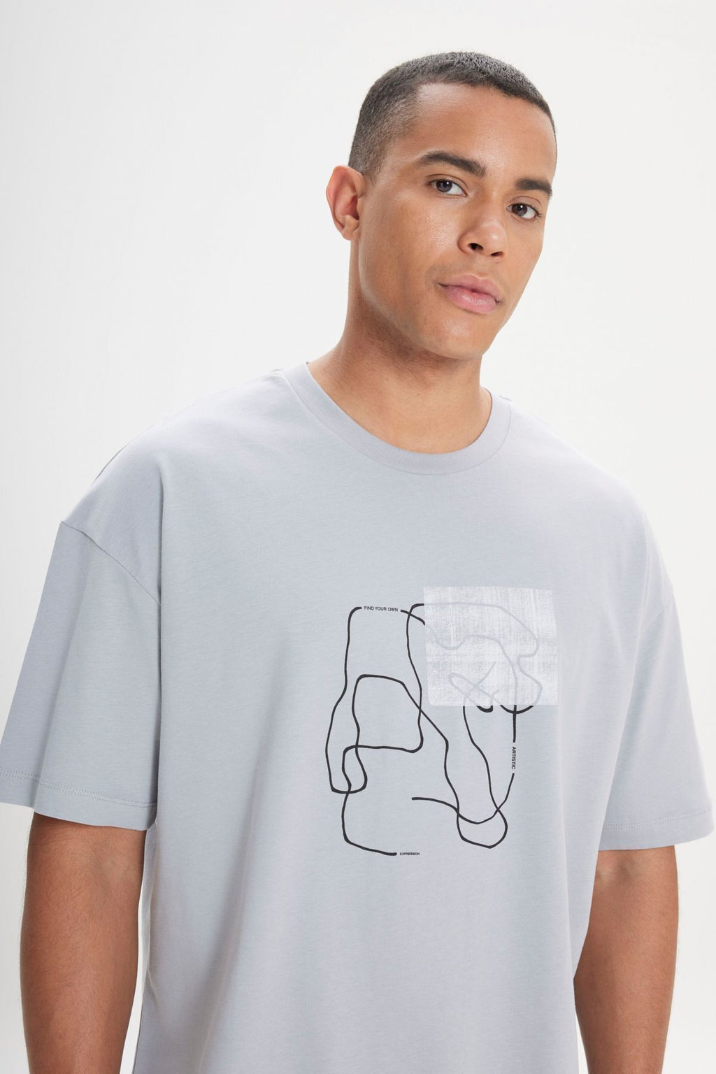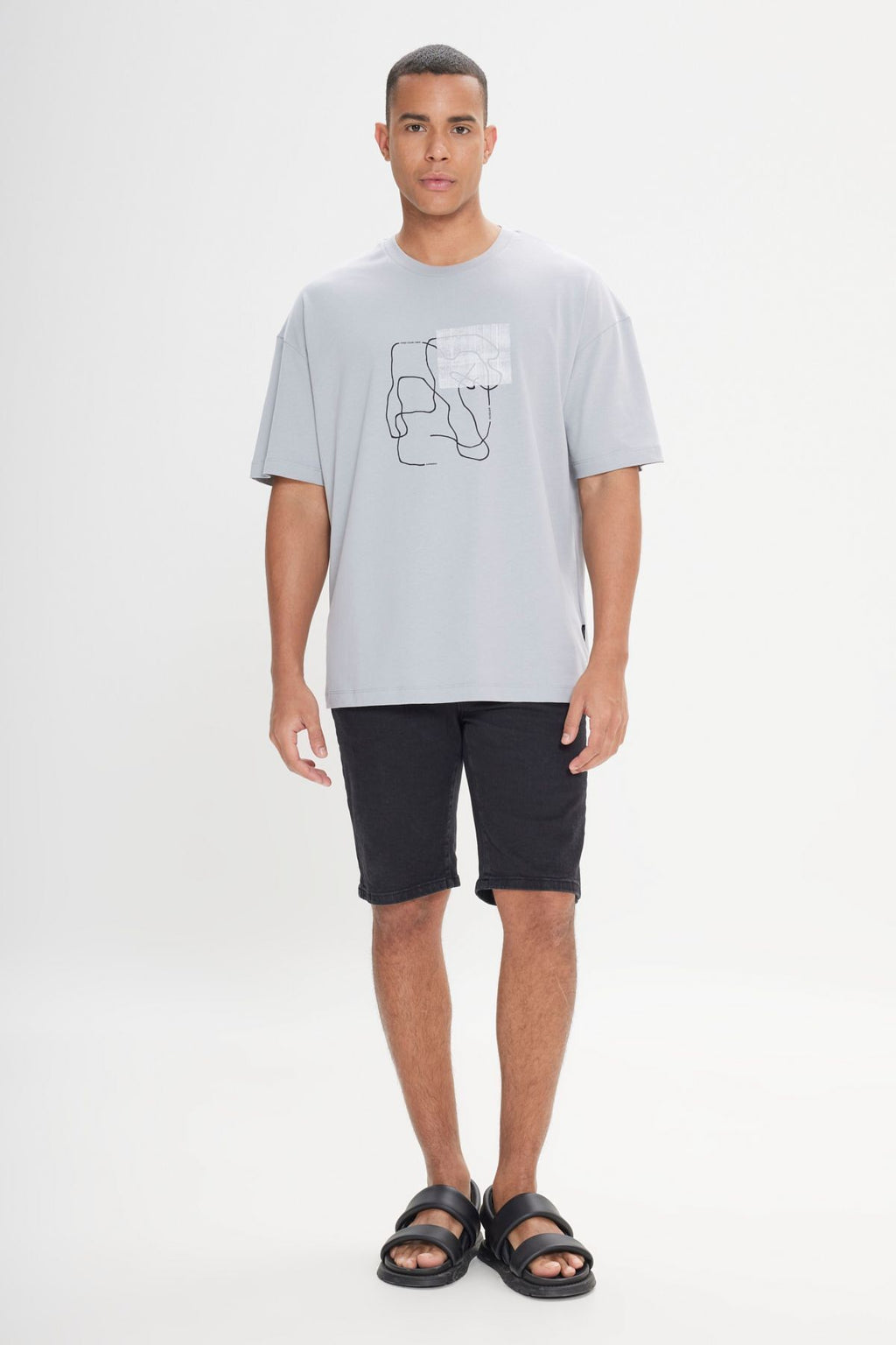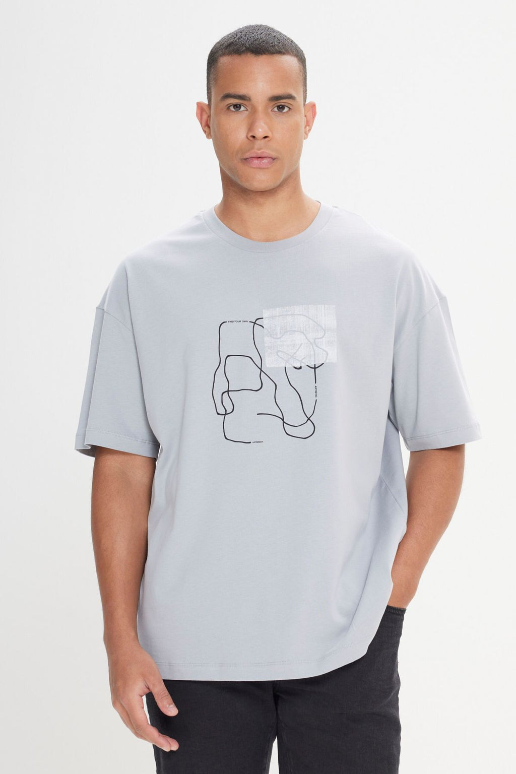 Men's Gray Oversize plenty of cut bike collar 100 %cotton printed T -shirt
