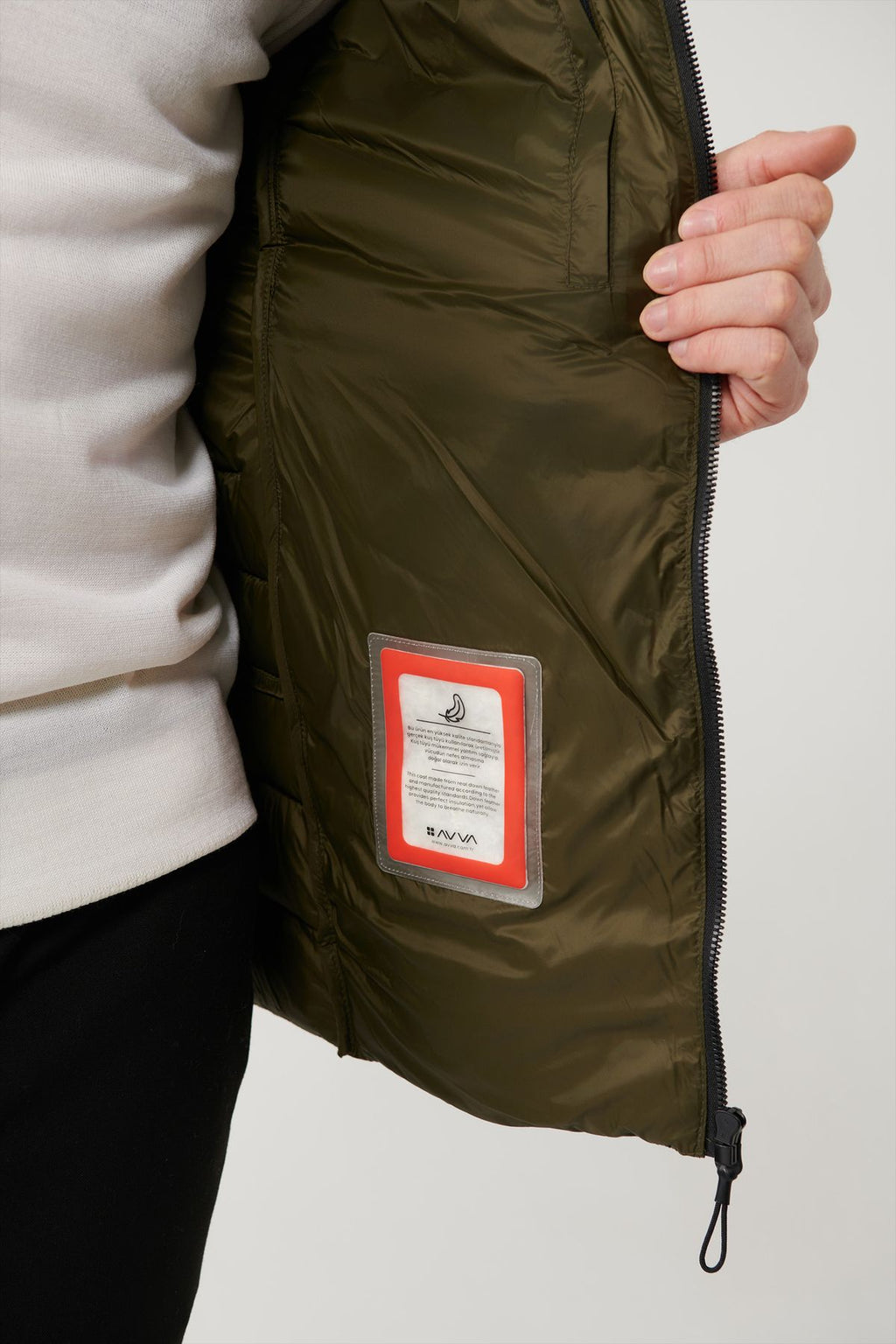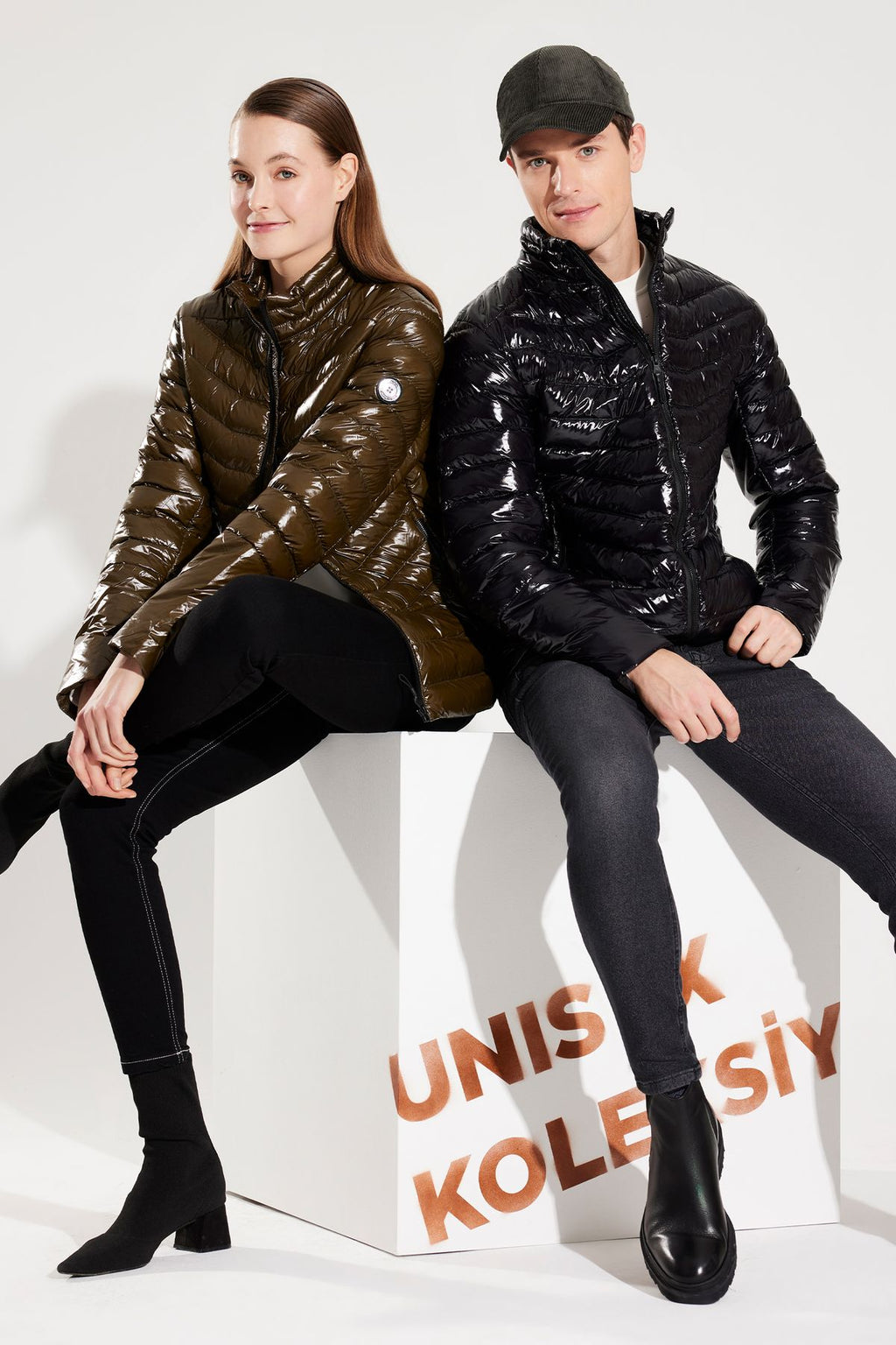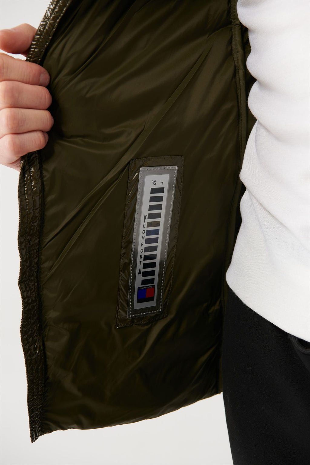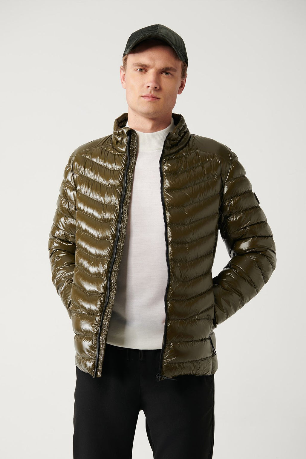 Men's Khaki Goose Feather Water Protector Windproof Fabric vertical collar bright swelling coat B006015