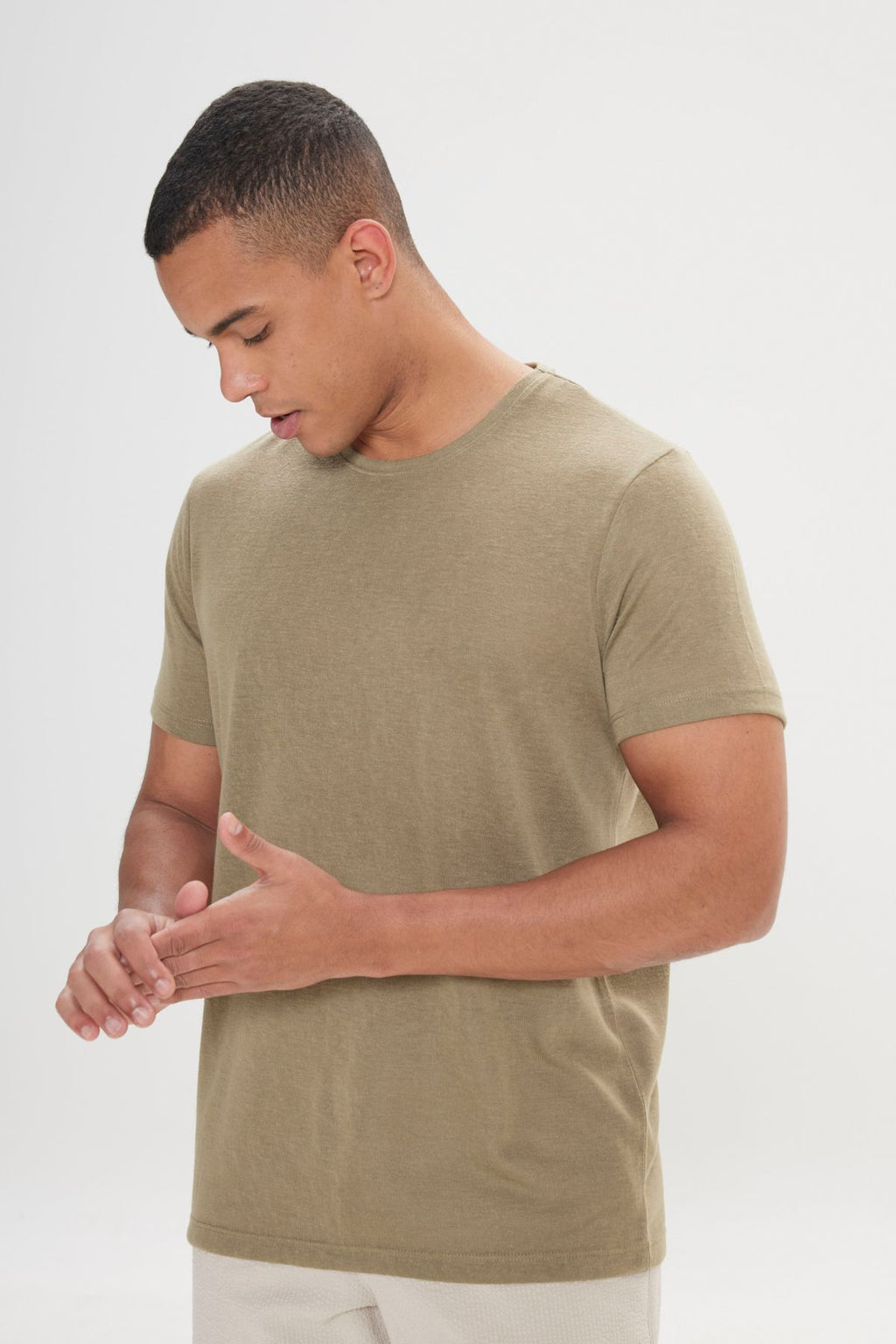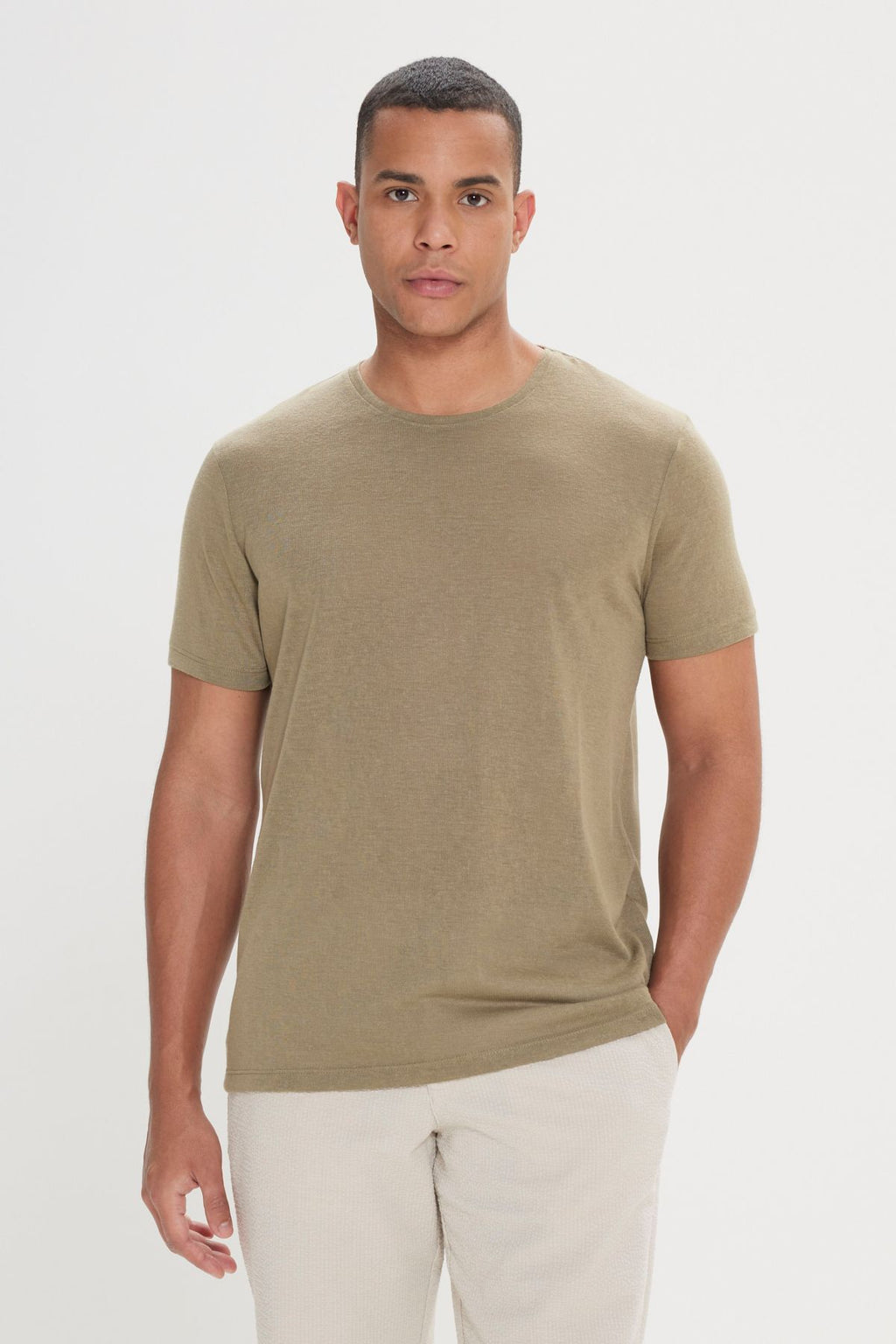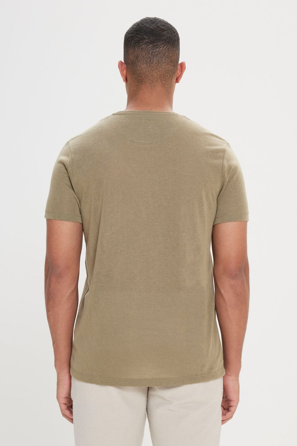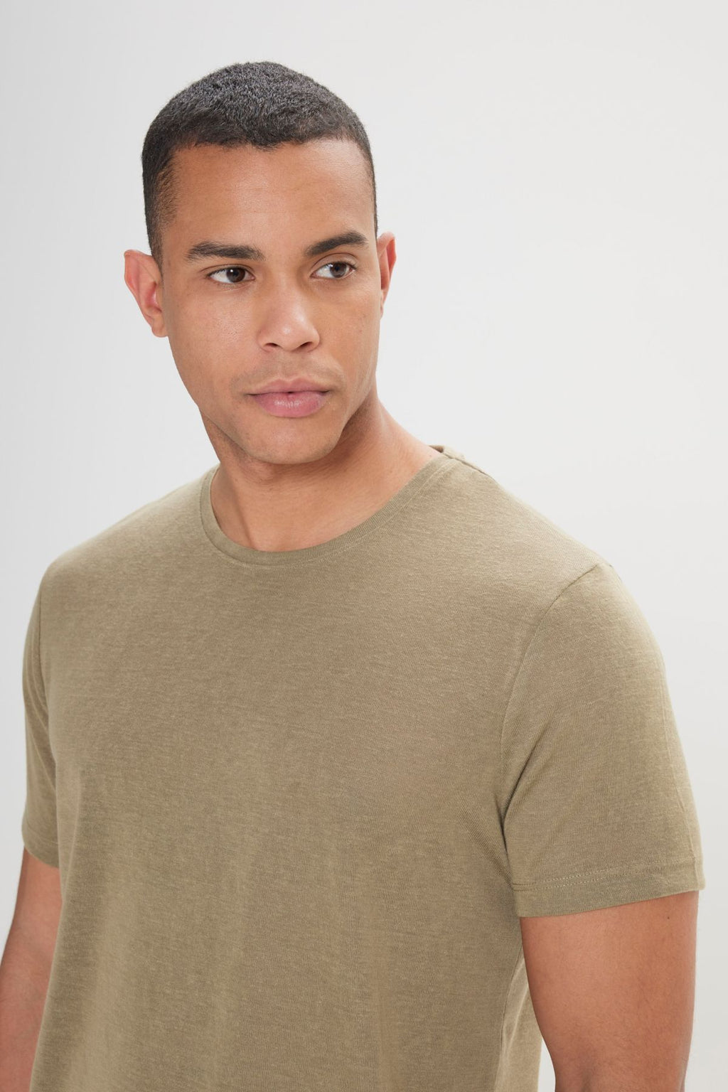 Men's Khaki Slim Fit Narrow Cut Bike Bike Neck Linen Looking T -shirt