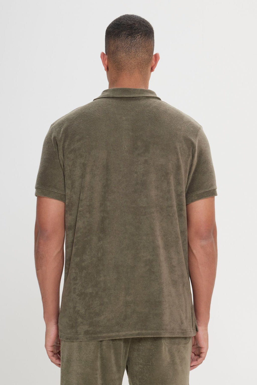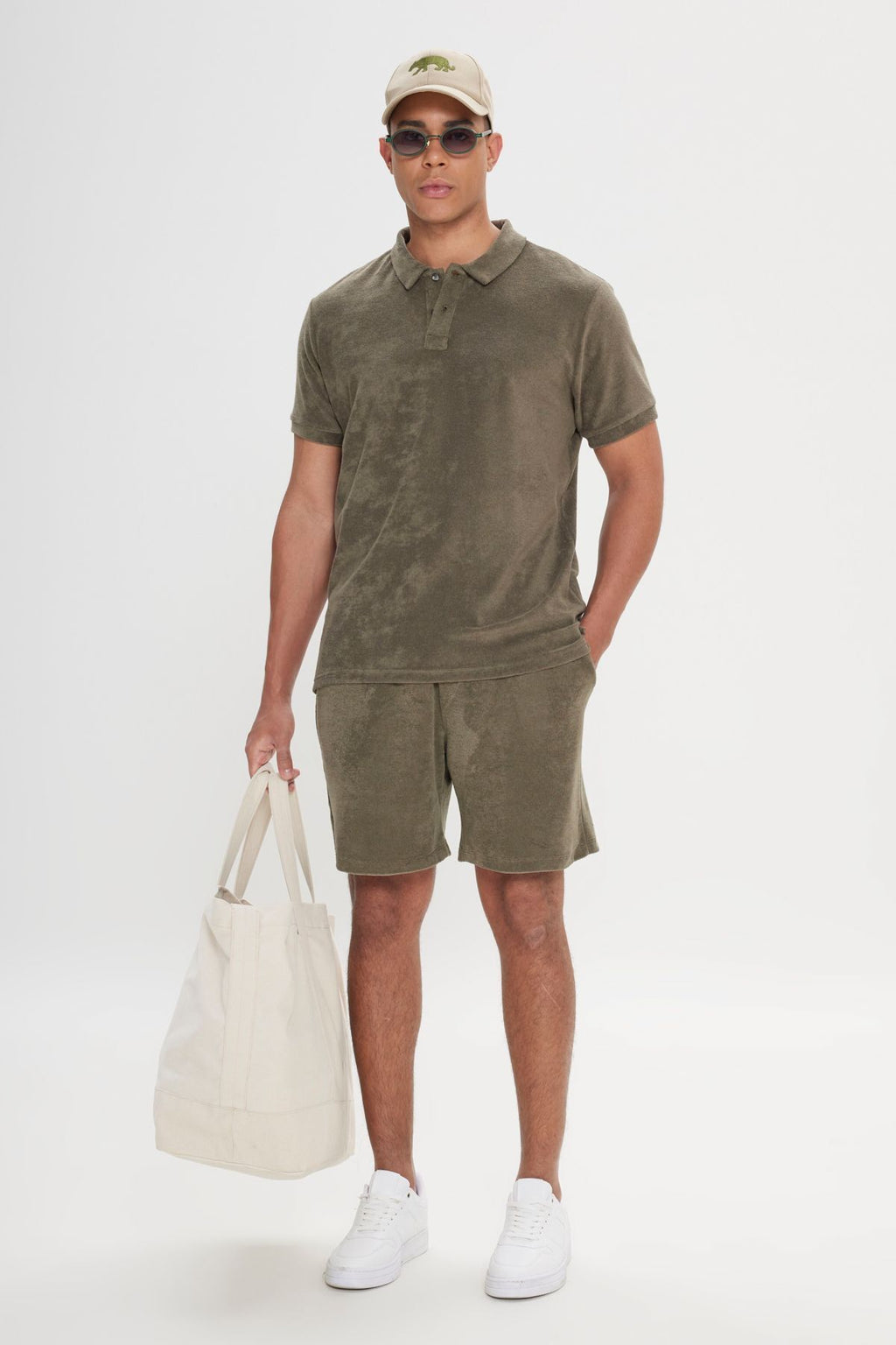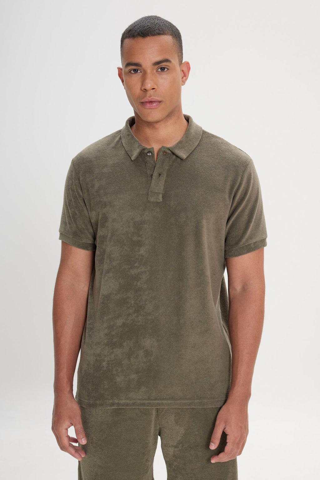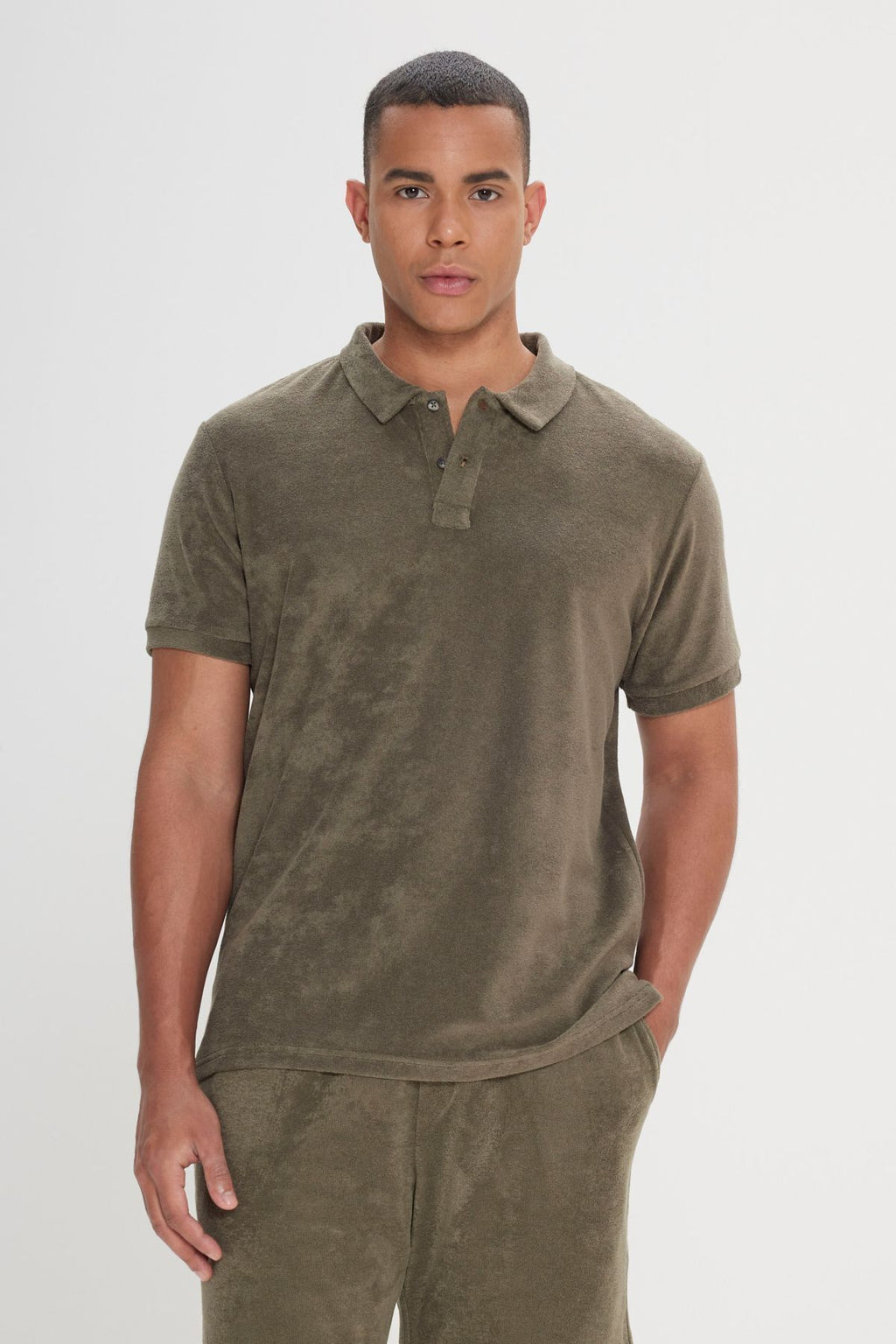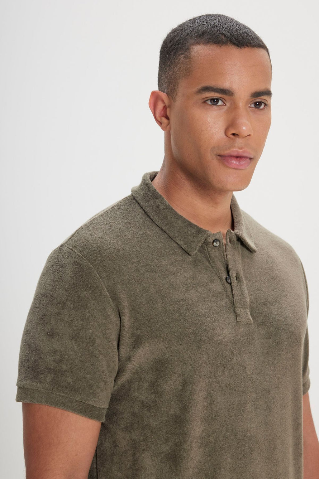 Men's Khaki Slim Fit Narrow Cut Cotton Towel Fabric Polo Yaka T -shirt