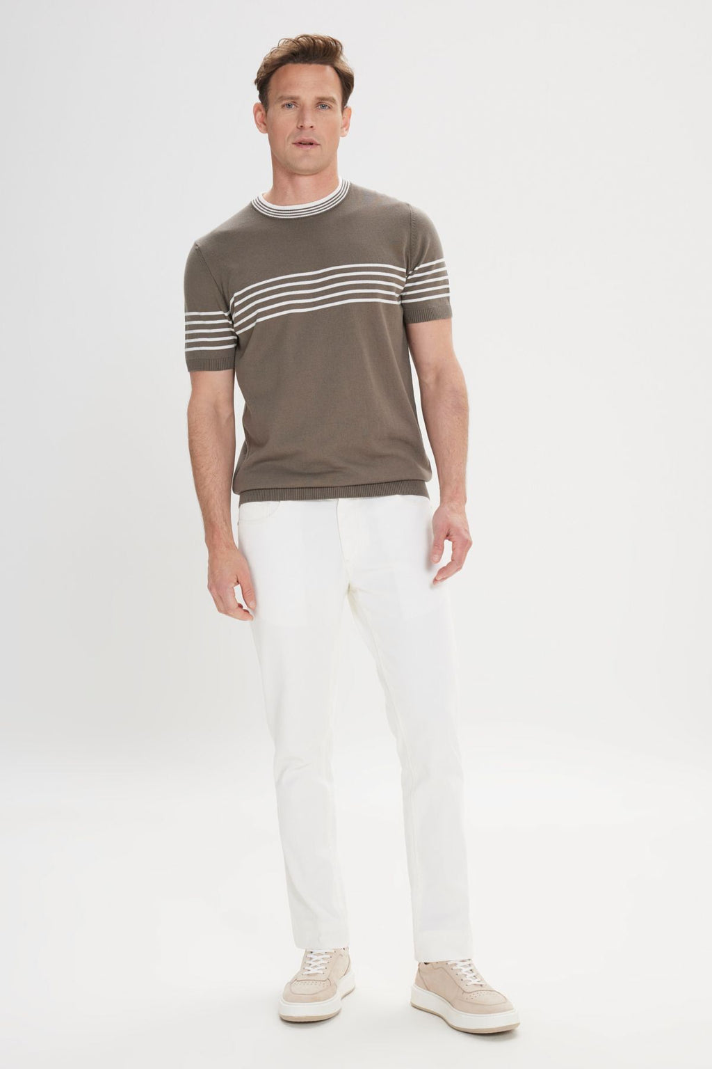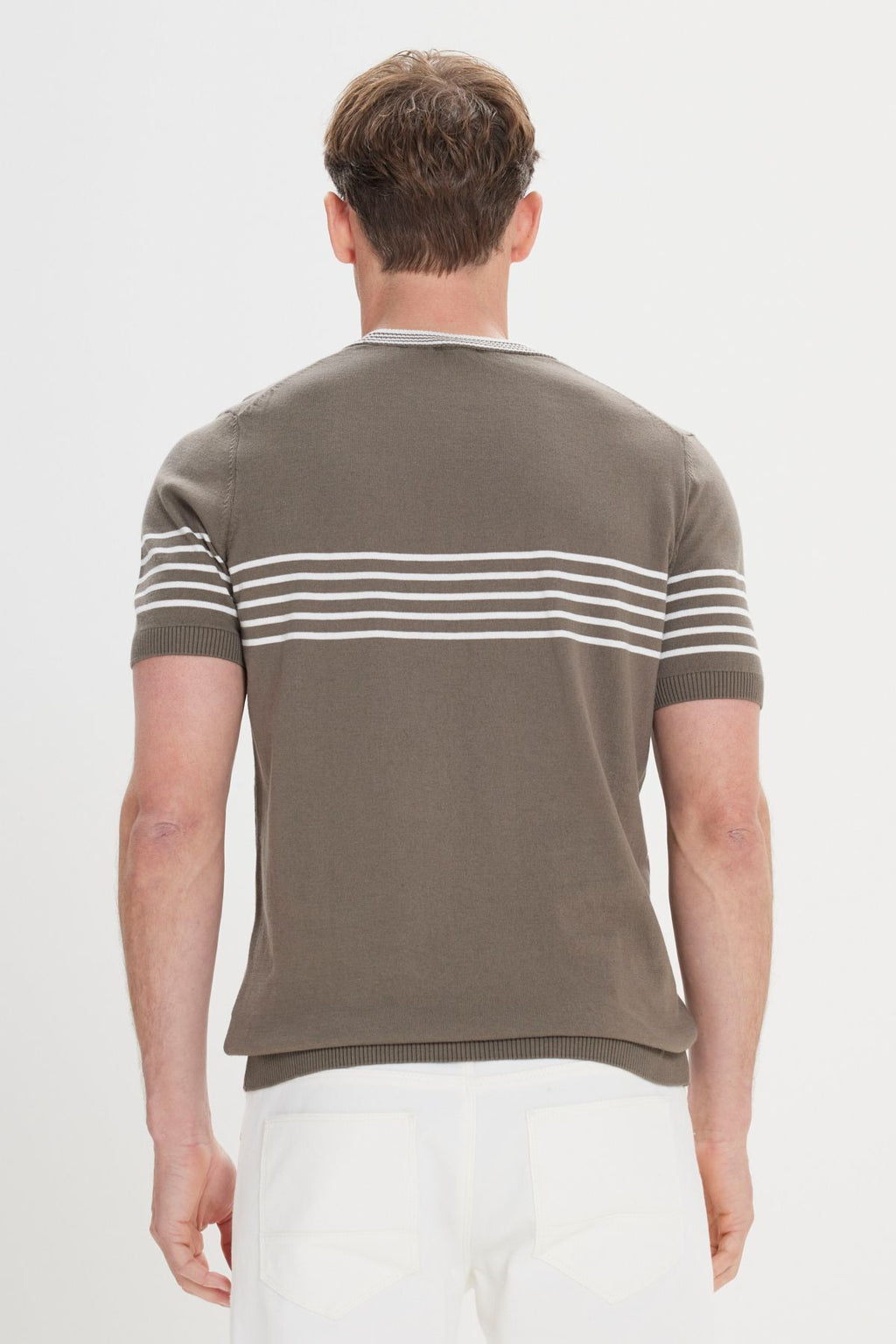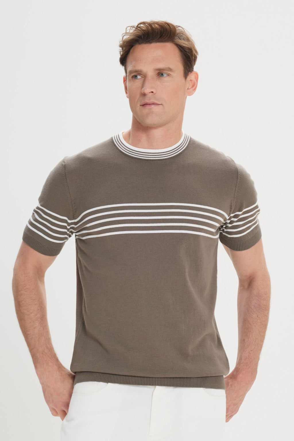Men's Khaki-White Standard Fit Normal Cutting 100 %Cotton Striped Bicycle Yaka Triko T-shirt