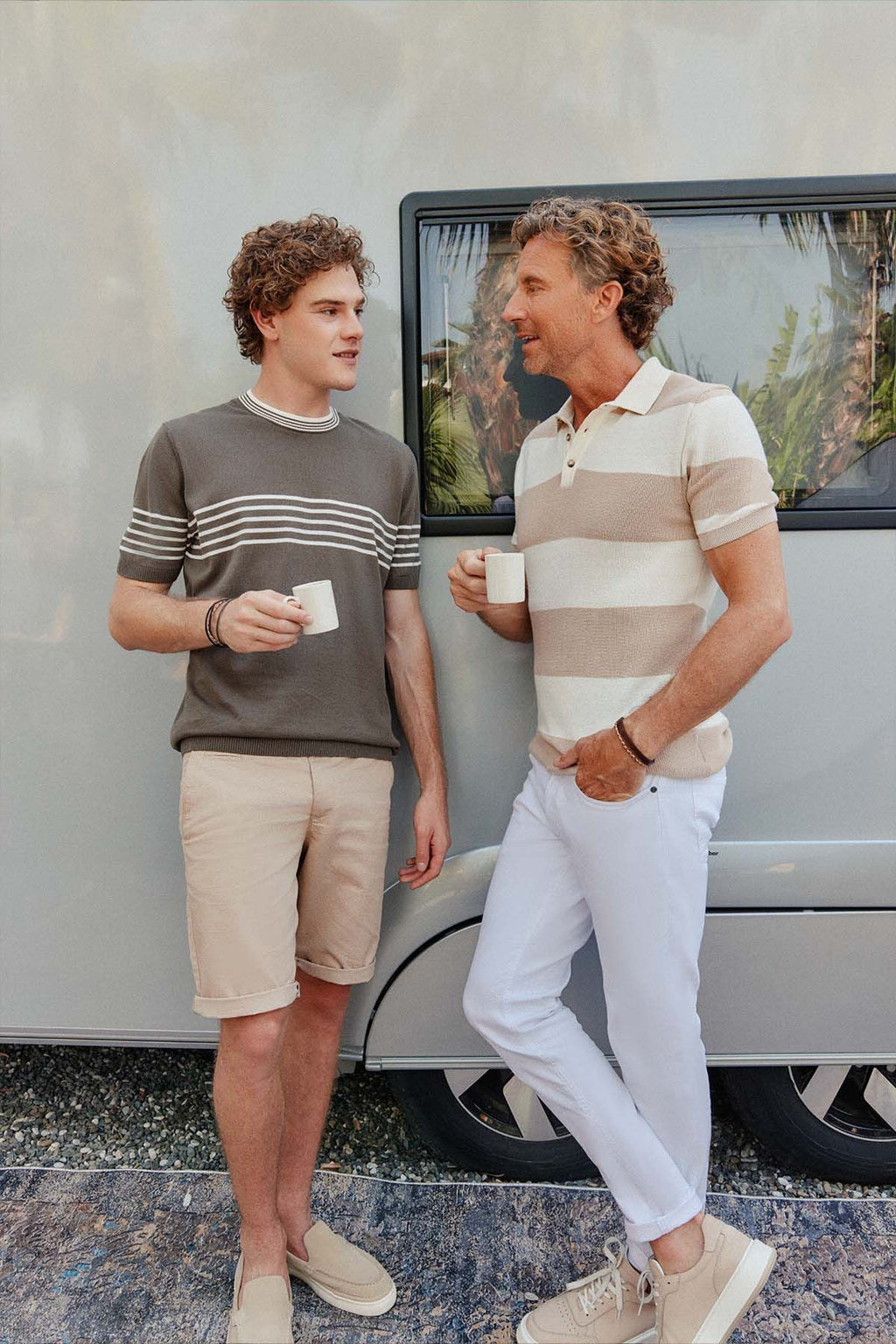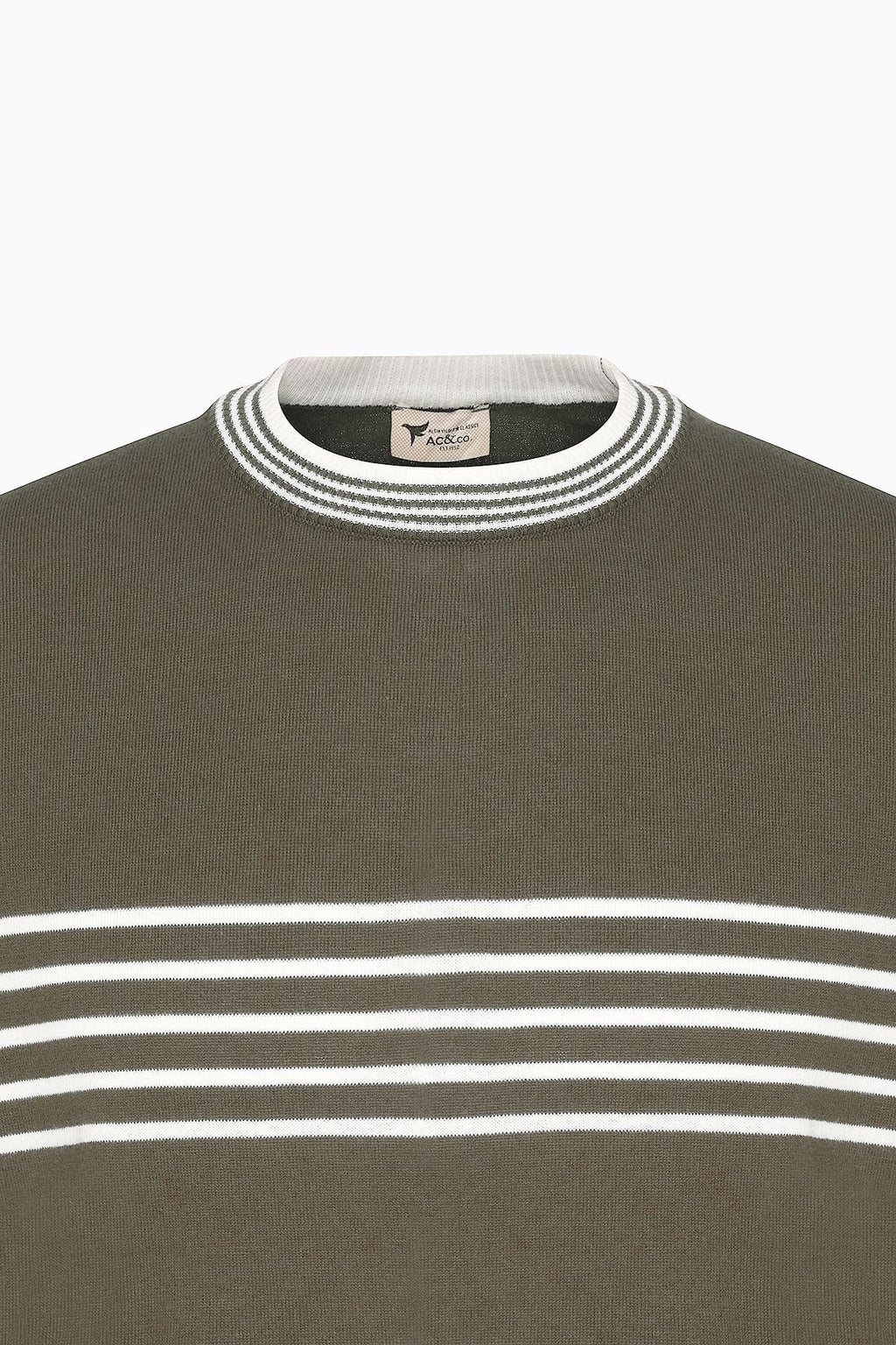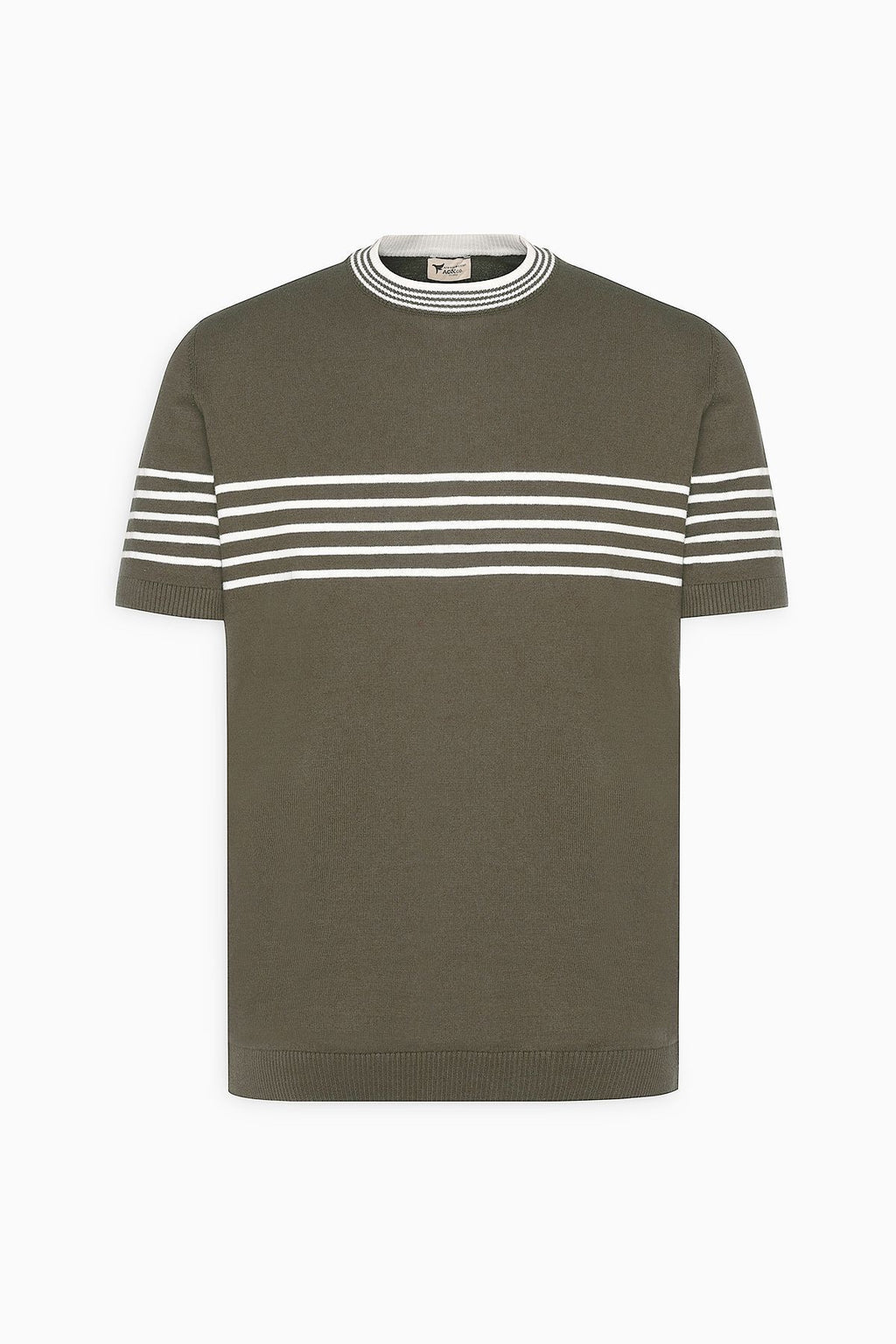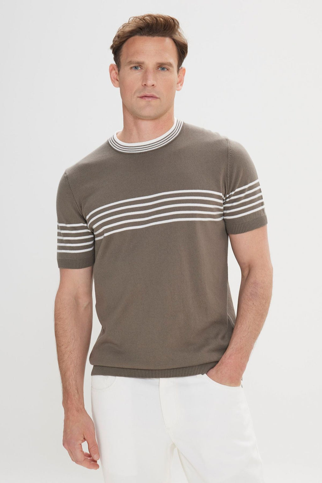 Men's Khaki-White Standard Fit Normal Cutting 100 %Cotton Striped Bicycle Yaka Triko T-shirt