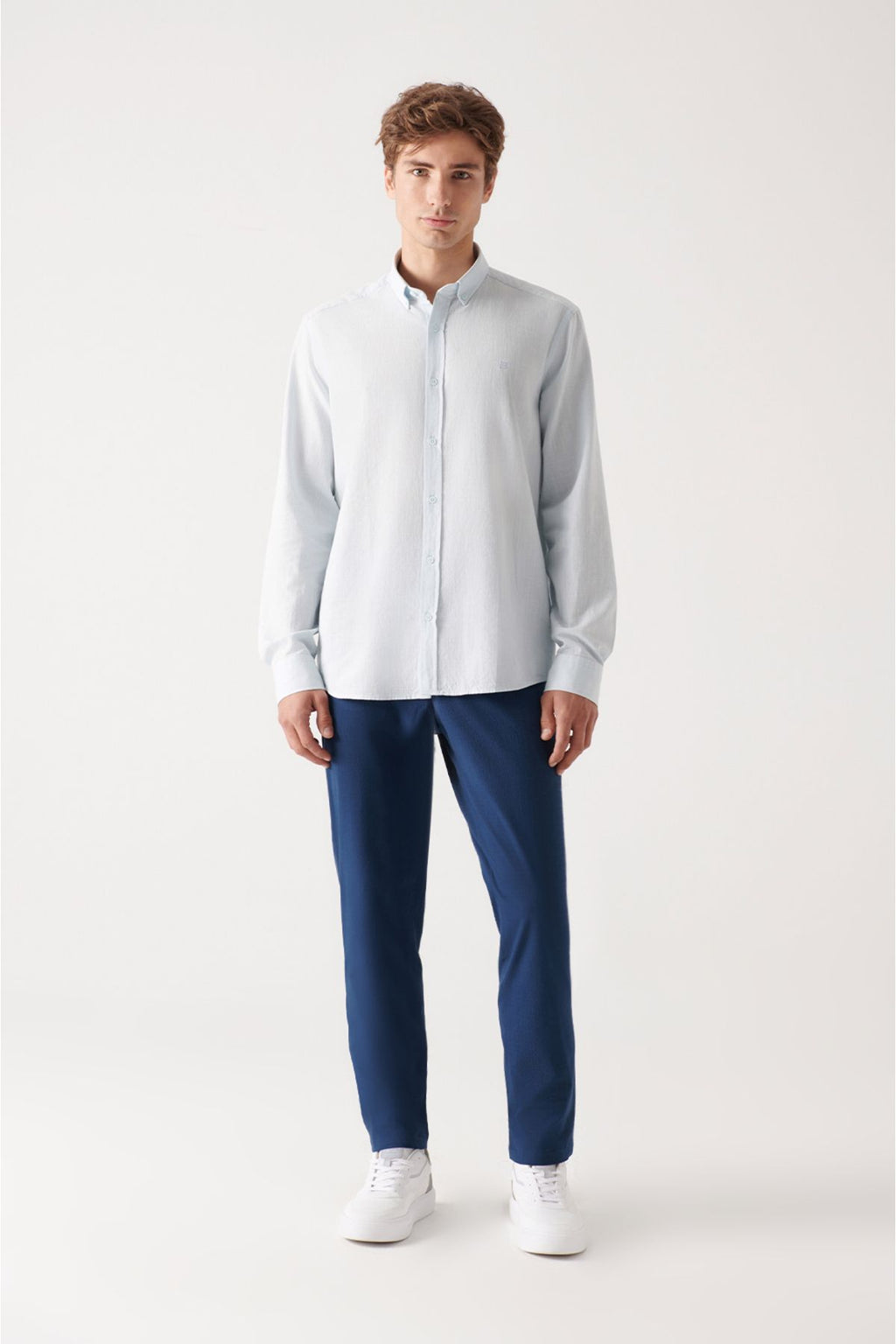 Men's light blue button collar 100 %cotton linen textured shirt E002141