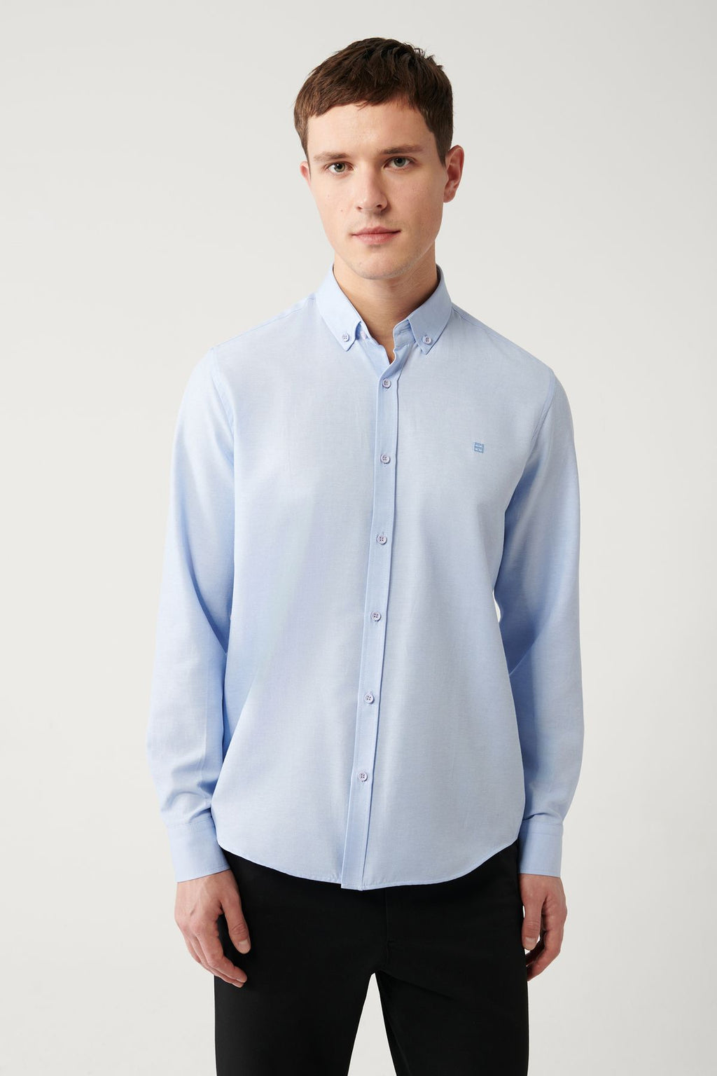 Men's light blue button collar easy to ironing cotton Oxford Shirt E002000