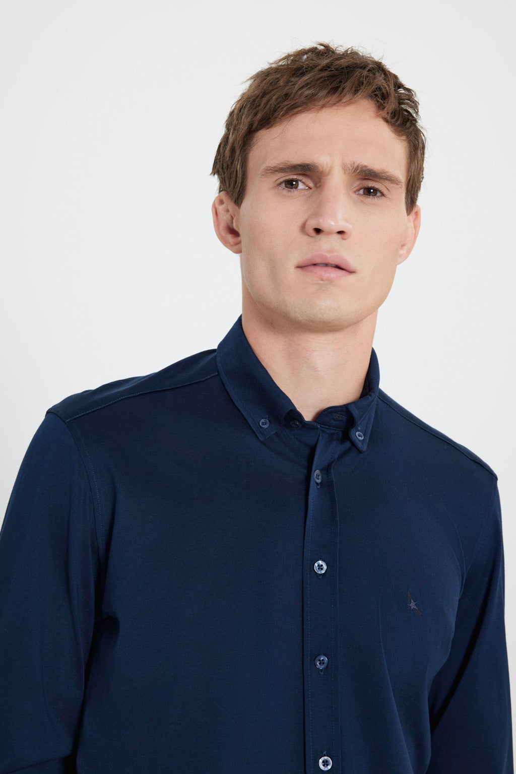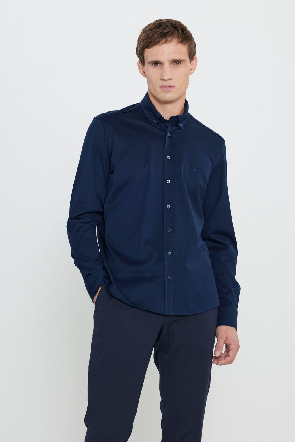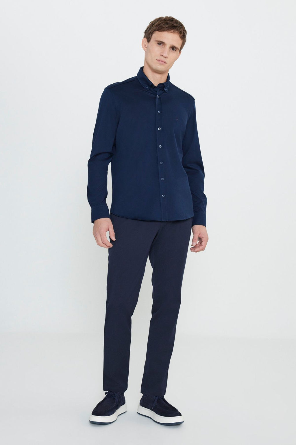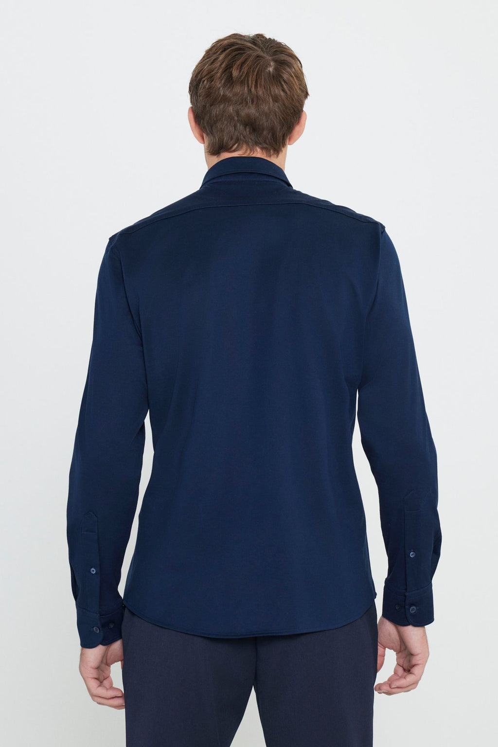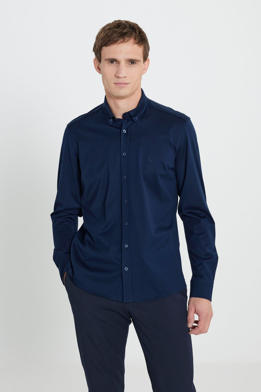 Men's Navy Blue 100 %Cotton Slim Fit Narrow Cutting Buttoned Neck Knitting Shirt