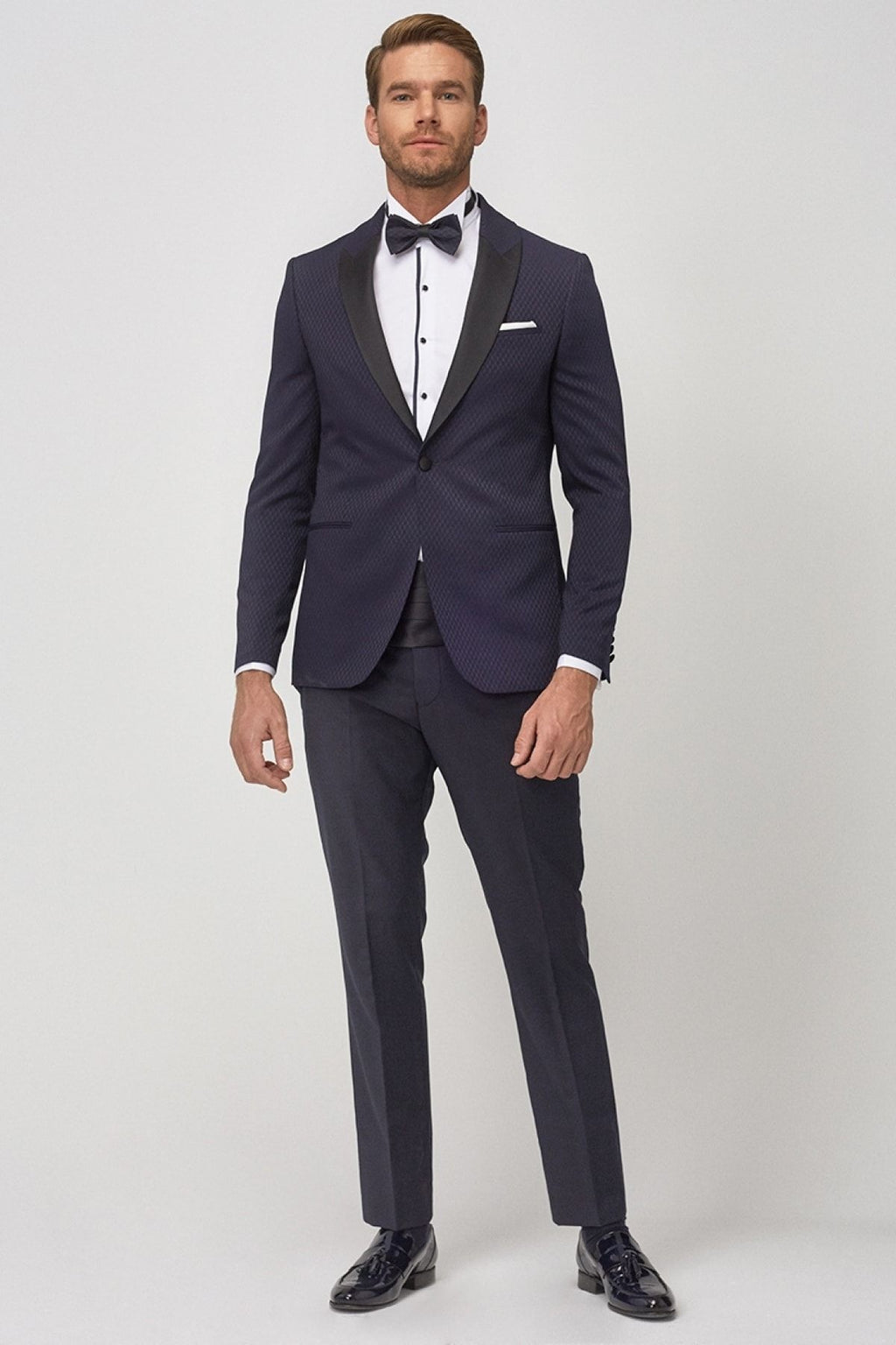 Men's Navy Blue-Black Slim Fit Patterned Tuxedo Groom