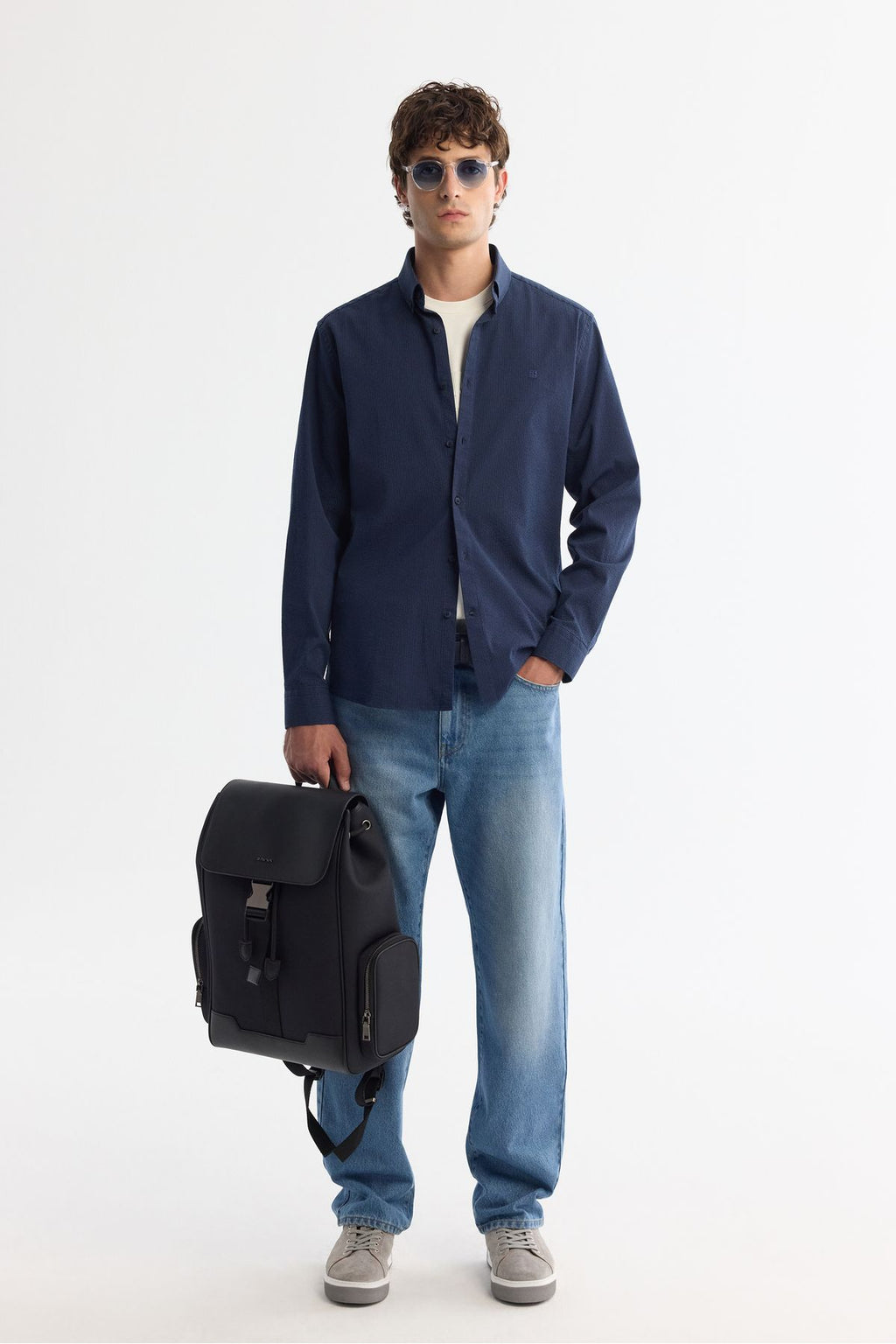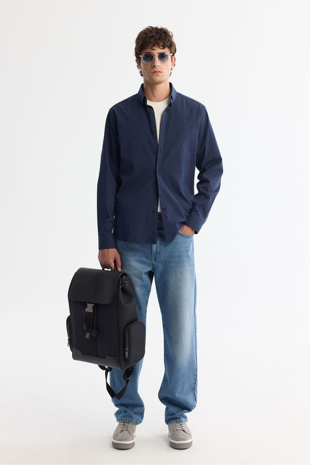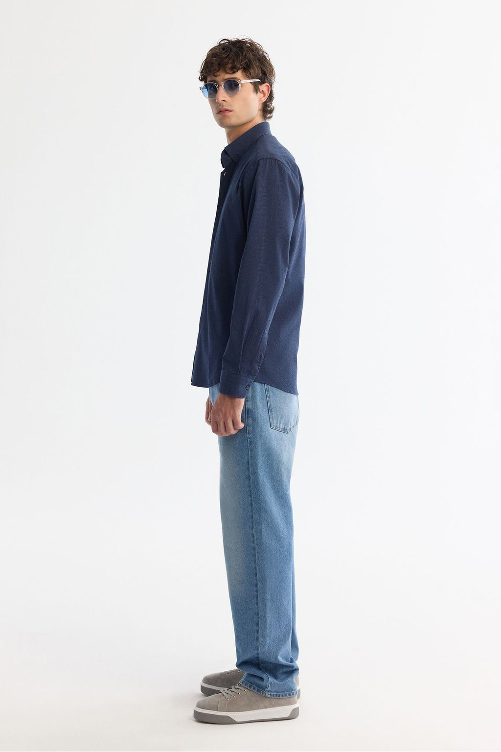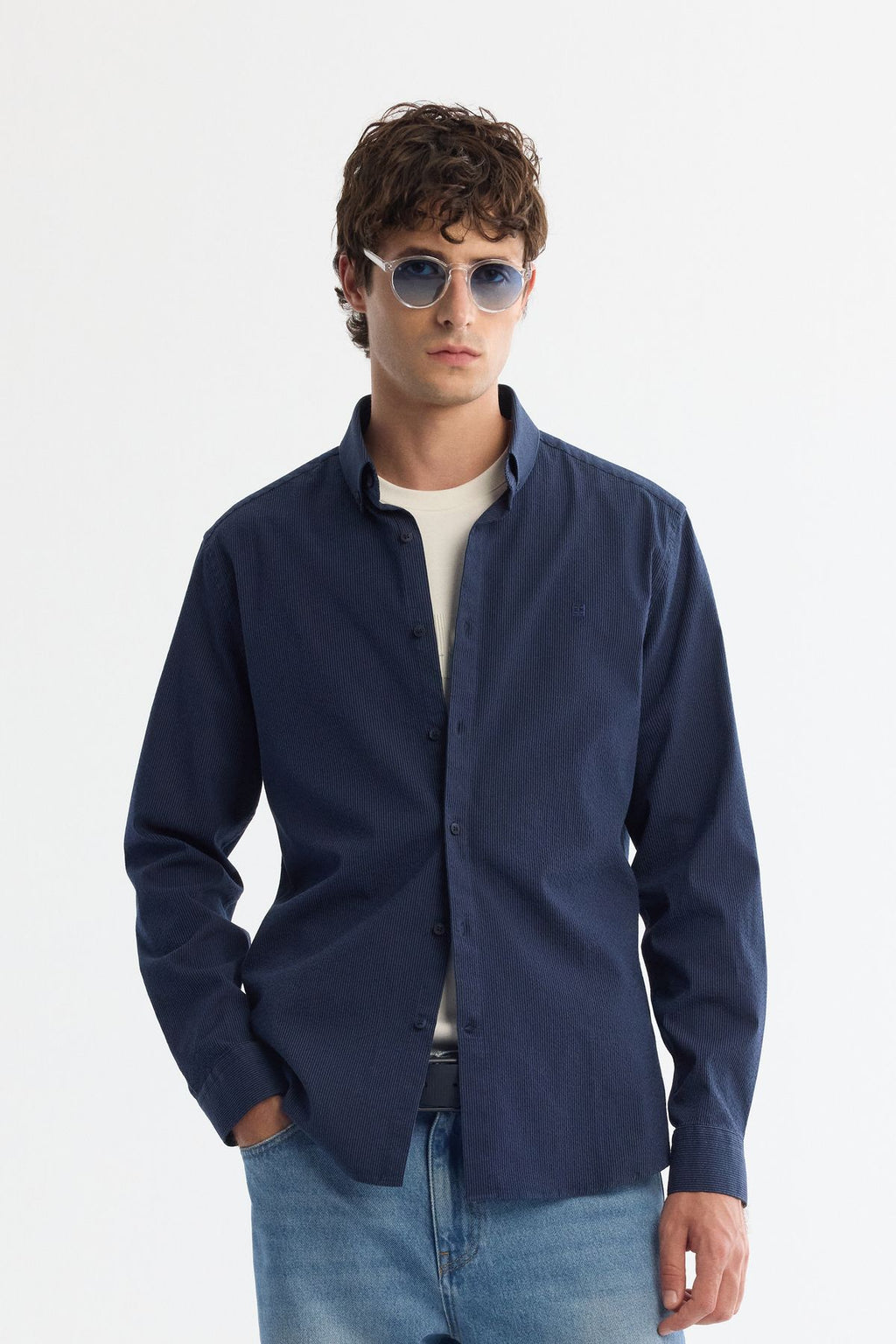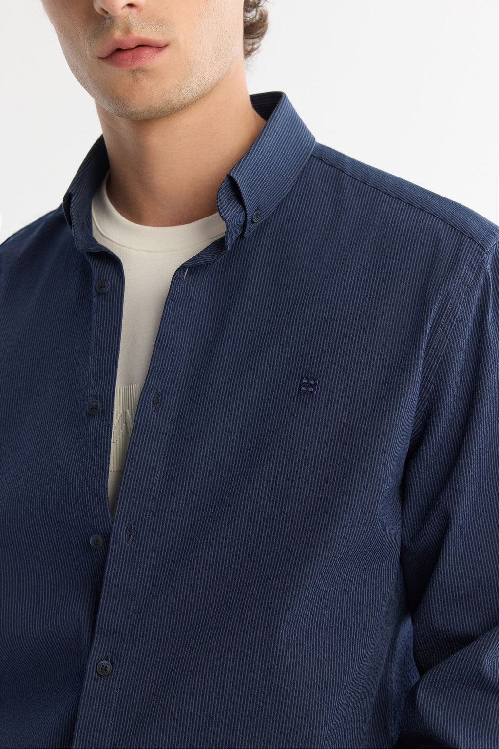 Men's Navy Blue Button Neck Easy ironable striped shirt A42Y2098