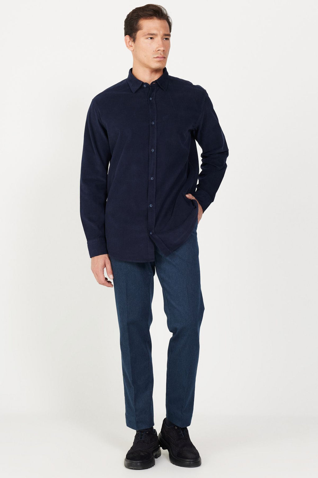 Men's Navy Blue Comfort Fit Casual Cut Hidden buttoned collar 100 %cotton shirt
