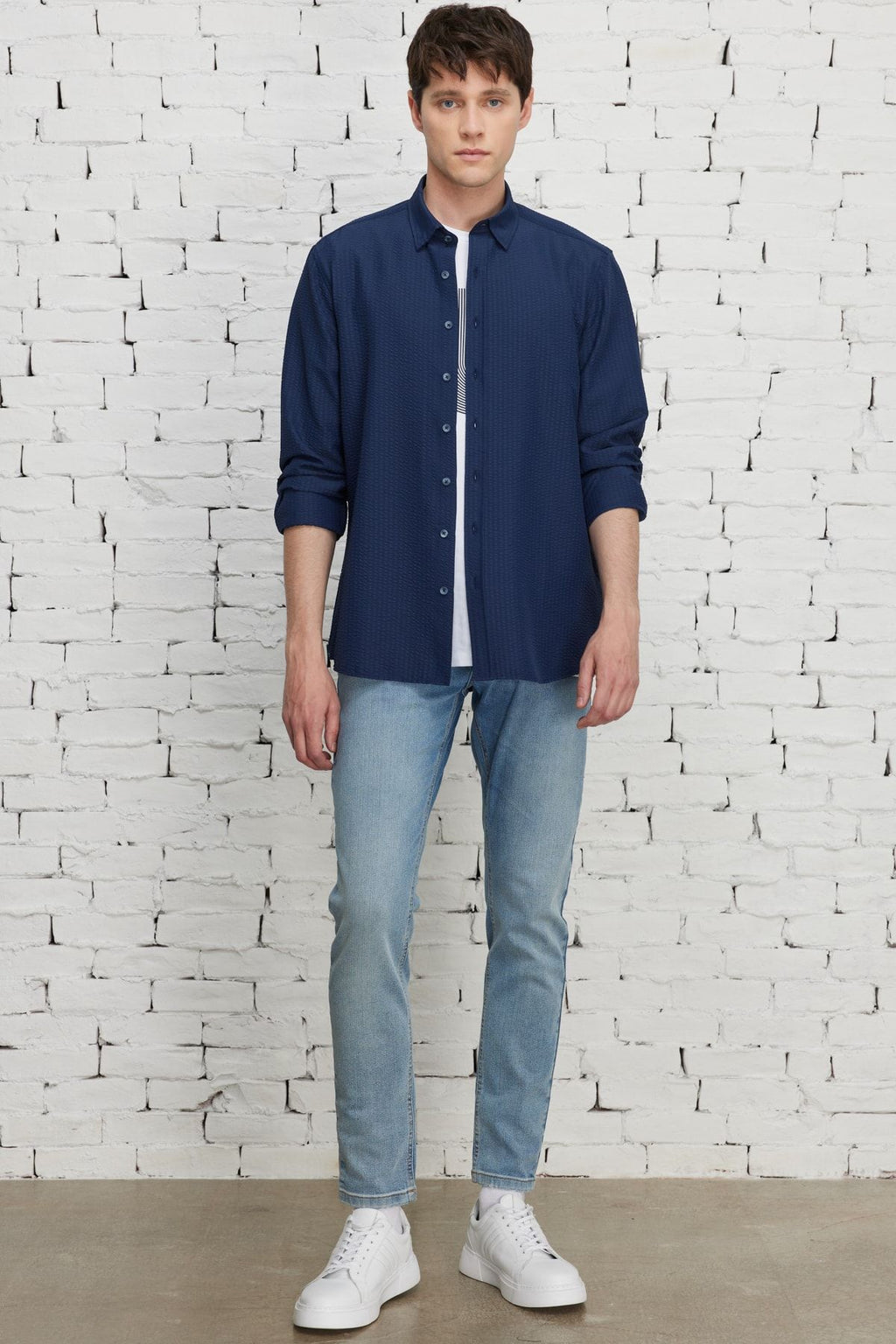 Men's navy blue ironing easy slim fit narrow cut button collar wafer patterned shirt