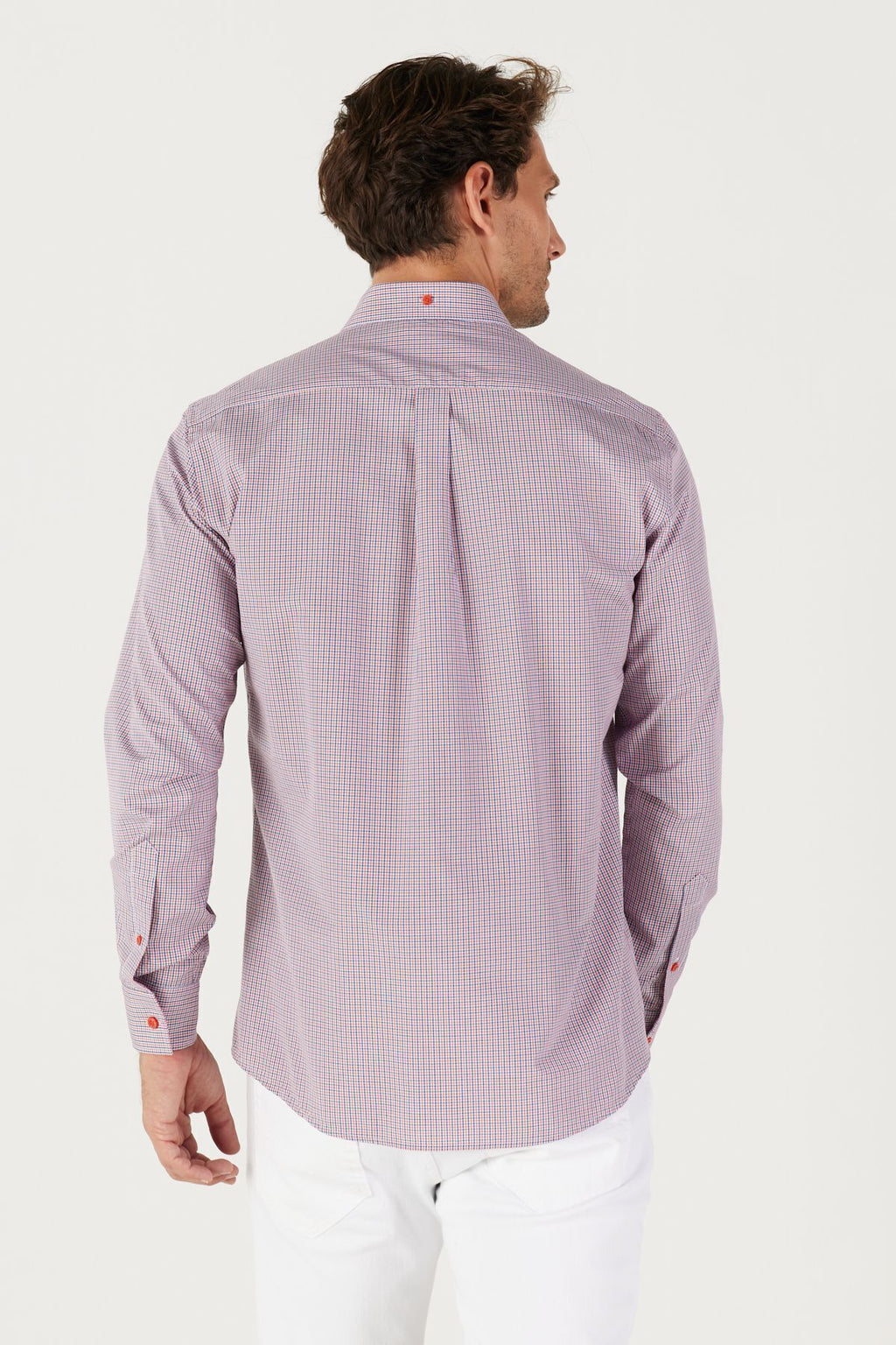Men's navy blue-red slim fit narrow cut buttoned collar logo cotton pocket striped shirt