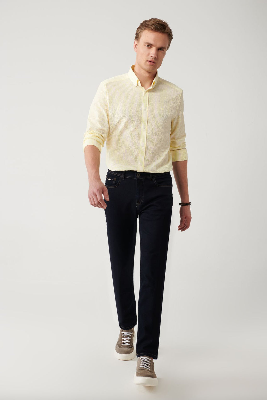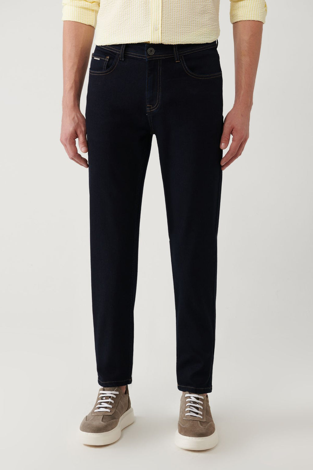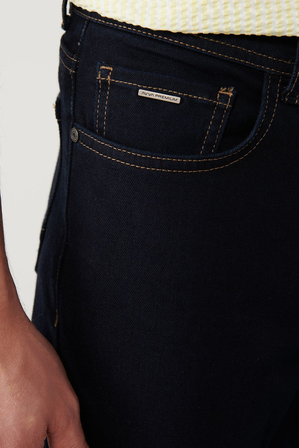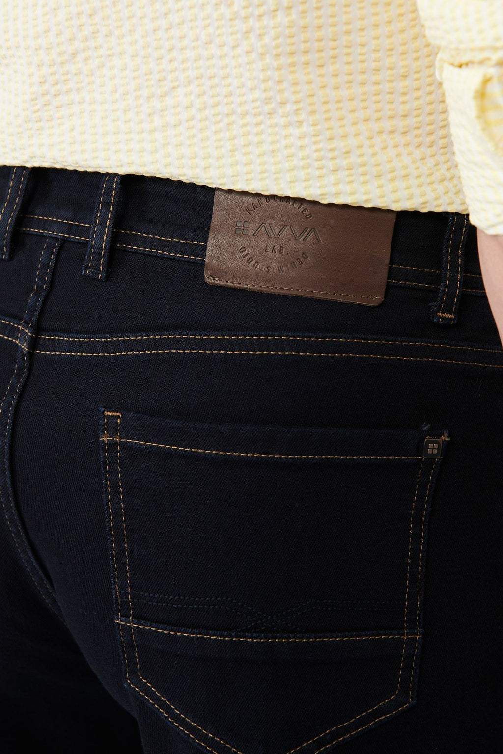 Men's navy blue rinse washed tobacco stitched flexible jean pants A41y3511