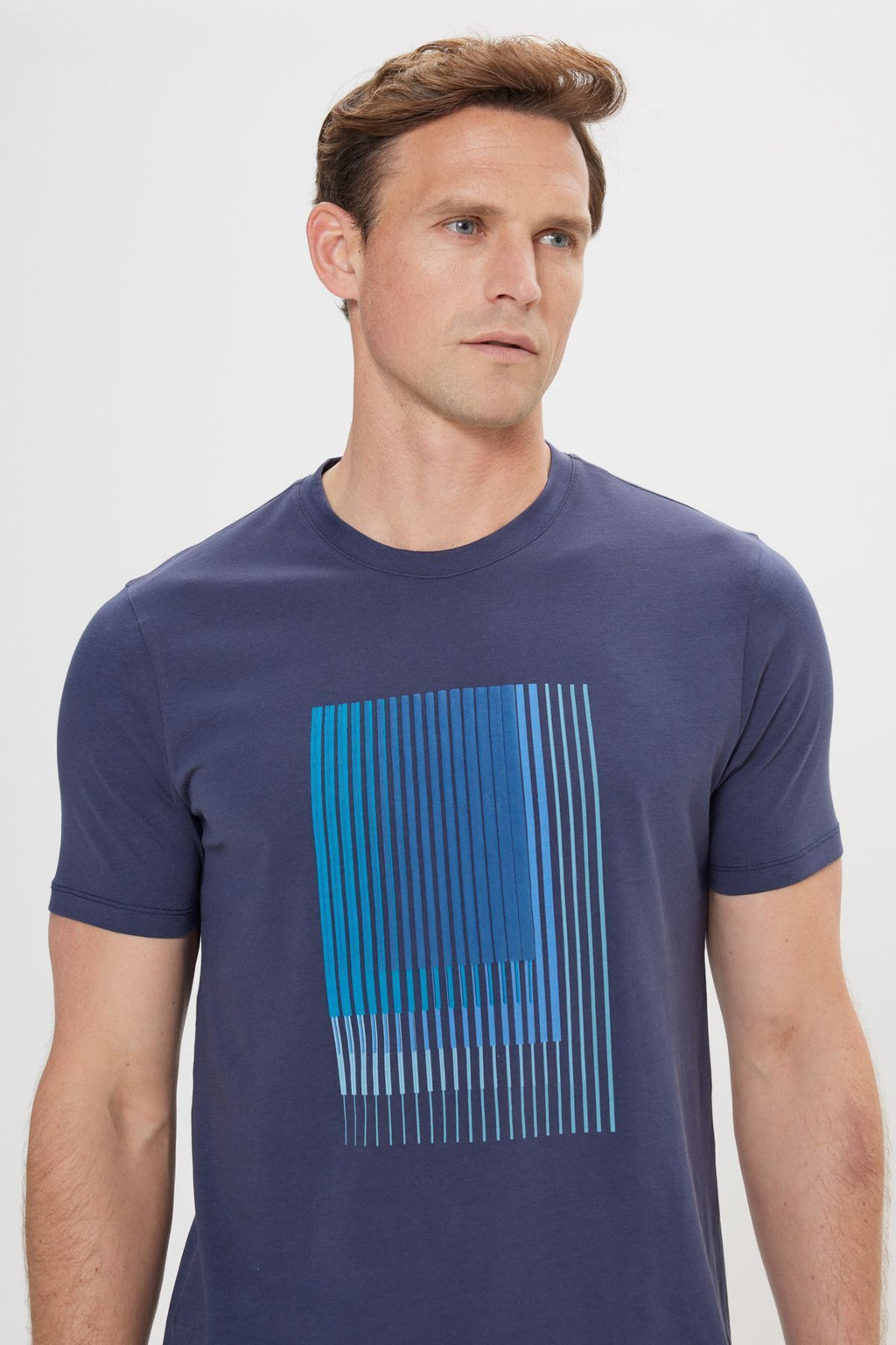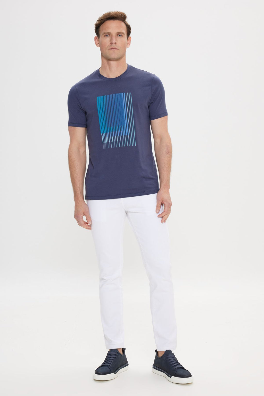 Men's navy blue slim fit narrow cut cotton printed bicycle collar t -shirt