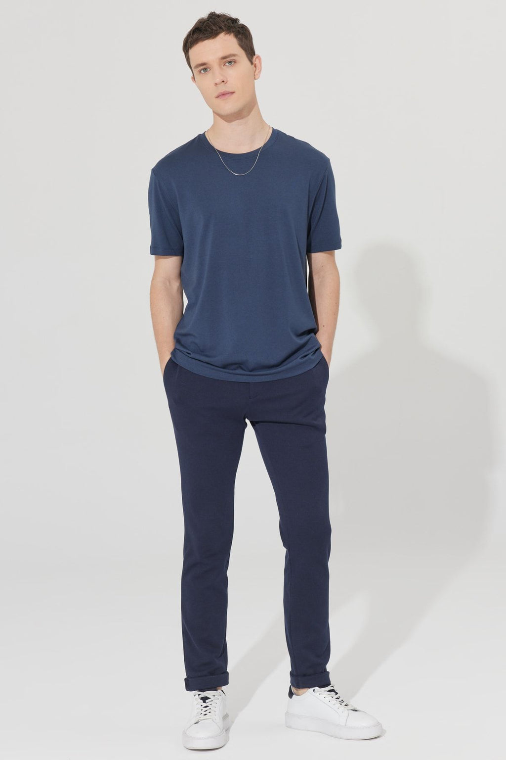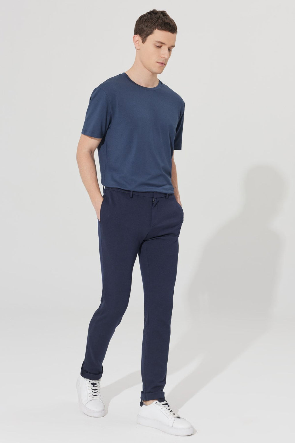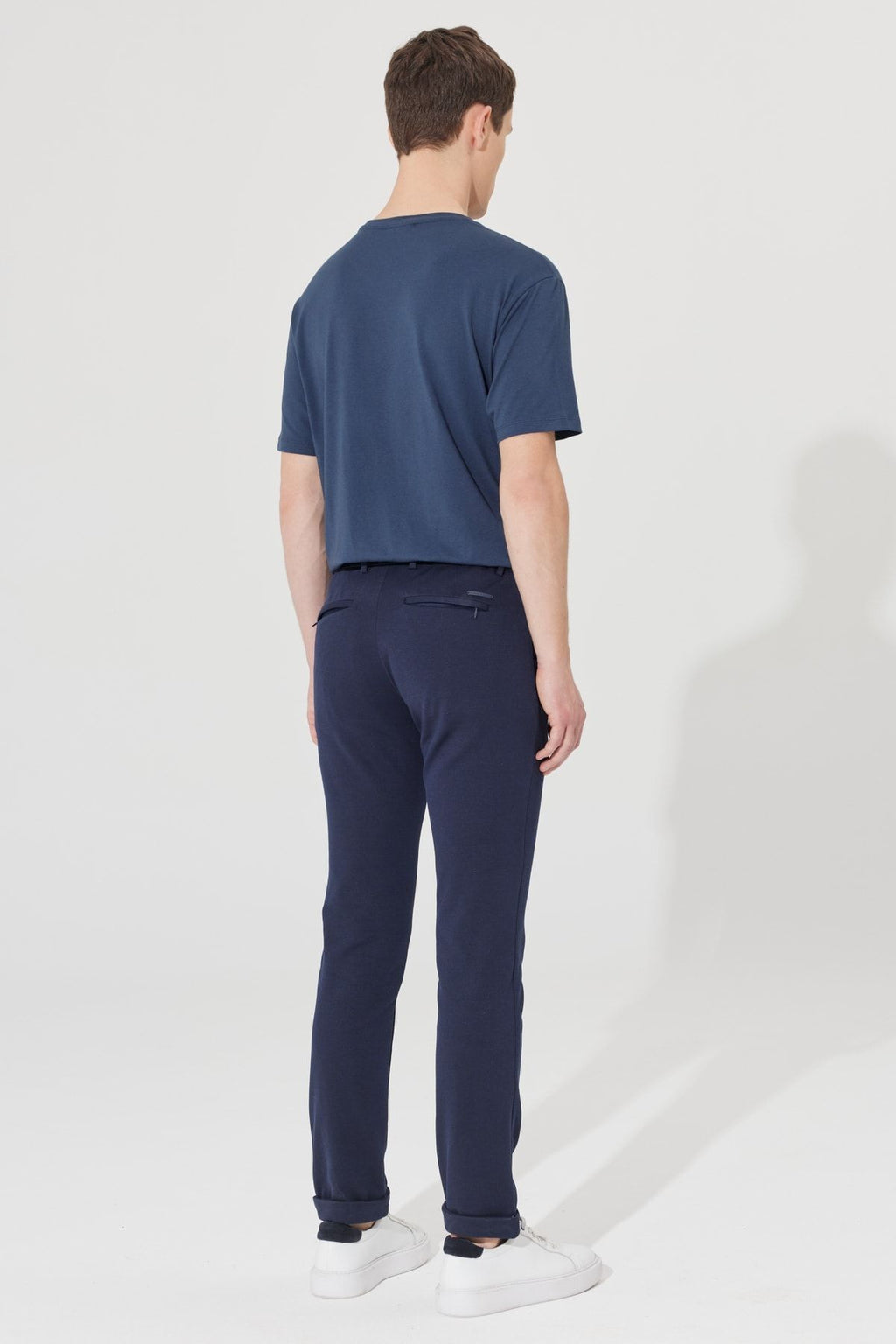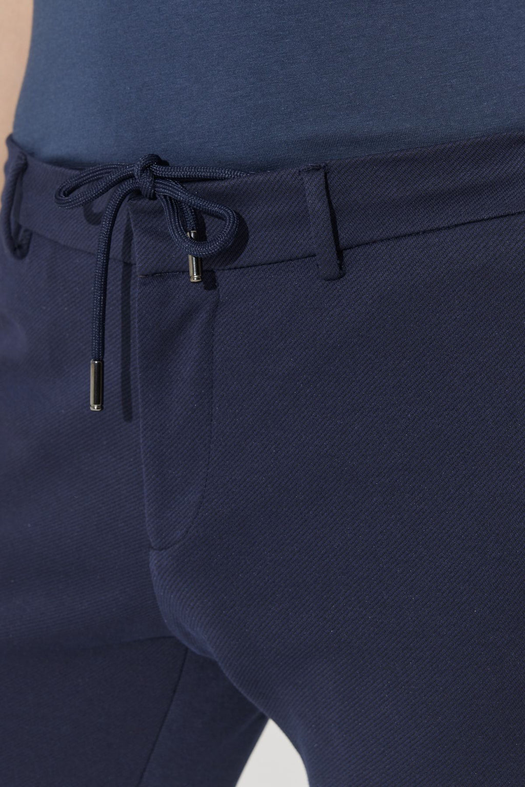 Men's navy blue slim fit narrow cut diagonal patterned flexible waist tied jogger pants