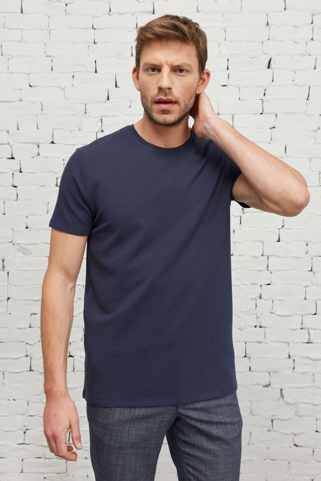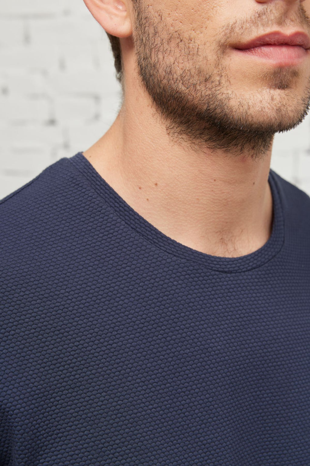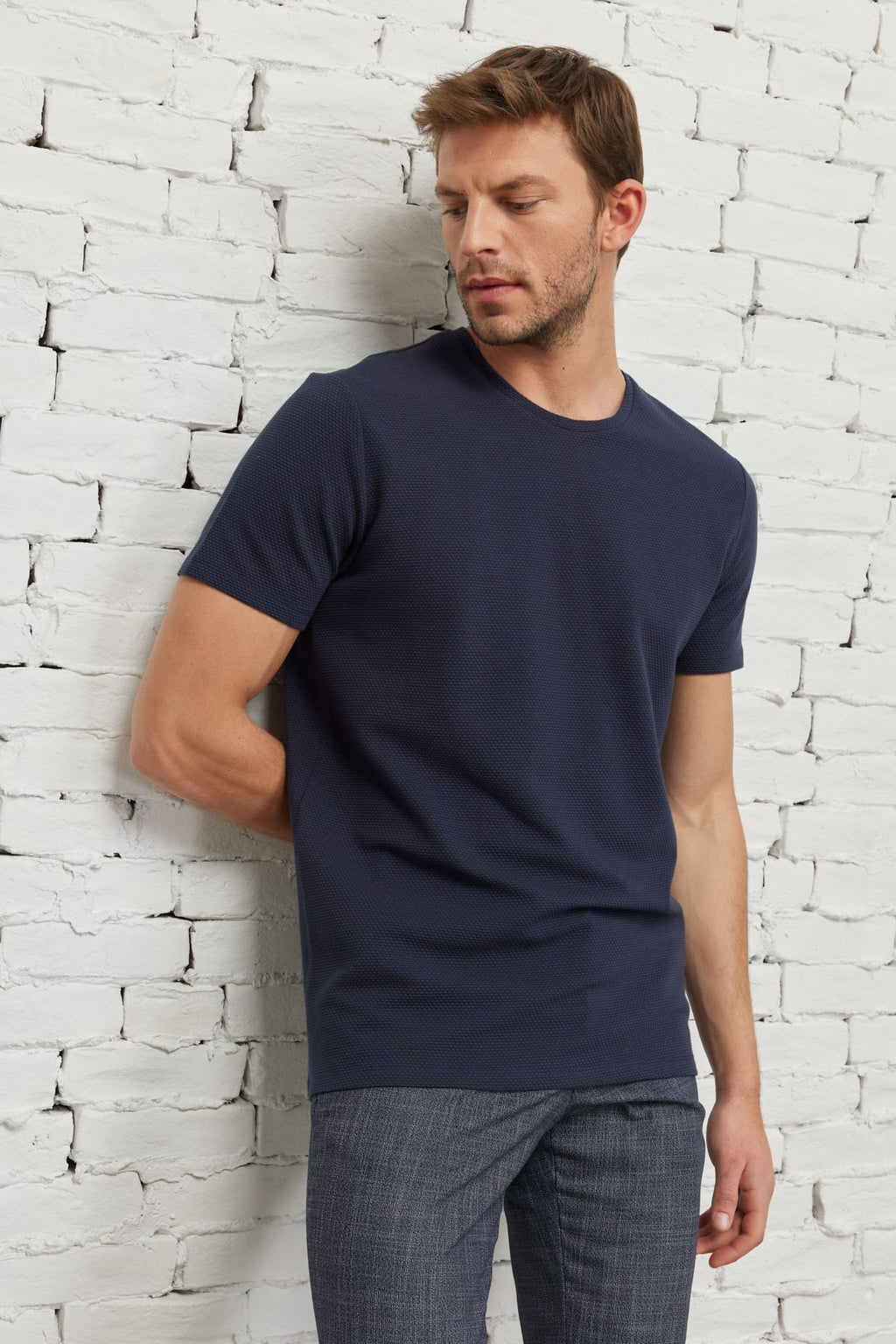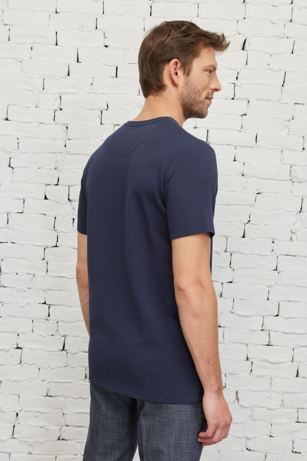 Men's navy blue slim fit narrow cut modal bike collar soft button flexible basic t -shirt