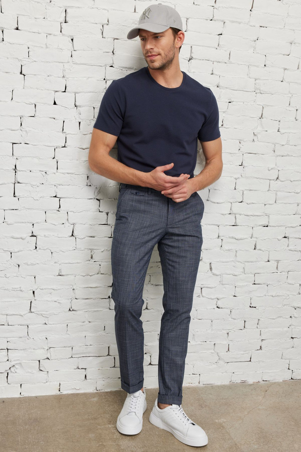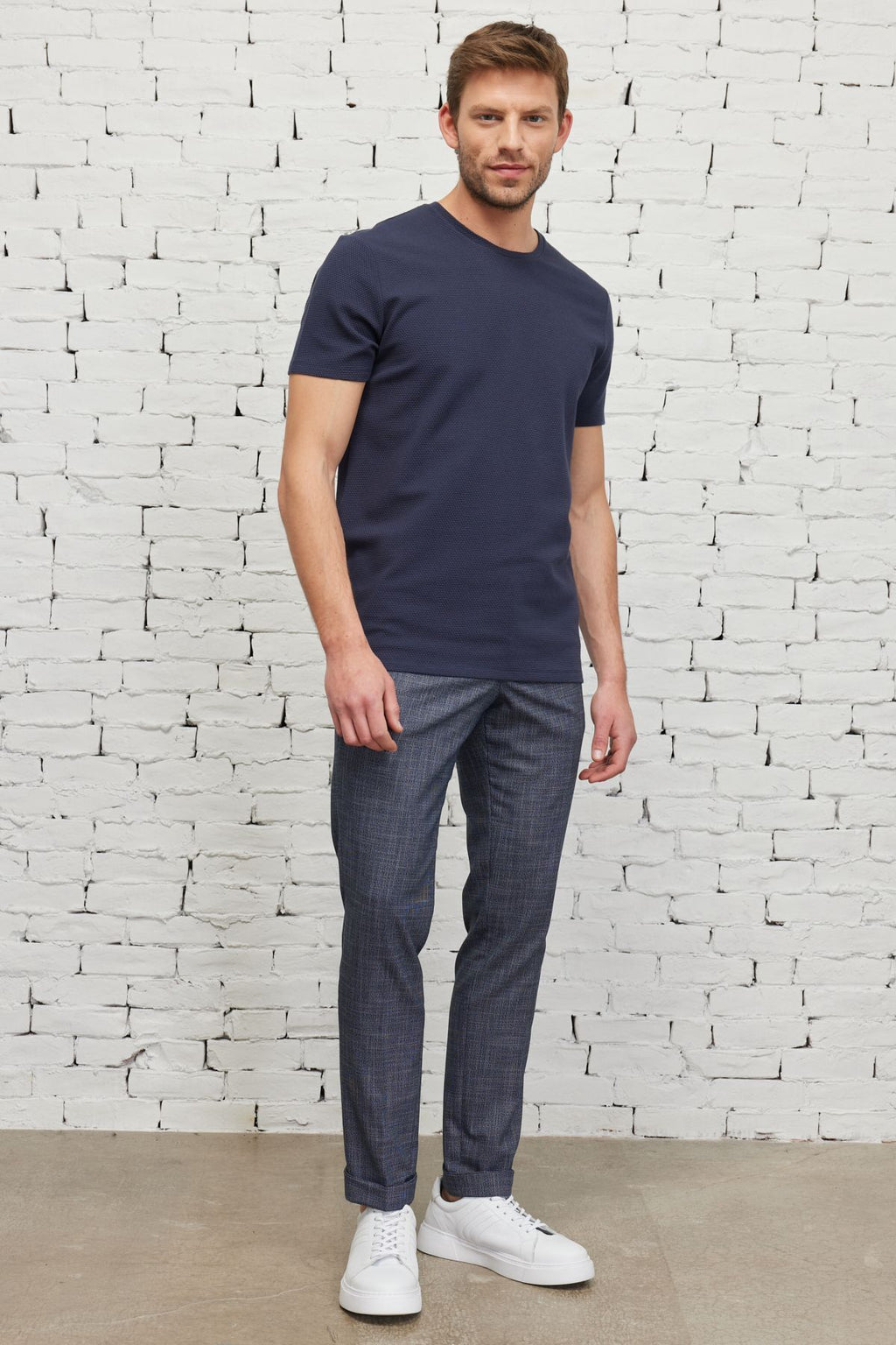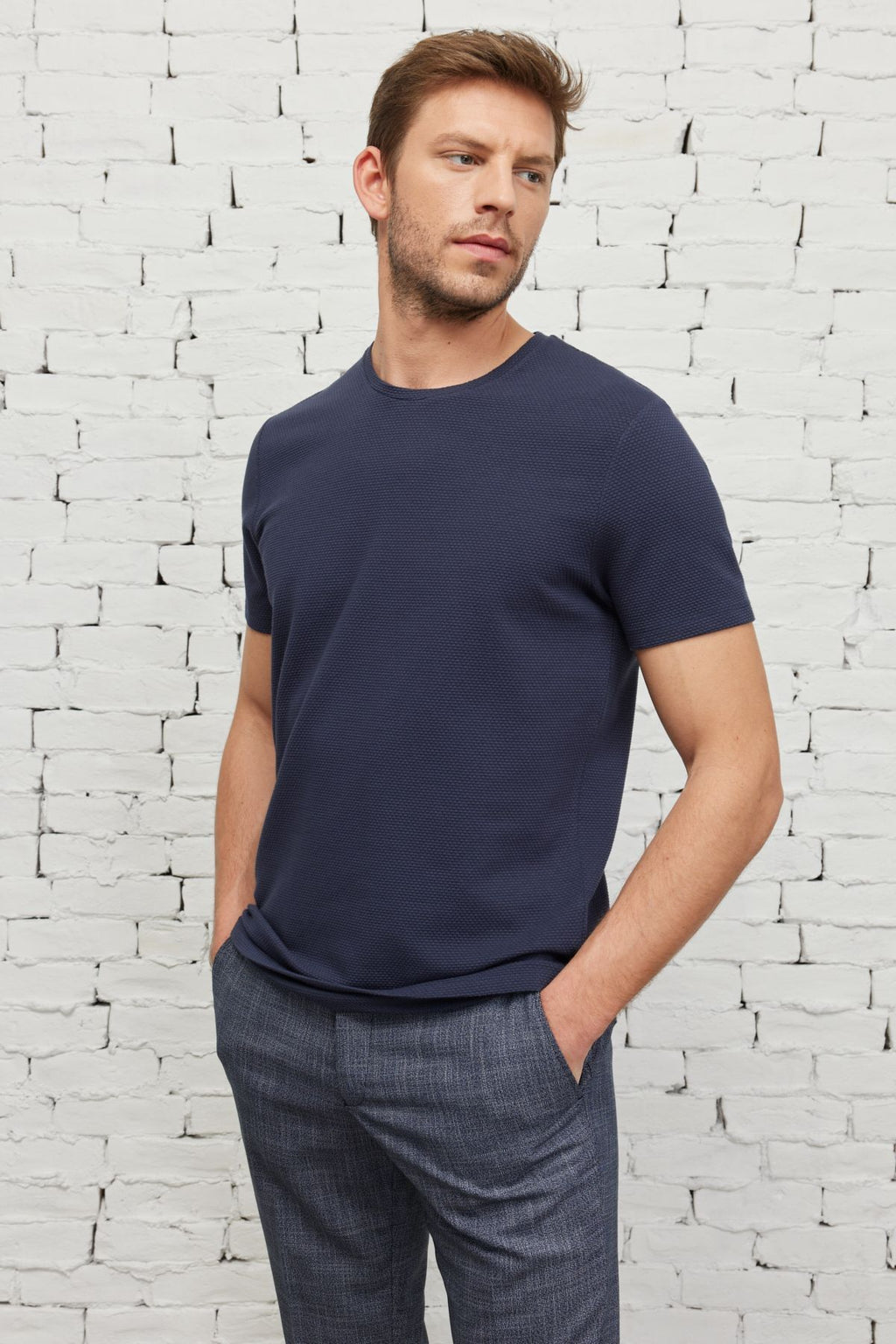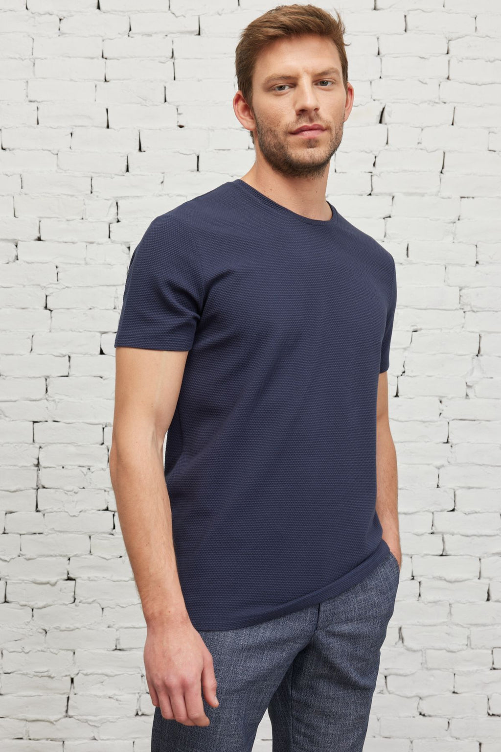 Men's navy blue slim fit narrow cut modal bike collar soft button flexible basic t -shirt