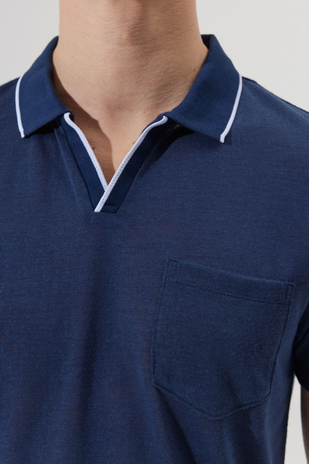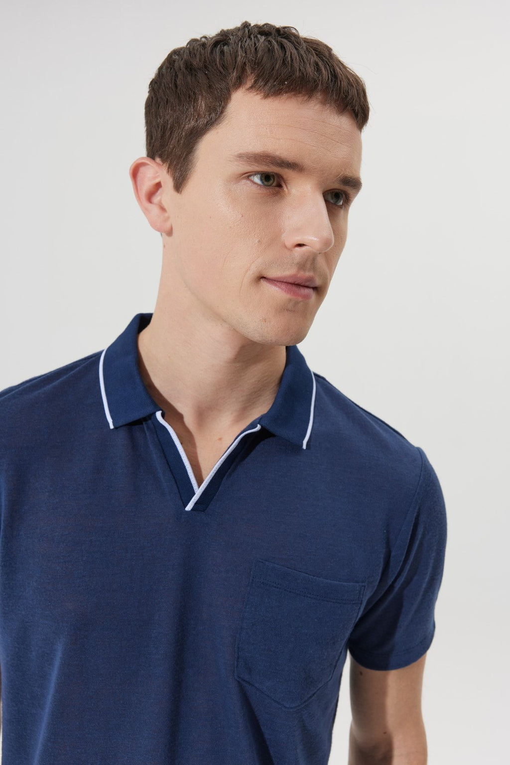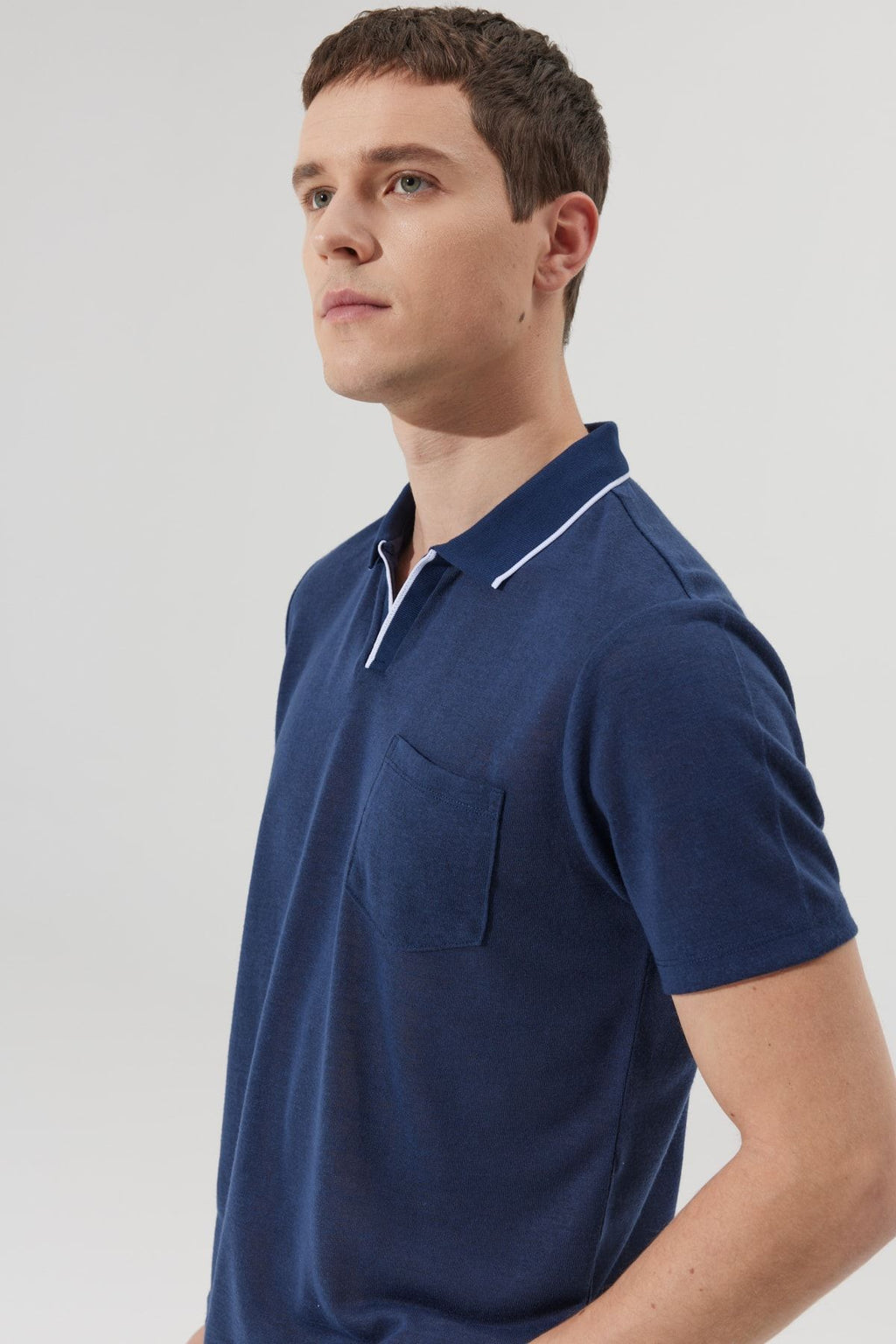 Men's navy blue slim fit narrow cut polo collar with short sleeve linen -looking T -shirt
