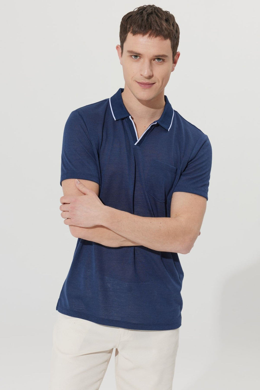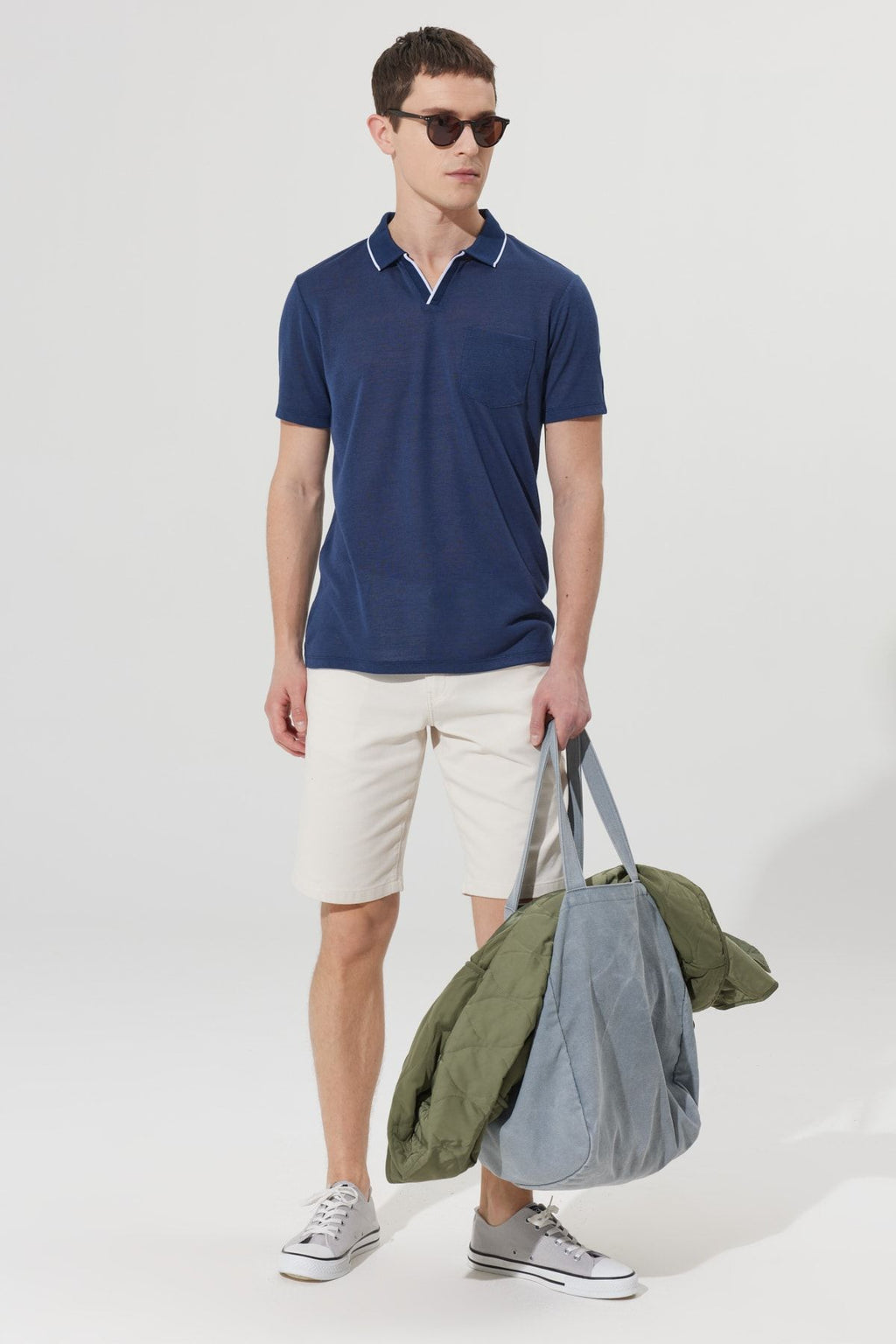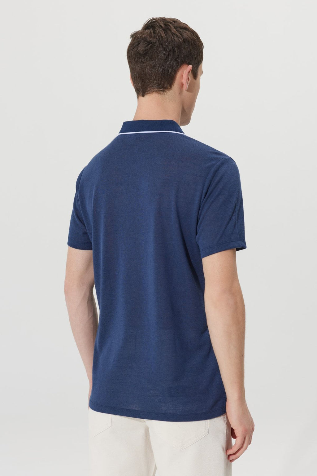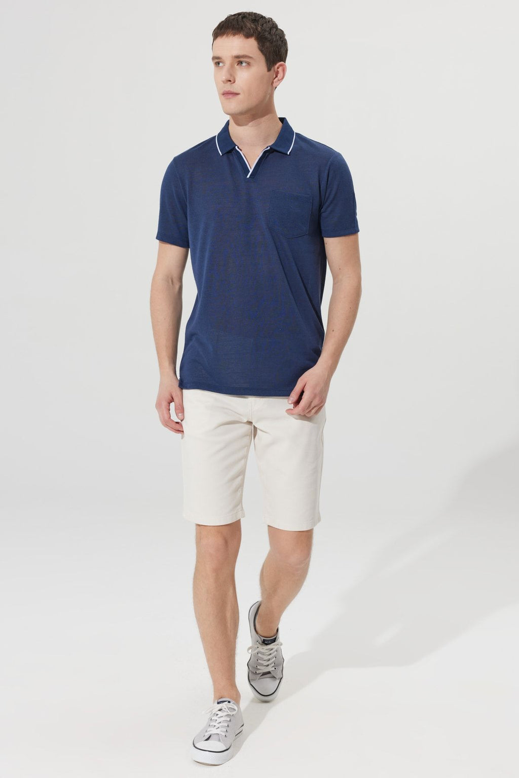 Men's navy blue slim fit narrow cut polo collar with short sleeve linen -looking T -shirt