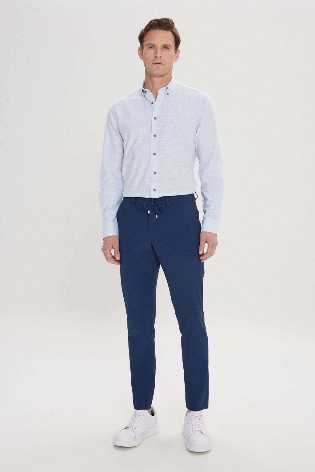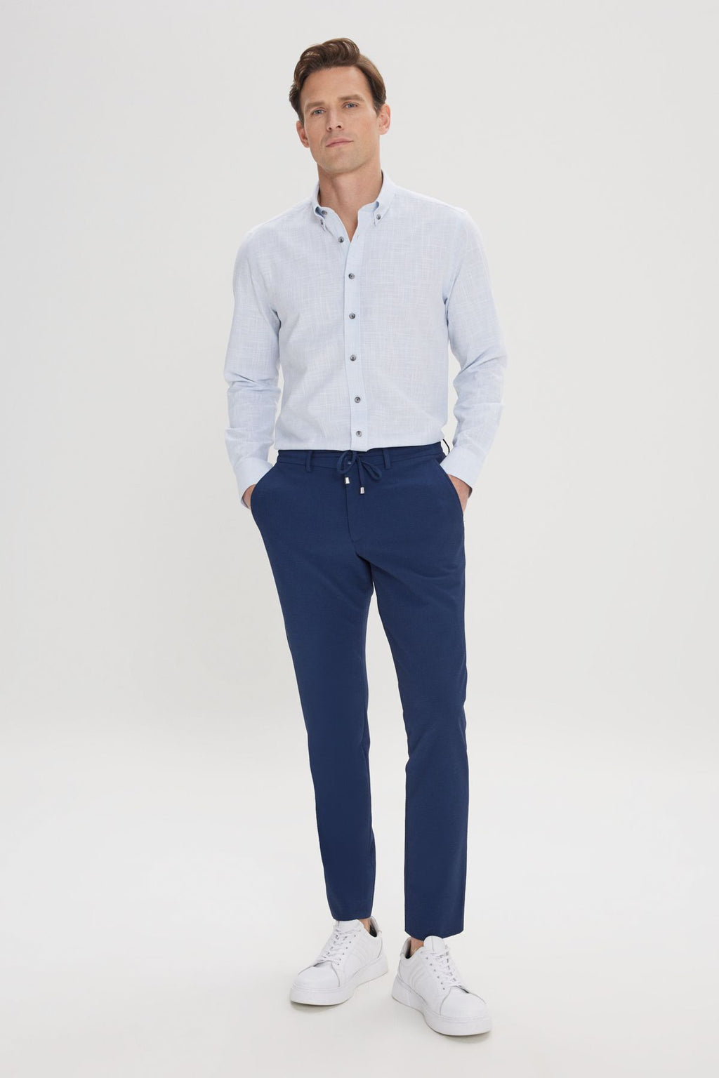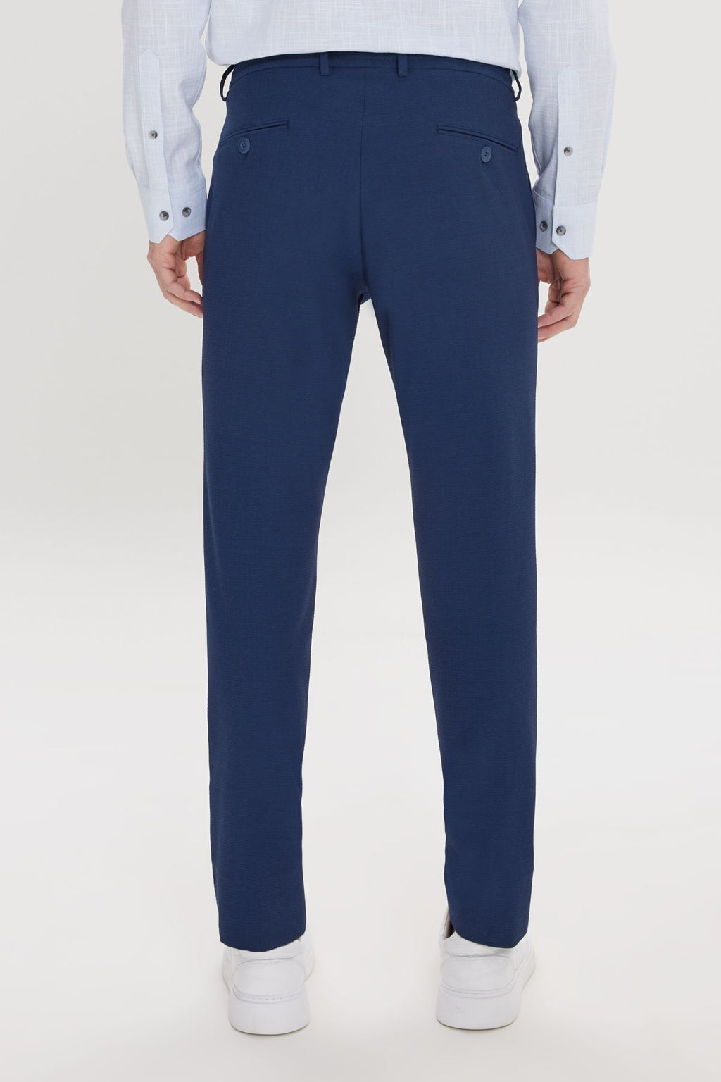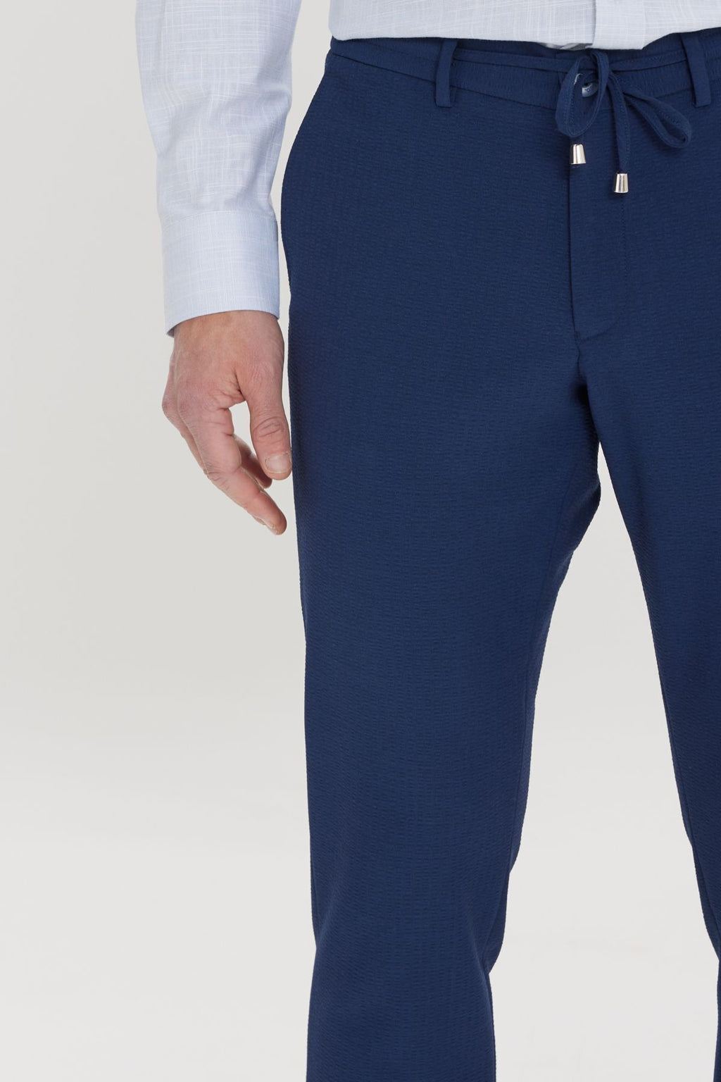 Men's navy blue slim fit narrow cut waist tied side mobile wafer patterned pants