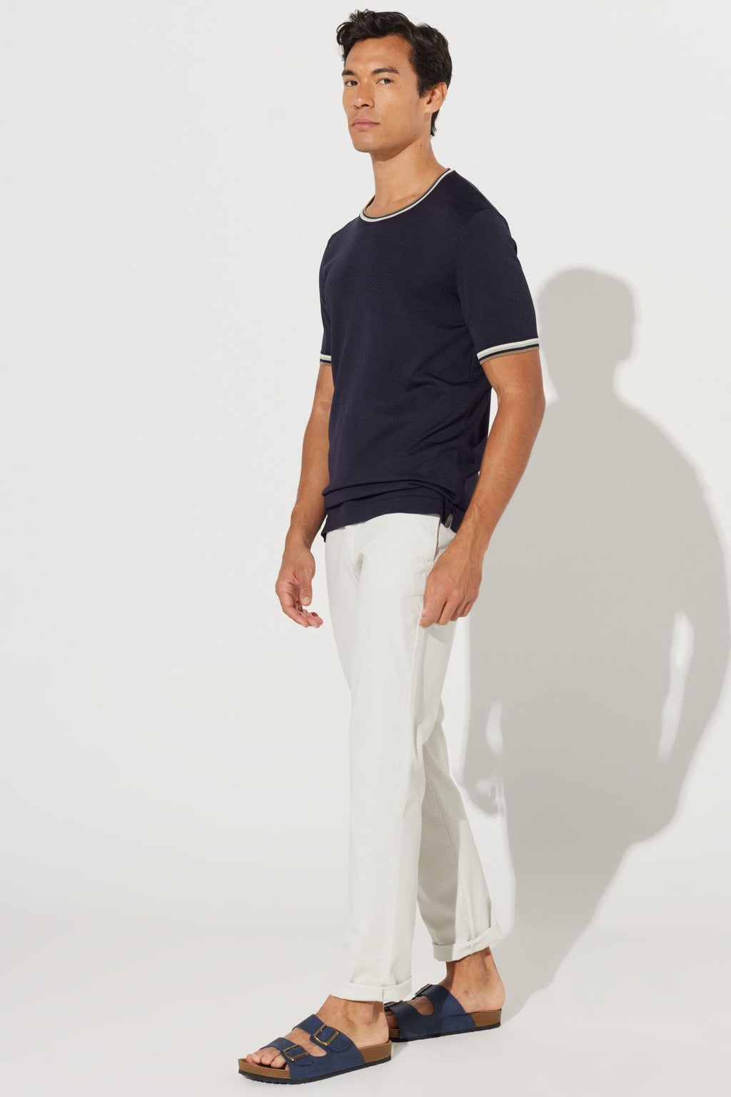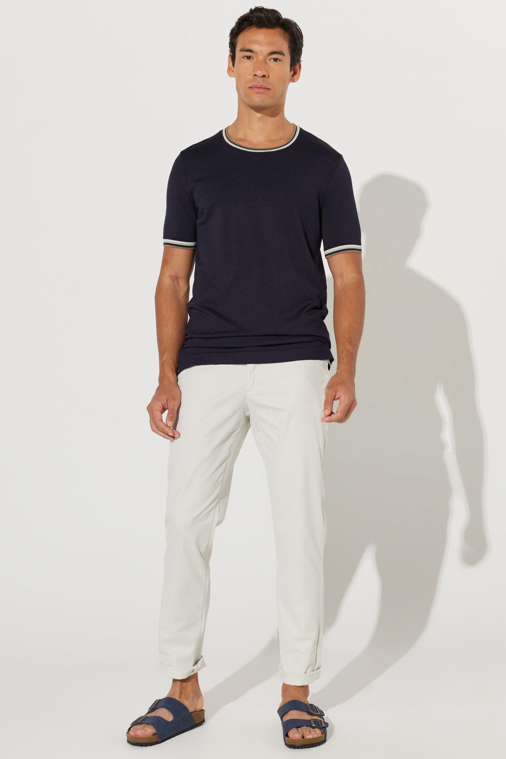 Men's navy blue standard fit normal cut bike collar 100 %cotton striped knitwear T -shirt