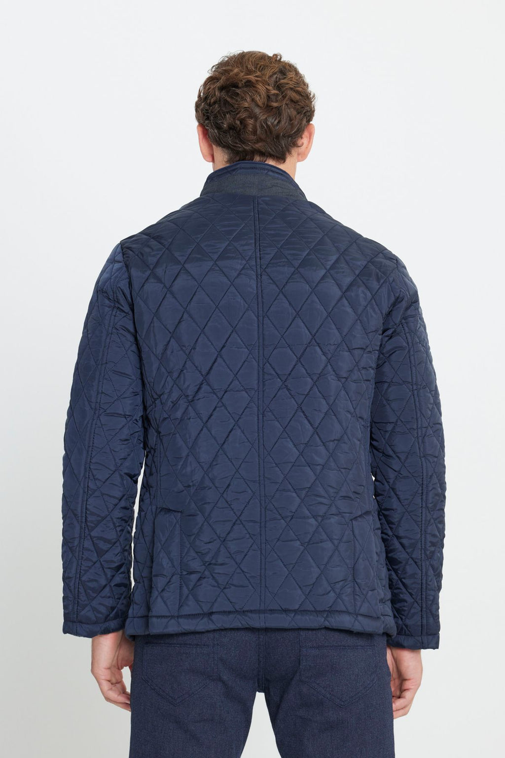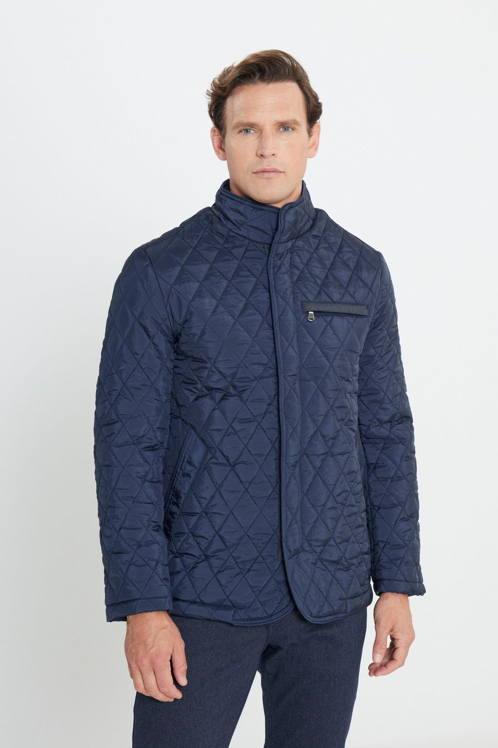 Men's navy blue standard fit normal cut upright collar pattern overcoat
