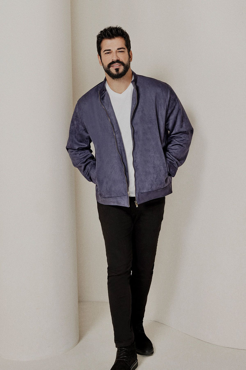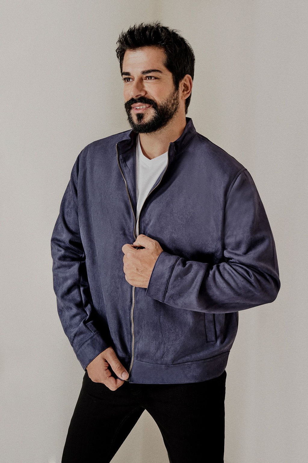 Men's navy blue standard fit normal cut upright collar suede jacket coat